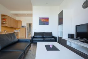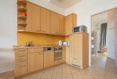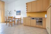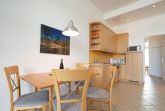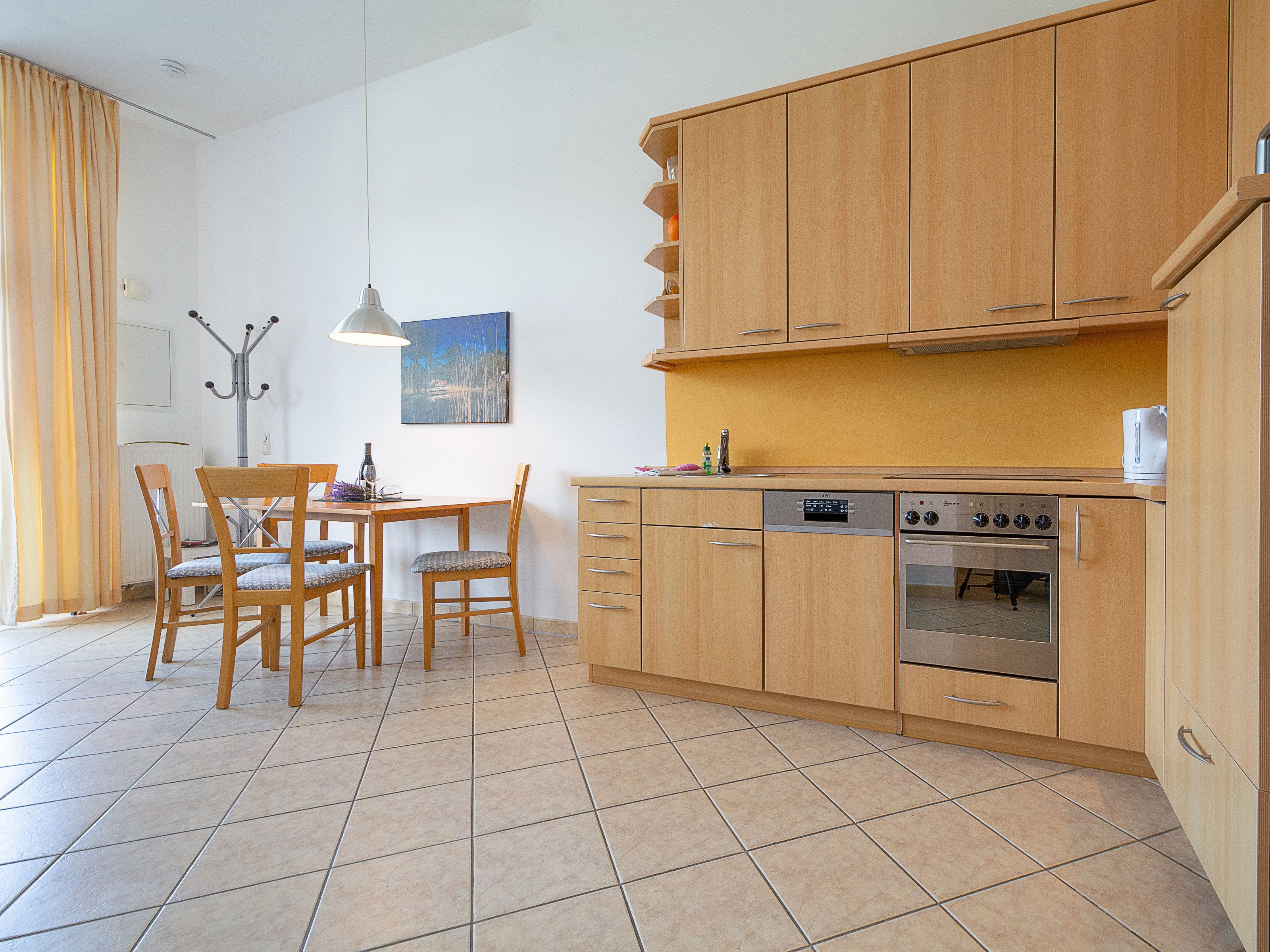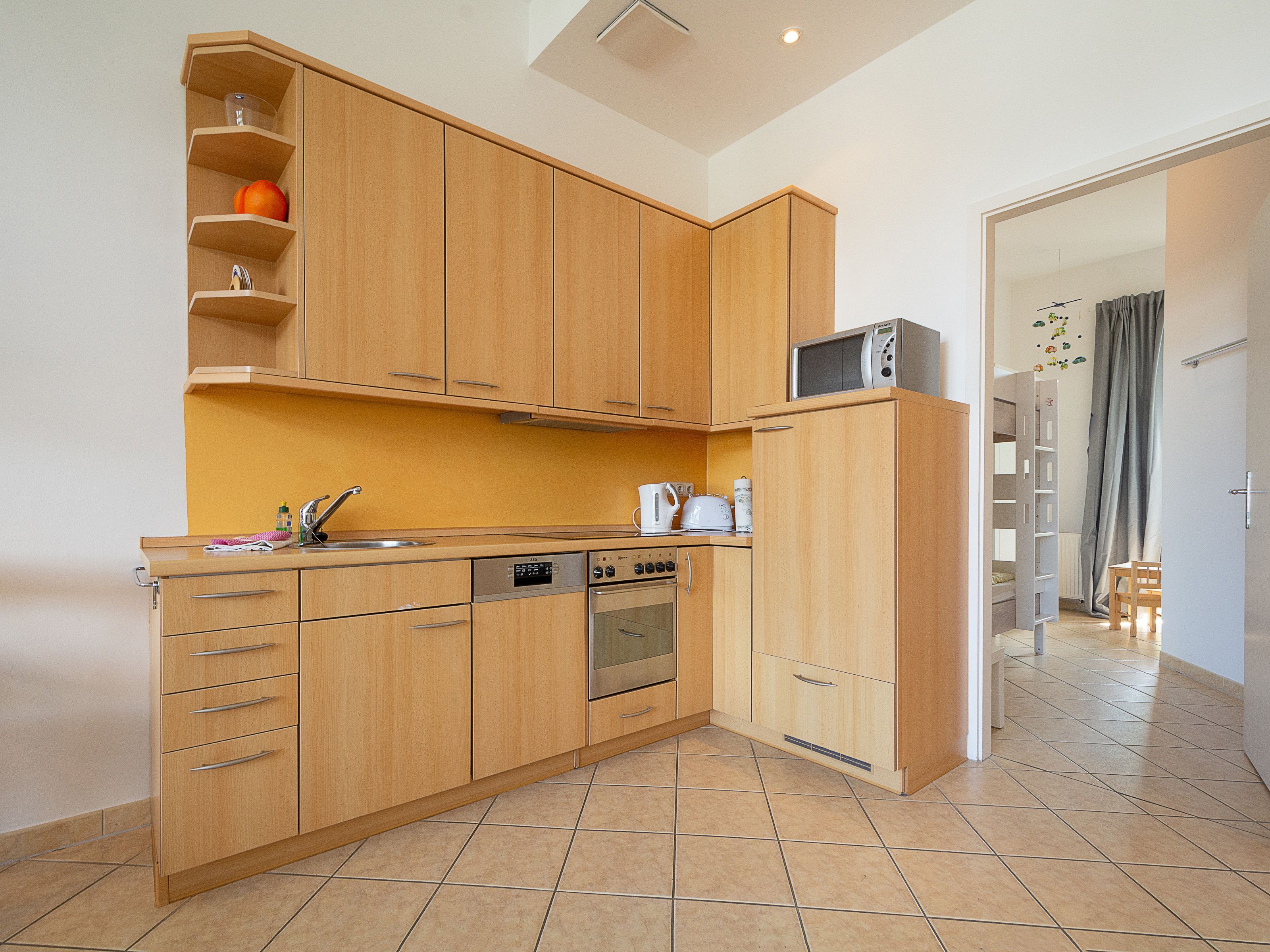 Die angrenzende offene Küchenzeile ist mit einem 4-Zonen-Ceranfeld sowie Herd mit Backofen, Geschirrspüler, Mikrowelle und Kühlschrank voll ausgestattet. Die Küchenausstattung wird komplettiert durch einen Toaster, eine Kaffeemaschine und einen Wasserkocher.