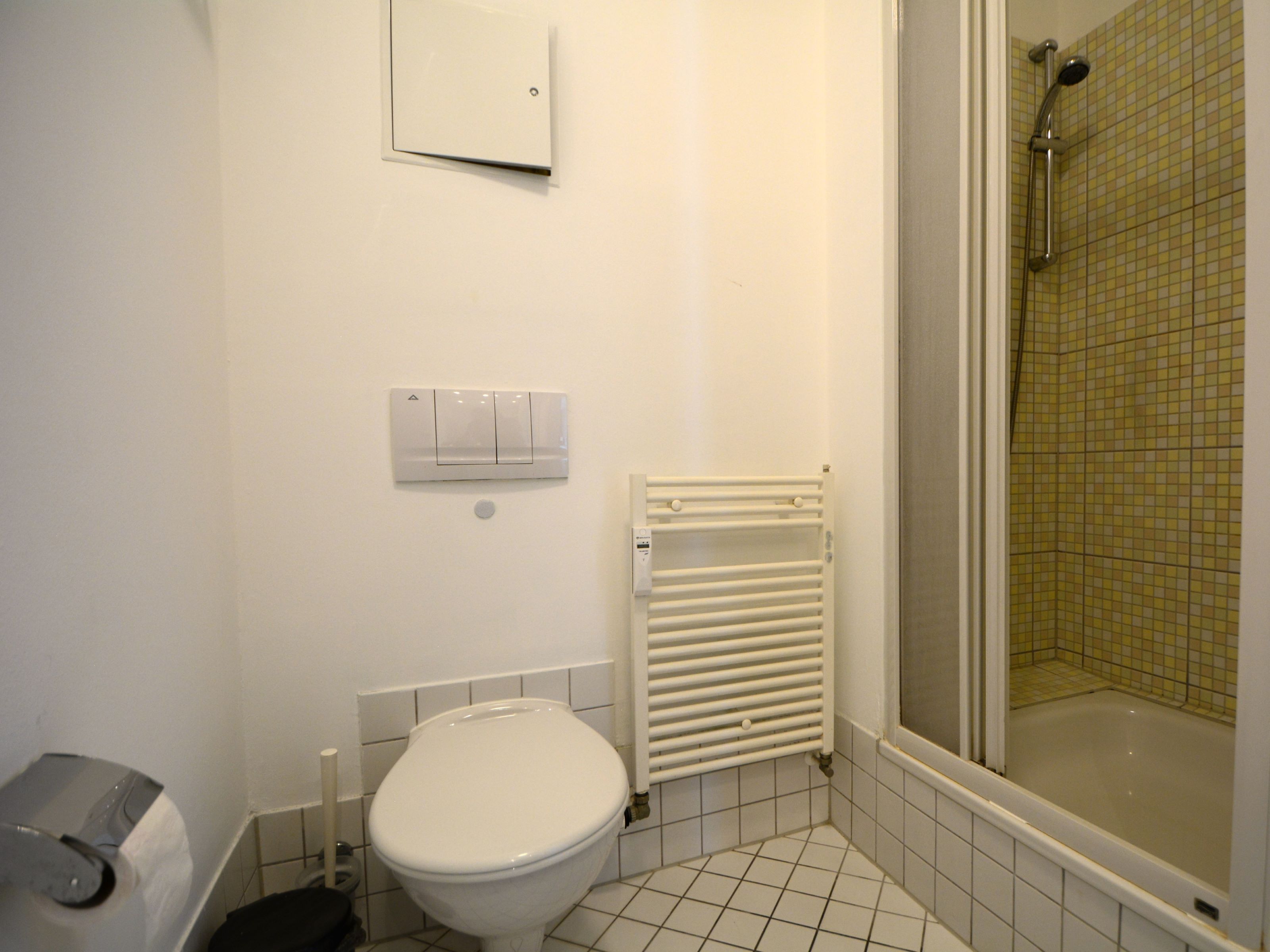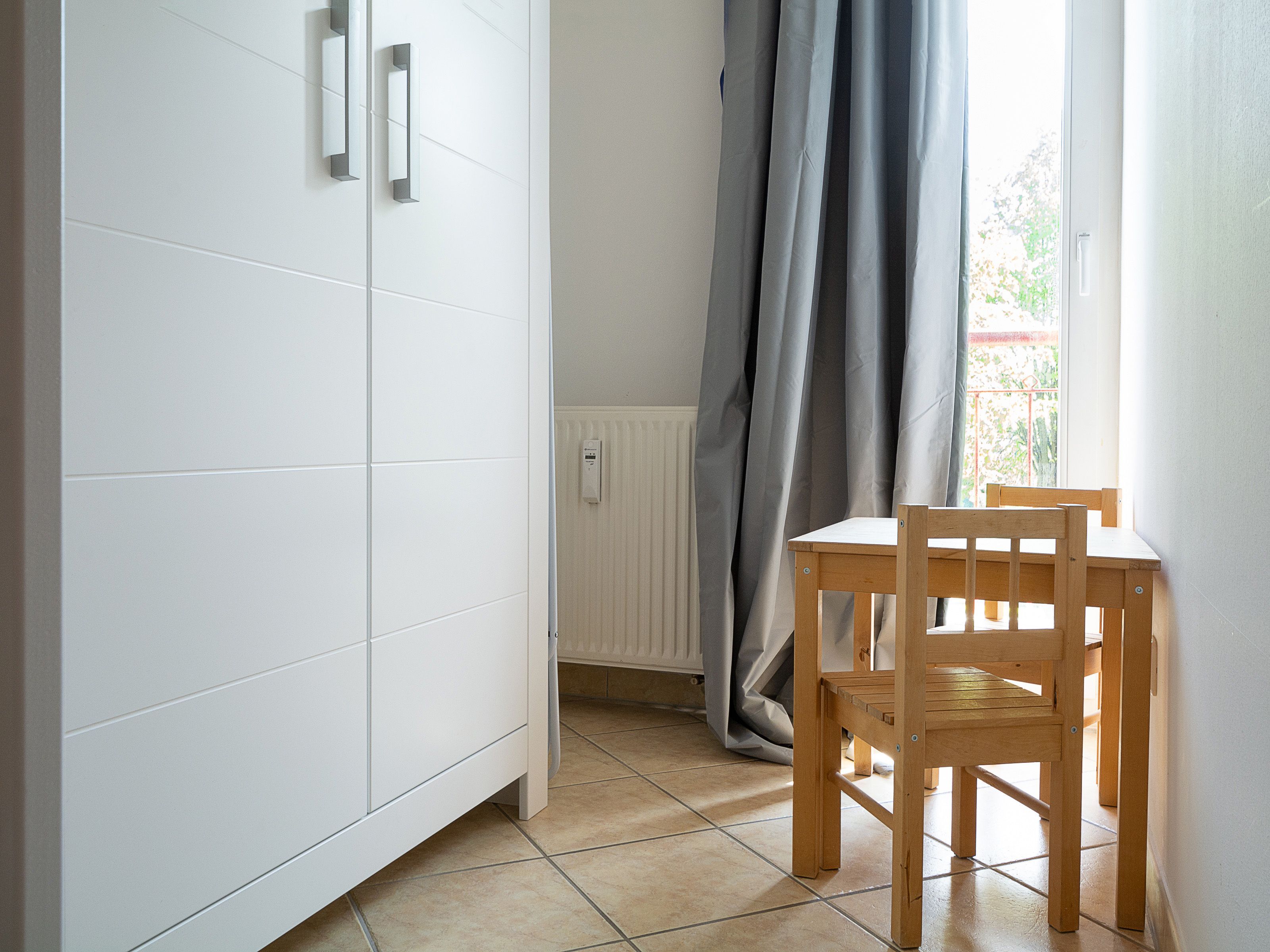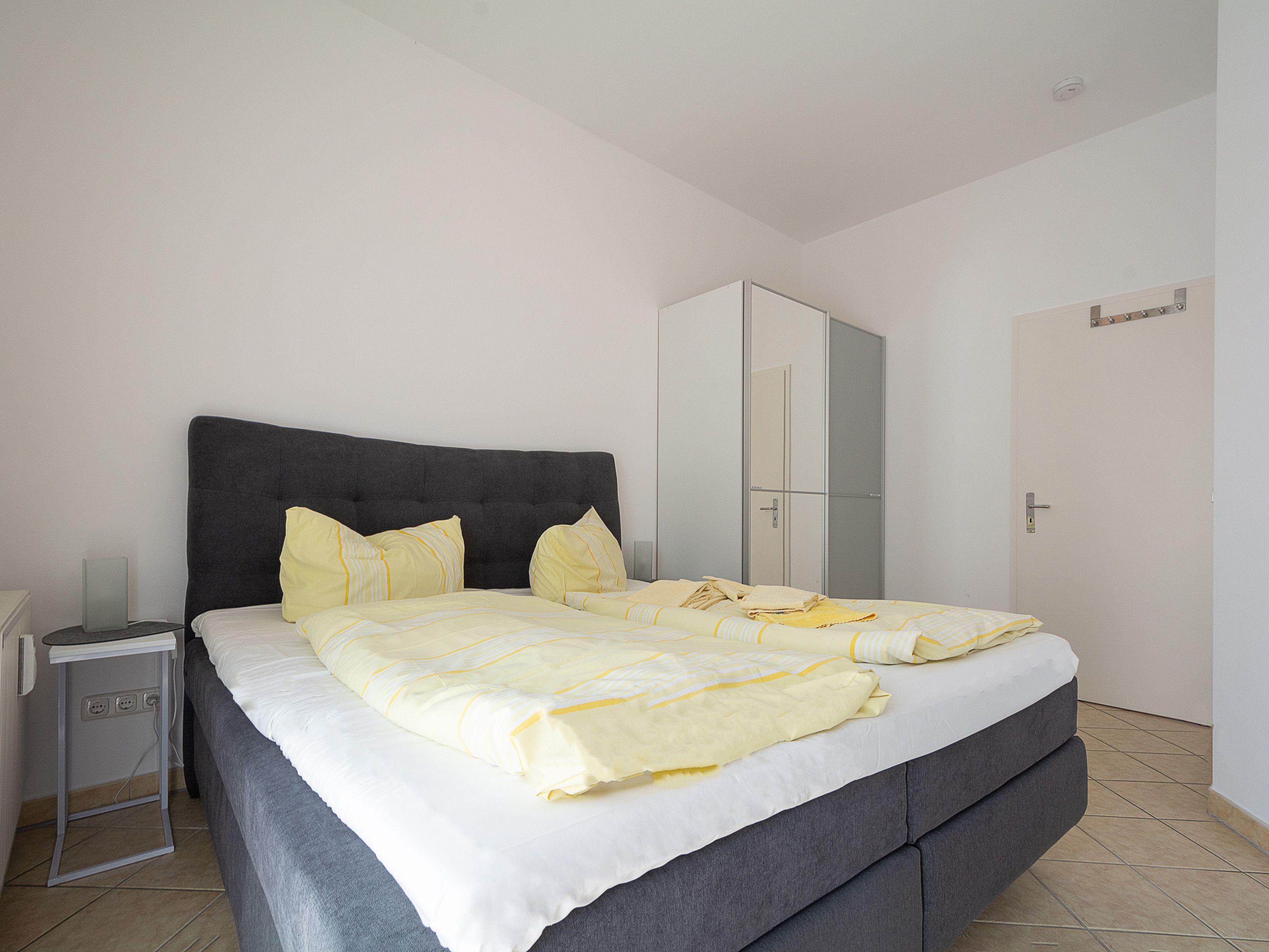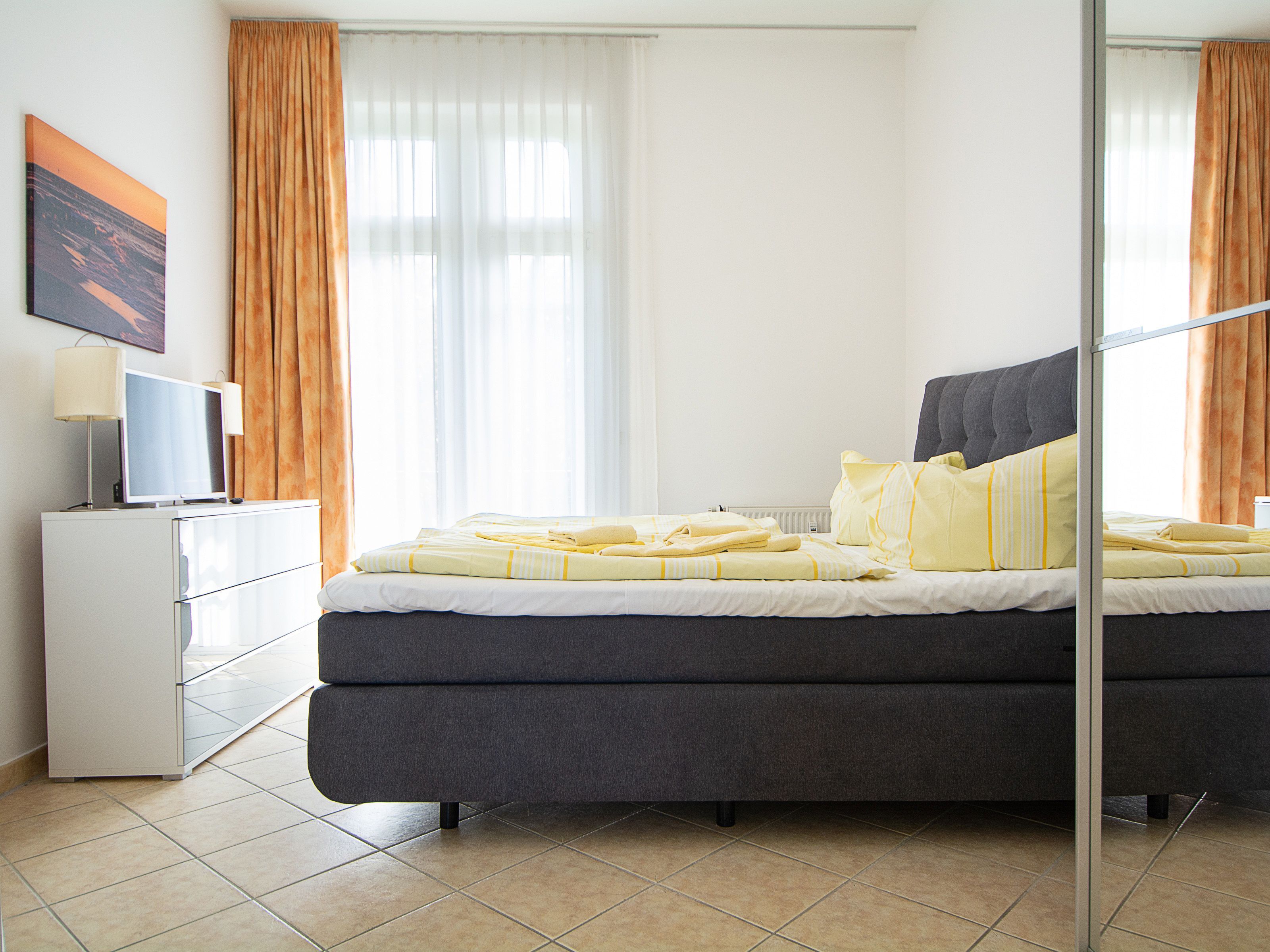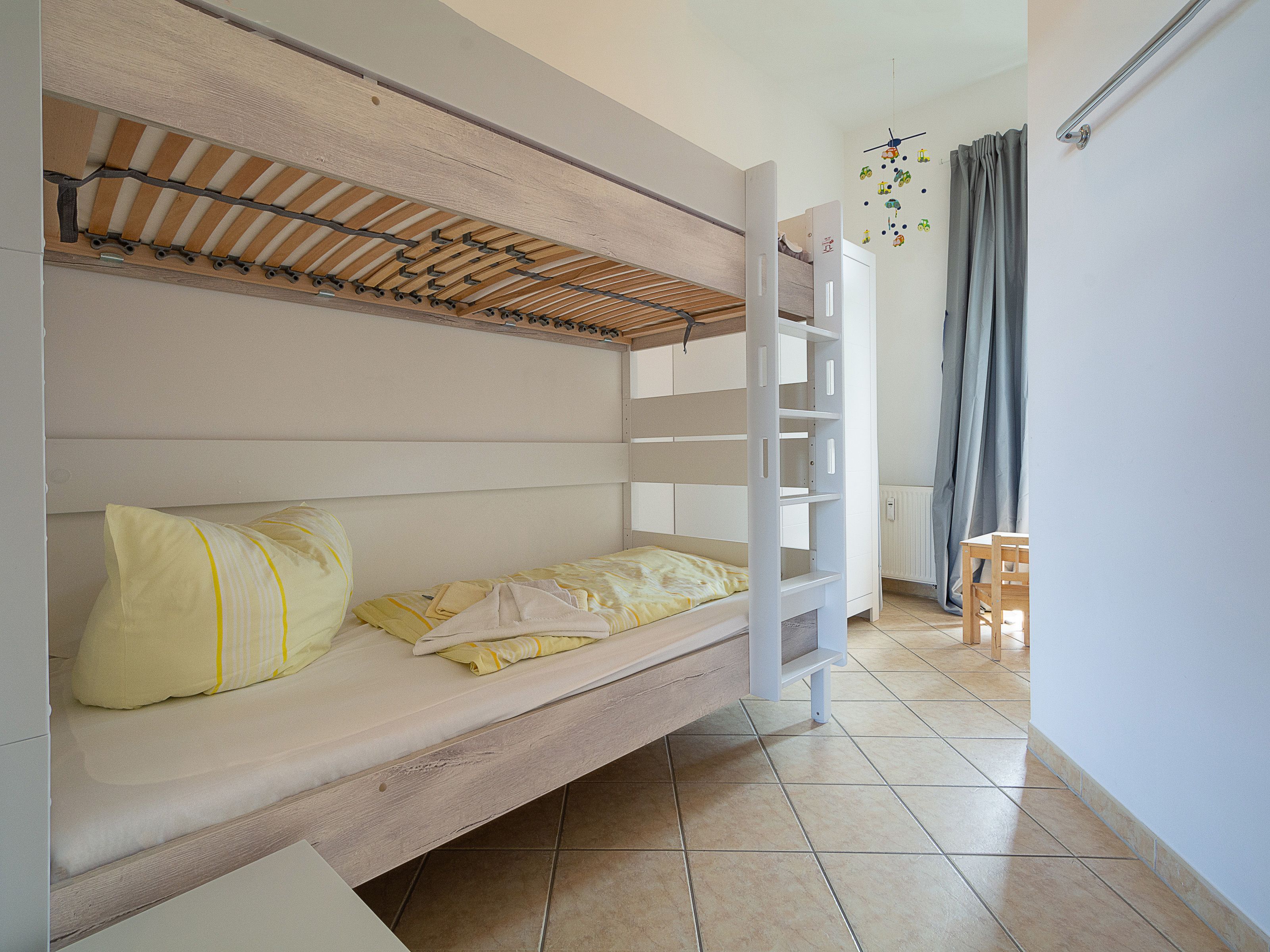 Ein Schlafzimmer mit Doppelbett und TV-Gerät und ein Schlafzimmer mit Etagenbett sowie das Bad mit Dusche und WC vervollständigen das Gesamtbild dieser Wohnung.