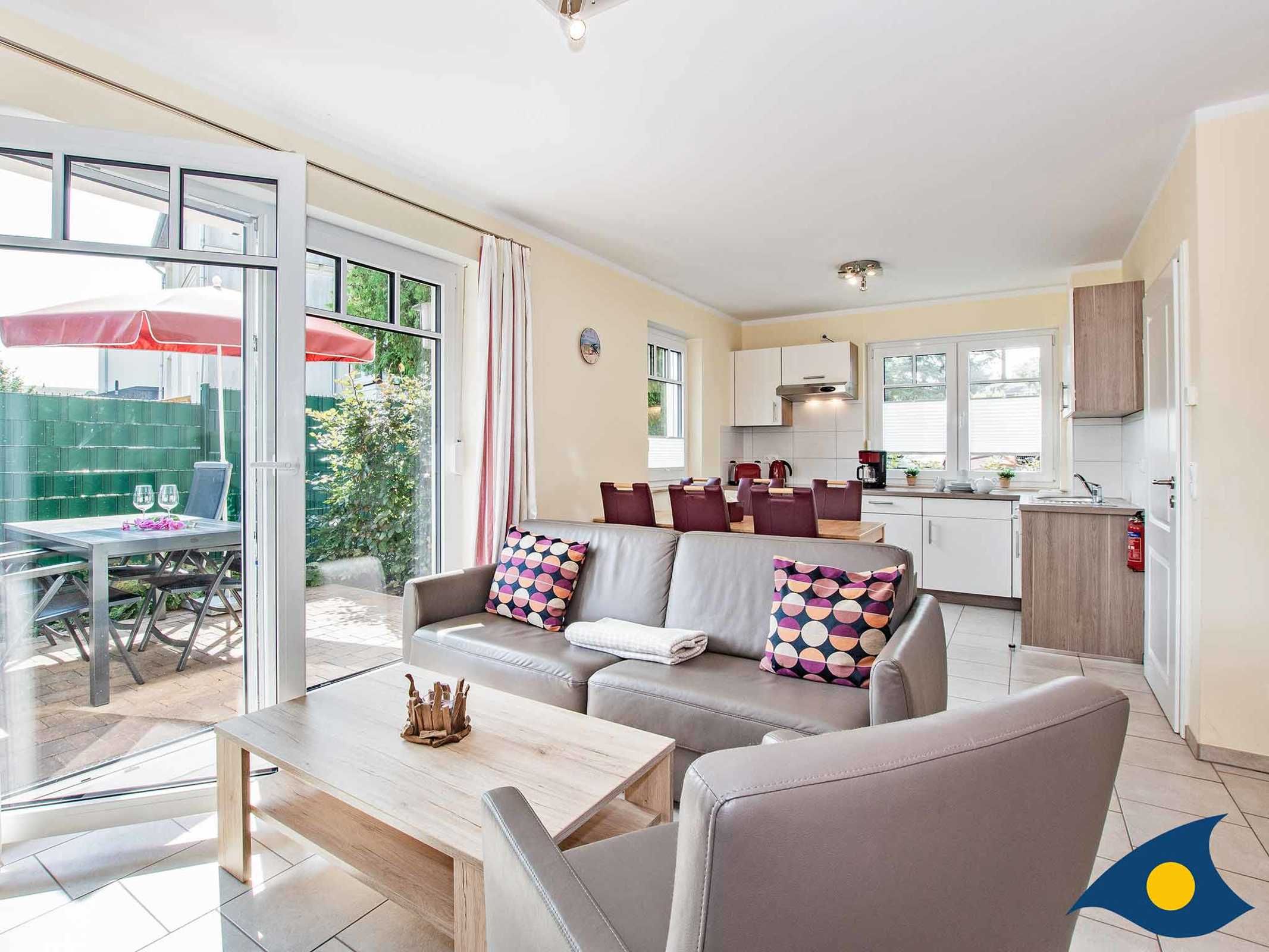 Die zur Sonnenseite ausgerichtete Terrasse mit Esstisch für 4 Personen erreichen Sie einfach vom Wohnzimmer. Hier können Sie bequem den Sonnenuntergang genießen oder in gemütlicher Runde grillen.