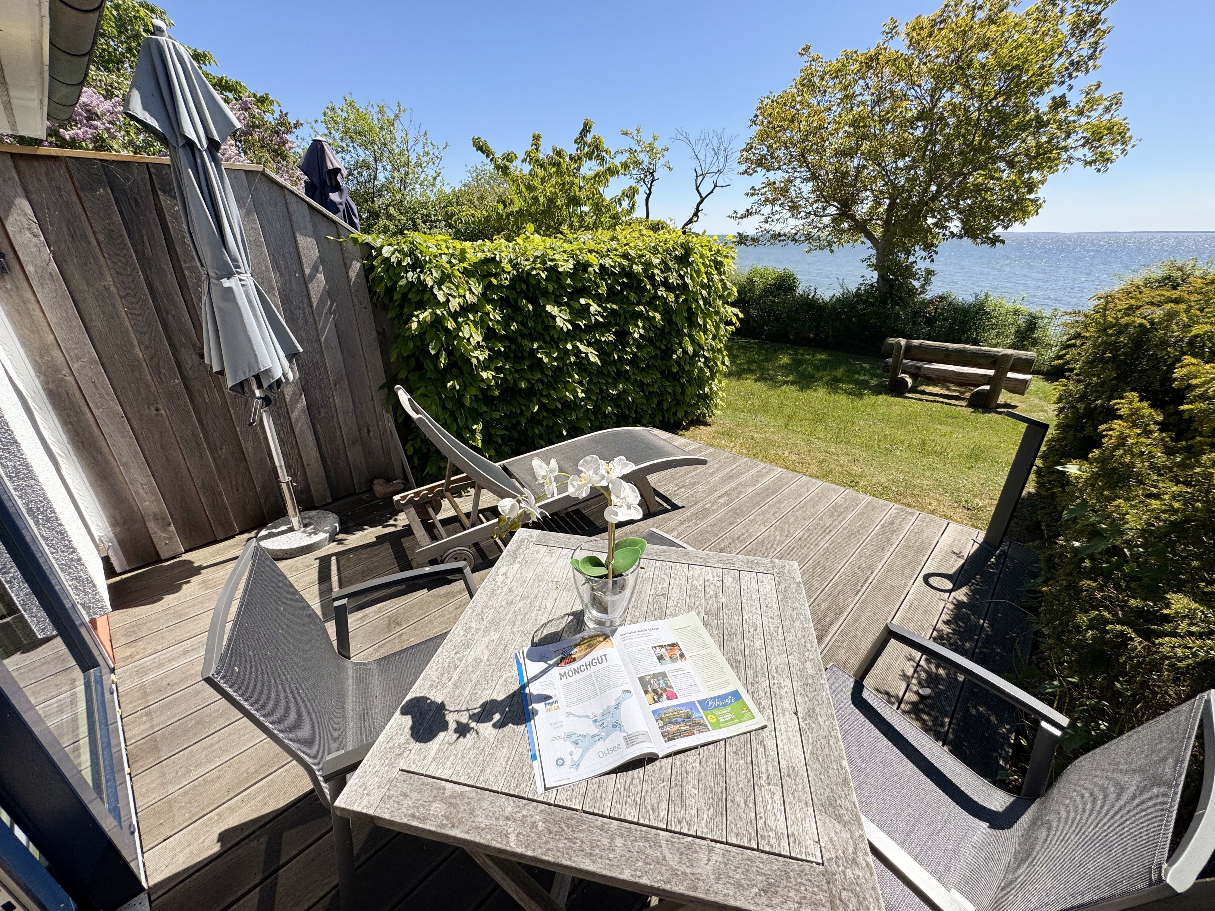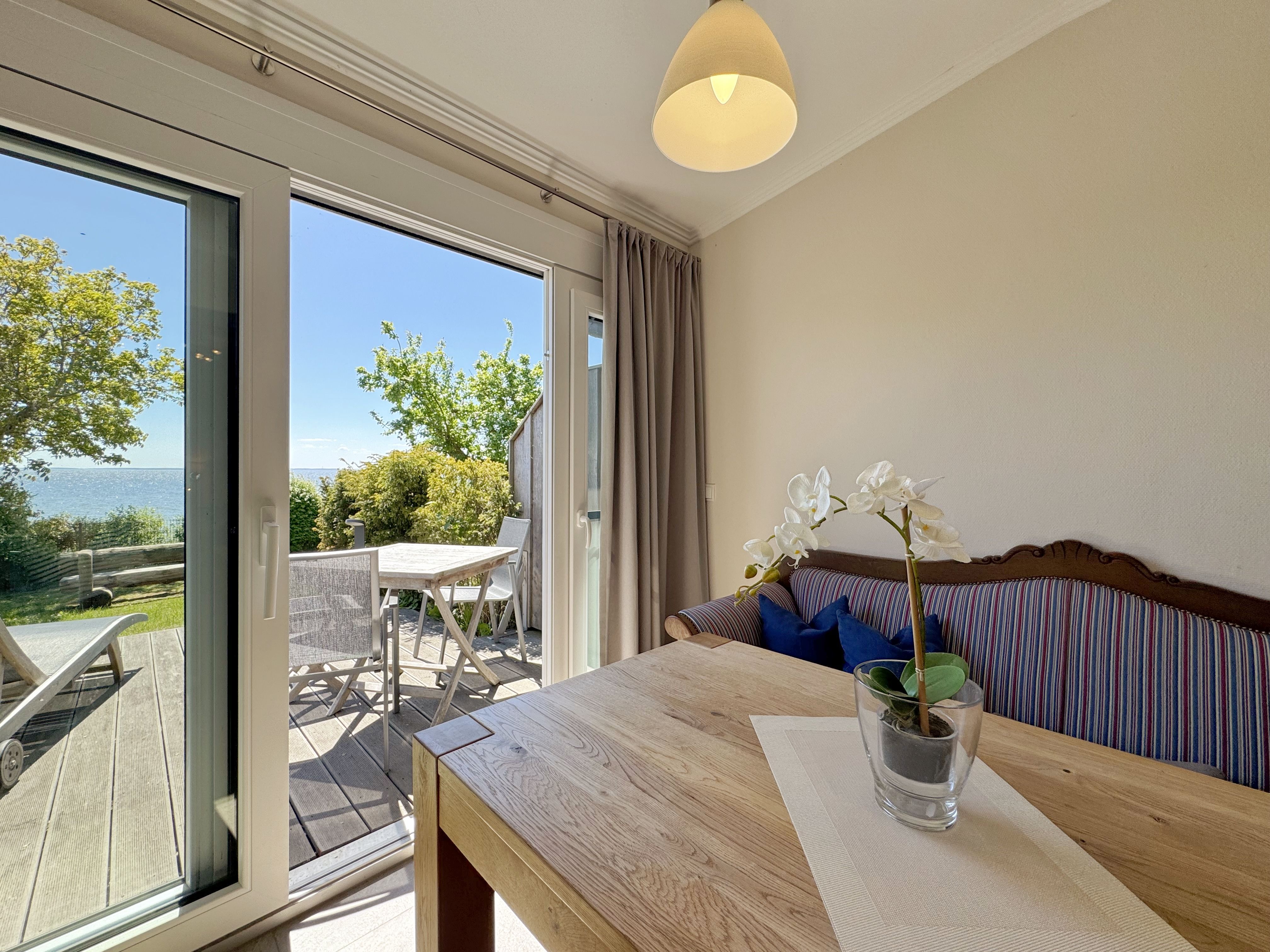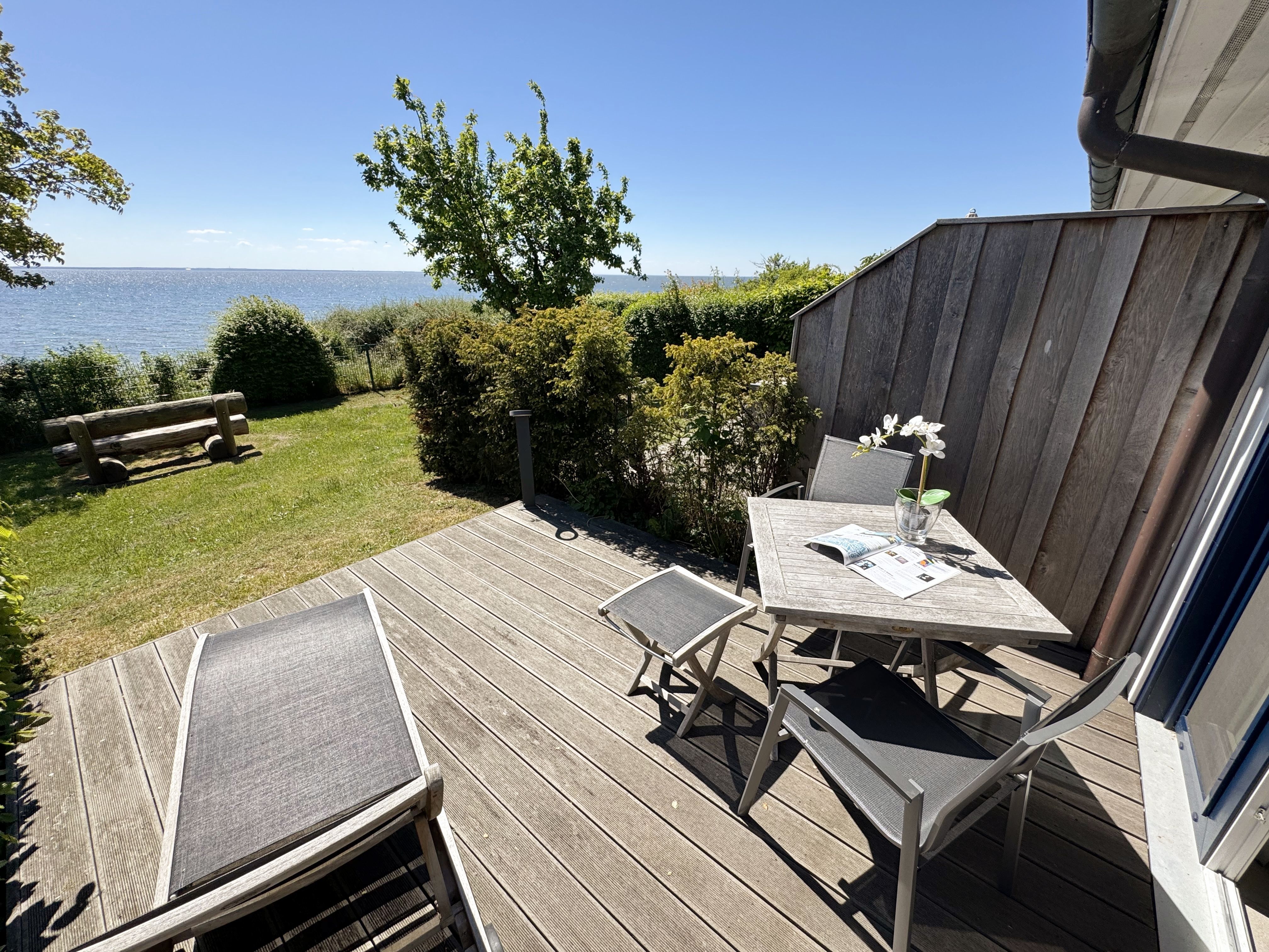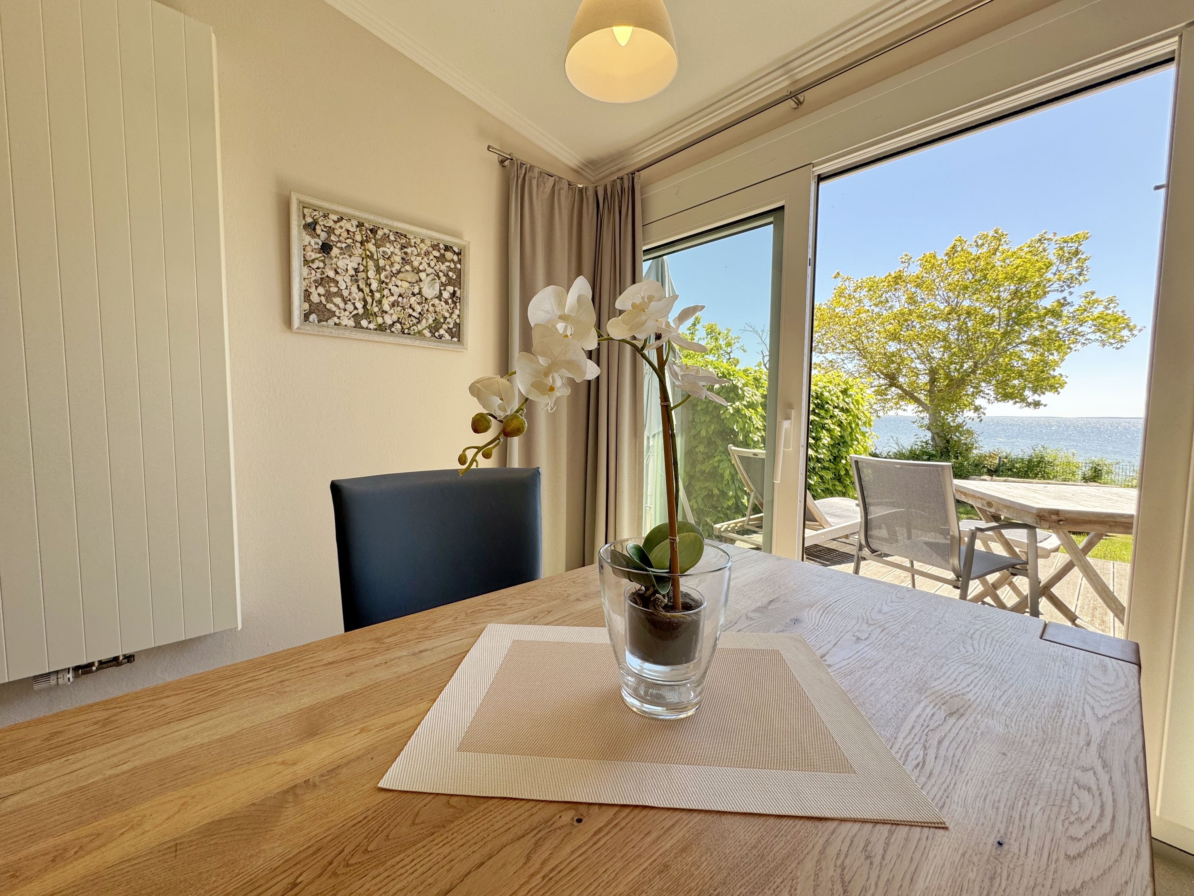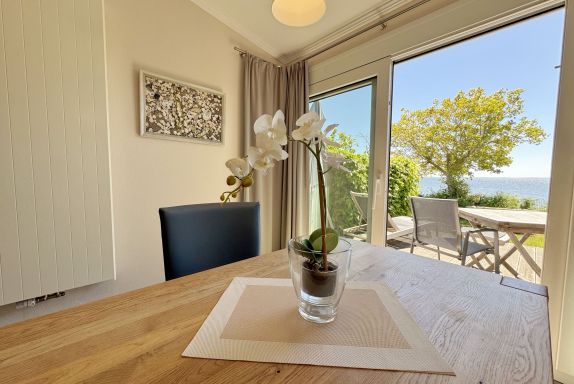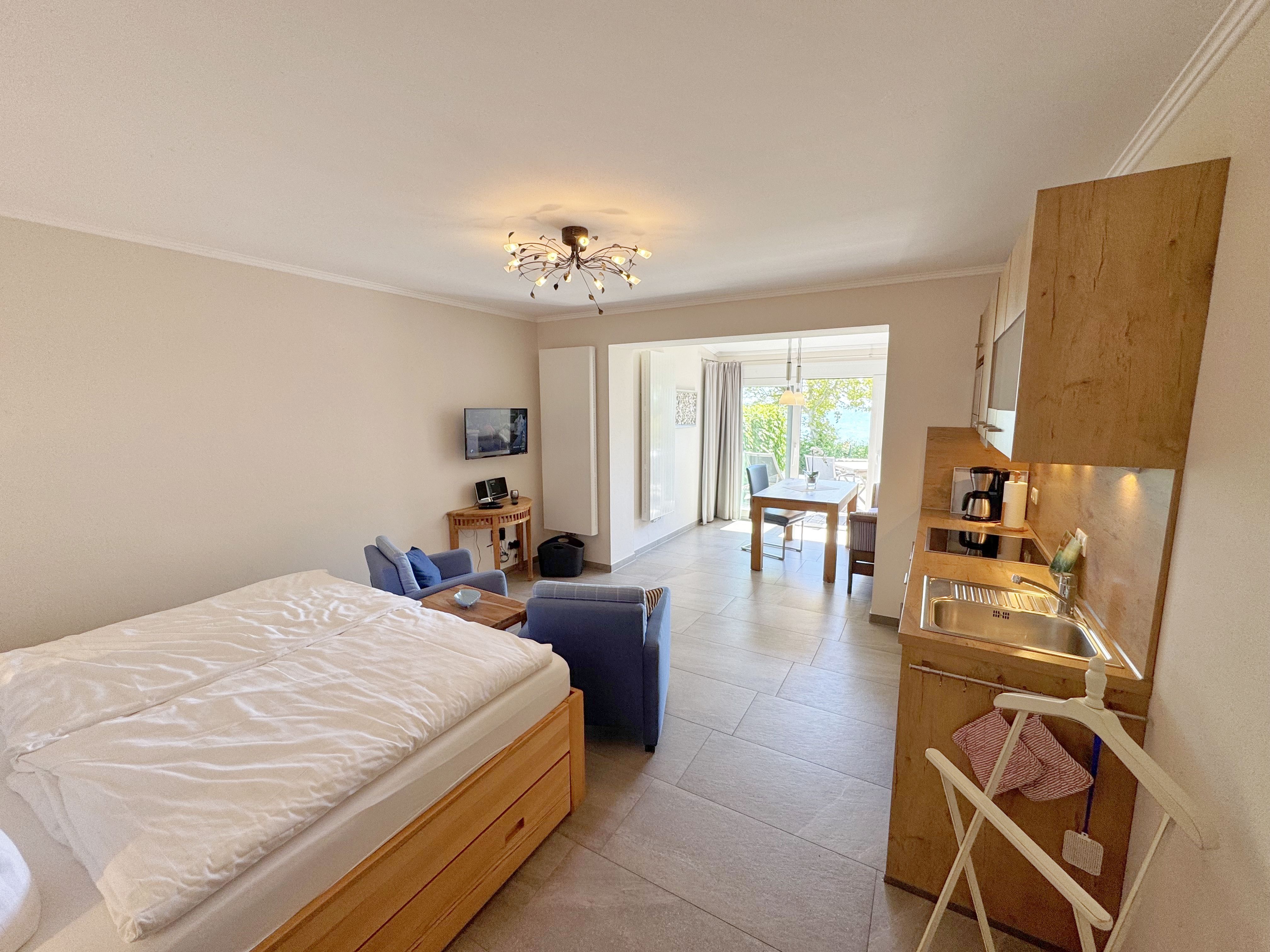 Die Ferienwohnung (Nichtraucher) Nr. 2, ca. 35 m², für bis zu 2 Personen, befindet sich im Erdgeschoss eines 6 Familienhauses auf dem 4.500 m² großen Grundstück in Einzellage ohne Publikums- und PKW-Verkehr. Die Wohnung ist nach Süden ausgerichtet und verfügt über ein Badezimmer und über einen kombinierten, verdunkelbaren Wohn-/Schlafbereich sowie über eine nicht einsehbare ca. 12 m² große Südterrasse. Von hier eröffnet sich ein grandioser Panoramablick über die unmittelbar vor dem Haus liegende Ostsee. Die einzigen Geräusche sind der Wind und das Rauschen des Meeres. Direkt vor den ebenerdigen großen Fenstern befindet sich der gemütliche, sonnige Essbereich. Das komfortable Doppelbett (Größe 1,80 m x 2,00 m) aus geölter, massiver Kernbuche ist ausgestattet mit Druckentlastenden, atmungsaktiven und körperunterstützenden Geltex Kaltschaummatratzen. Die Matratze des Doppelbettes hat die Härtegrade 2 und 3. Von hieraus genießen Sie sogar schon beim Aufwachen den faszinierenden Meerblick- das ist Urlaub pur. Die Wohnung erfüllt ihrer Ausstattung höchste Ansprüche. Erlesene Baumaterialien und Einrichtungsgegenstände vermitteln ein Gefühl des Genießens von Luxus. Nur beispielhaft sei erwähnt, dass das Badezimmer mit Granitwaschtisch, Fön, Fußbodenheizung und Handtuchheizkörper eingerichtet ist. In dem Flur und dem Wohn/Schlafraum sind hochwertige italienische Lake-Stone-Fliesen verlegt worden. Die moderne Küche beinhaltet ein Ceran-Kochfeld, Kühlschrank mit Gefrierfach, Geschirrspülmaschine und Mikrowelle. Die Küchenausstattung enthält an Kleinelektrogeräten Toaster, Kaffeemaschine, Wasser- und Eierkocher sowie Handmixer. Der Essbereich ist möbliert mit einem massiven Tisch aus geölter Wildeiche und Lederschwingstühlen in der Farbe mocca. Flachbildfernseher, Internetanschluss WLAN sowie Mini-Stereo Anlage mit USB sind vorhanden. Eine original finnische Sauna mit moderner Dusche und Ruheliegen steht allen Gästen gegen Gebühr zur Verfügung. Die Terrasse ist mit komfortablen Möbeln für ein Genießen von Sonne, der nahen See und einem gemütlichen Beisammensein ausgerichtet. Die Parkplätze und ein überdachter Fahrradunterstand stehen kostenlos zur Verfügung. Ein ca. 3.000 m² großes Rasengrundstück, am Haus und an der Ostseeküste gelegen, steht zur Freizeitgestaltung mit Grillplatz zur Verfügung. 1 Haustier ist gegen eine Gebühr ein gern gesehener Gast. Die Erstausstattung eines Wäschepaketes (komplette Bettwäsche, 1 Duschhandtuch, 2 kleine Handtücher, 2 Geschirrhandtücher) können Sie bis 14 Tage vor Anreise gegen einen Aufpreis dazu buchen oder durch eigene ergänzen.