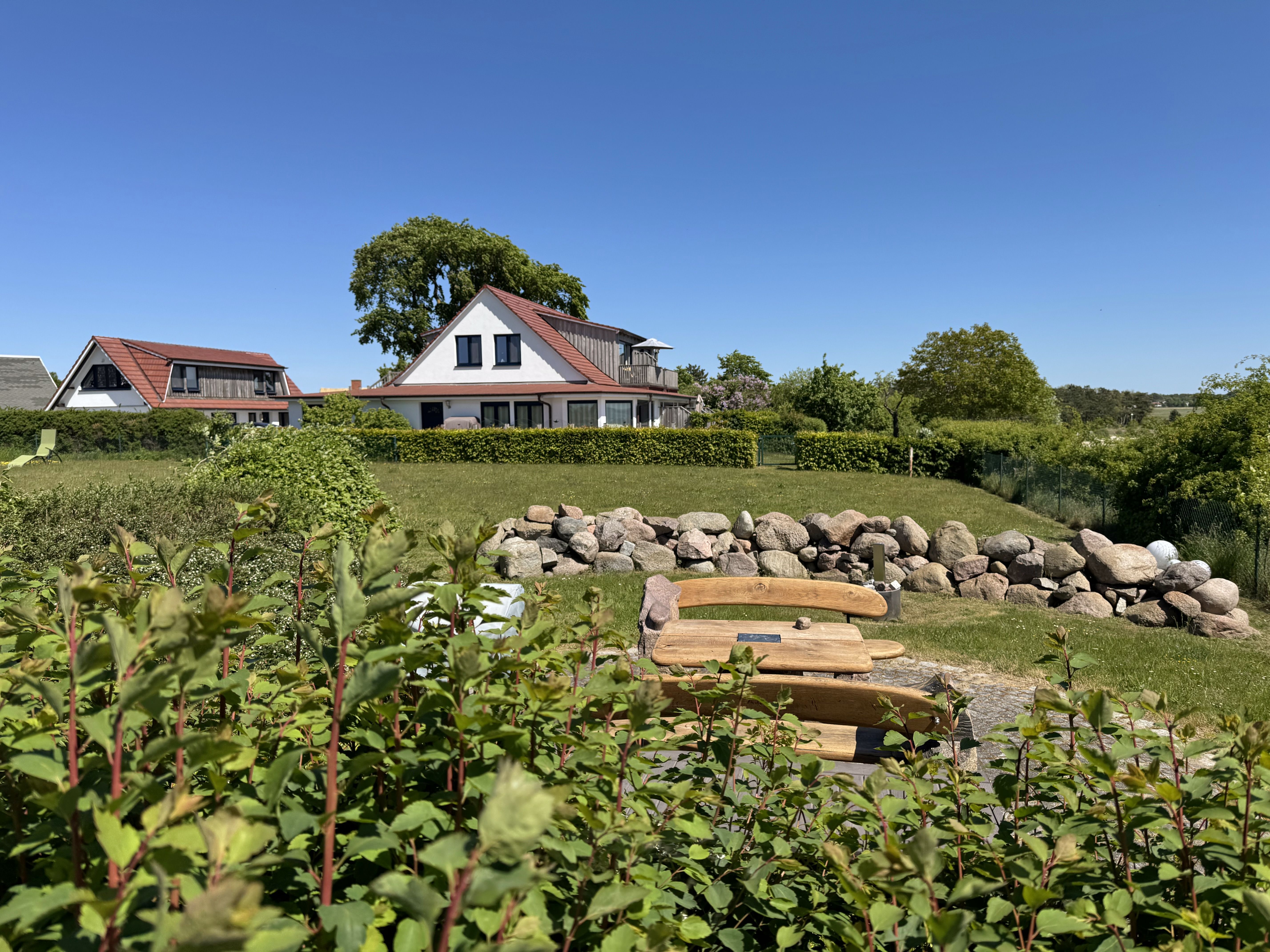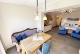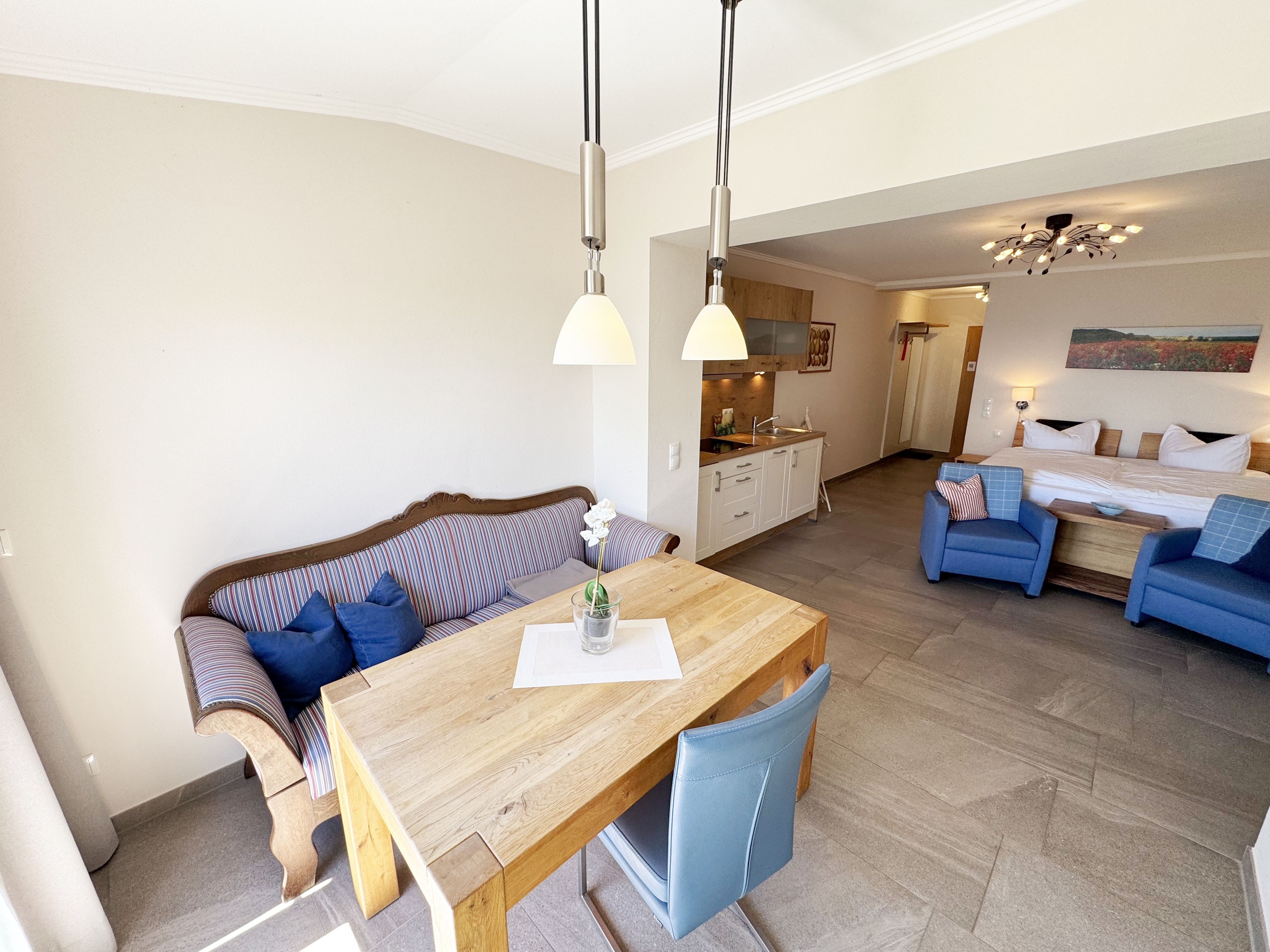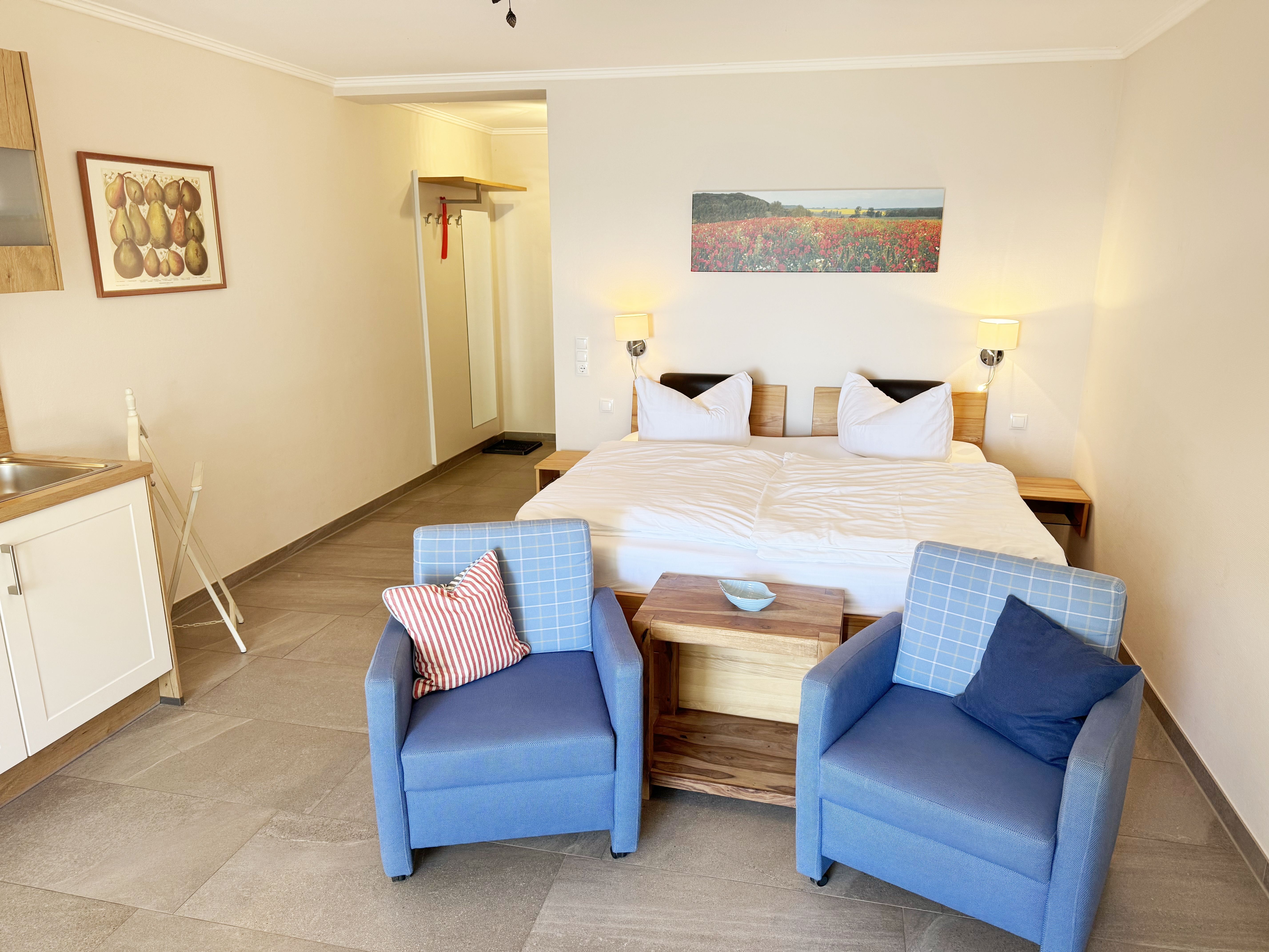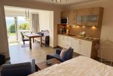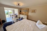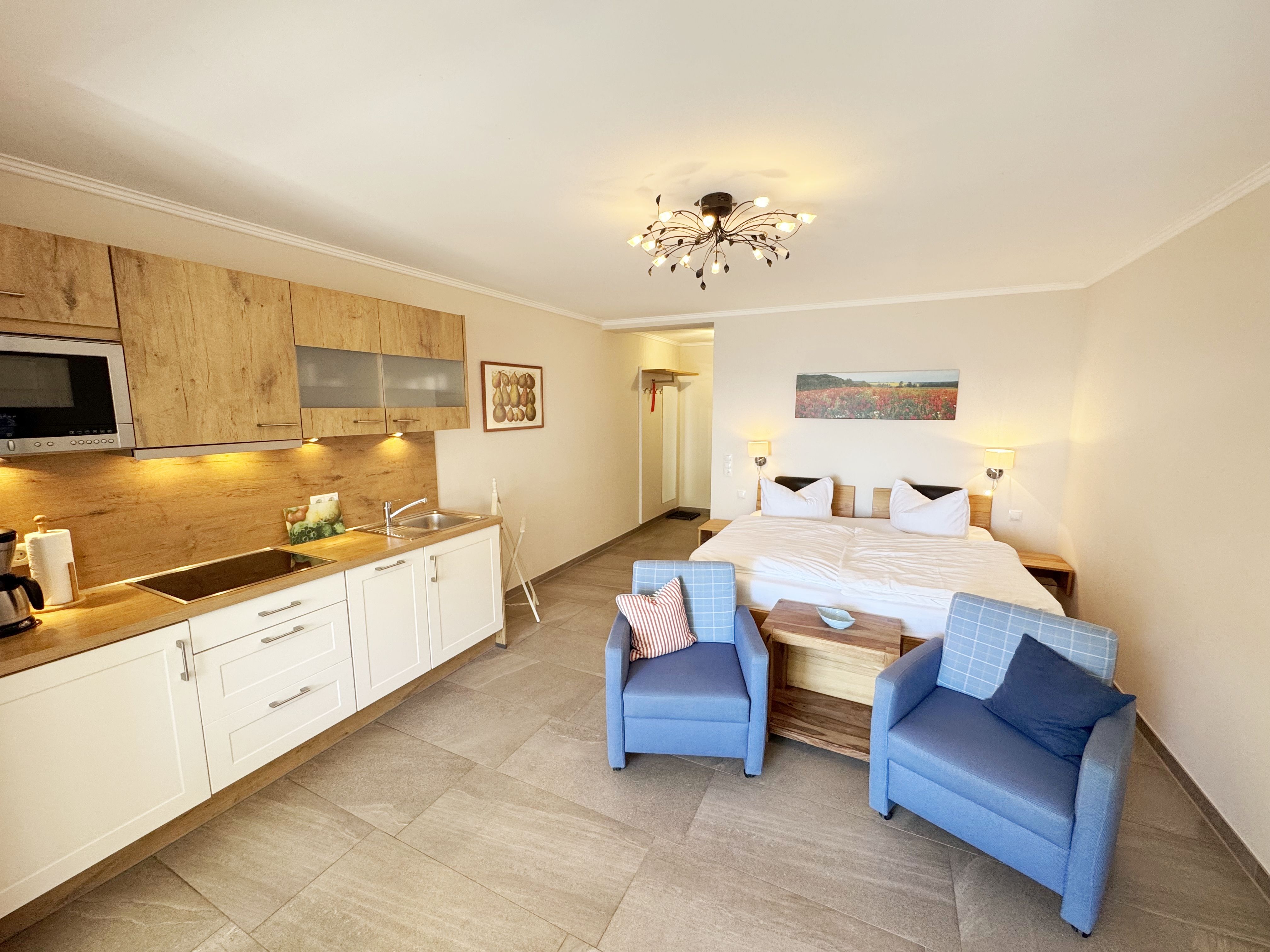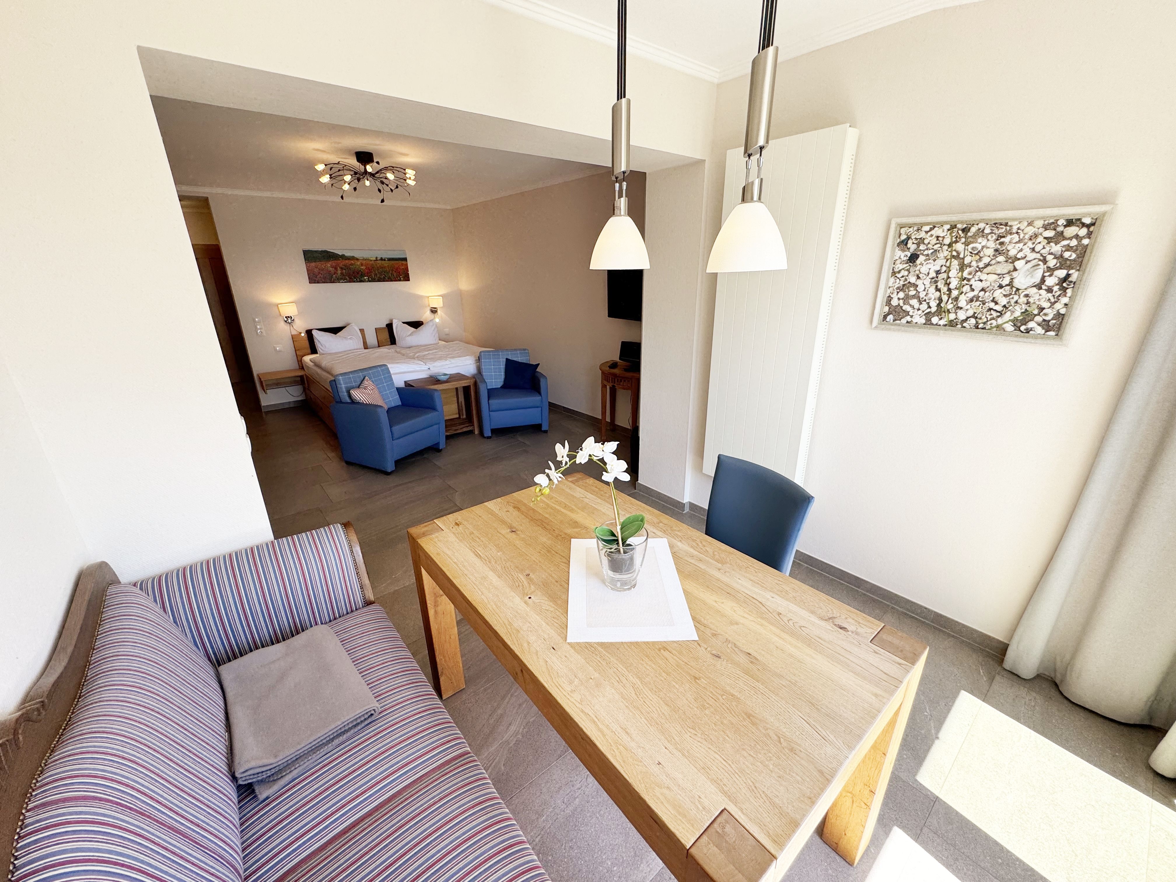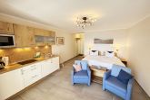Die Ferienwohnung (Nichtraucher) Nr. 2, ca. 35 m², für bis zu 2 Personen, befindet sich im Erdgeschoss eines 6 Familienhauses auf dem 4.500 m² großen Grundstück in Einzellage ohne Publikums- und PKW-Verkehr. Die Wohnung ist nach Süden ausgerichtet und verfügt über ein Badezimmer und über einen kombinierten, verdunkelbaren Wohn-/Schlafbereich sowie über eine nicht einsehbare ca. 12 m² große Südterrasse. Von hier eröffnet sich ein grandioser Panoramablick über die unmittelbar vor dem Haus liegende Ostsee. Die einzigen Geräusche sind der Wind und das Rauschen des Meeres. Direkt vor den ebenerdigen großen Fenstern befindet sich der gemütliche, sonnige Essbereich. Das komfortable Doppelbett (Größe 1,80 m x 2,00 m) aus geölter, massiver Kernbuche ist ausgestattet mit Druckentlastenden, atmungsaktiven und körperunterstützenden Geltex Kaltschaummatratzen. Die Matratze des Doppelbettes hat die Härtegrade 2 und 3. Von hieraus genießen Sie sogar schon beim Aufwachen den faszinierenden Meerblick- das ist Urlaub pur. Die Wohnung erfüllt ihrer Ausstattung höchste Ansprüche. Erlesene Baumaterialien und Einrichtungsgegenstände vermitteln ein Gefühl des Genießens von Luxus. Nur beispielhaft sei erwähnt, dass das Badezimmer mit Granitwaschtisch, Fön, Fußbodenheizung und Handtuchheizkörper eingerichtet ist. In dem Flur und dem Wohn/Schlafraum sind hochwertige italienische Lake-Stone-Fliesen verlegt worden. Die moderne Küche beinhaltet ein Ceran-Kochfeld, Kühlschrank mit Gefrierfach, Geschirrspülmaschine und Mikrowelle. Die Küchenausstattung enthält an Kleinelektrogeräten Toaster, Kaffeemaschine, Wasser- und Eierkocher sowie Handmixer. Der Essbereich ist möbliert mit einem massiven Tisch aus geölter Wildeiche und Lederschwingstühlen in der Farbe mocca. Flachbildfernseher, Internetanschluss WLAN sowie Mini-Stereo Anlage mit USB sind vorhanden. Eine original finnische Sauna mit moderner Dusche und Ruheliegen steht allen Gästen gegen Gebühr zur Verfügung. Die Terrasse ist mit komfortablen Möbeln für ein Genießen von Sonne, der nahen See und einem gemütlichen Beisammensein ausgerichtet. Die Parkplätze und ein überdachter Fahrradunterstand stehen kostenlos zur Verfügung. Ein ca. 3.000 m² großes Rasengrundstück, am Haus und an der Ostseeküste gelegen, steht zur Freizeitgestaltung mit Grillplatz zur Verfügung. 1 Haustier ist gegen eine Gebühr ein gern gesehener Gast. Die Erstausstattung eines Wäschepaketes (komplette Bettwäsche, 1 Duschhandtuch, 2 kleine Handtücher, 2 Geschirrhandtücher) können Sie bis 14 Tage vor Anreise gegen einen Aufpreis dazu buchen oder durch eigene ergänzen.