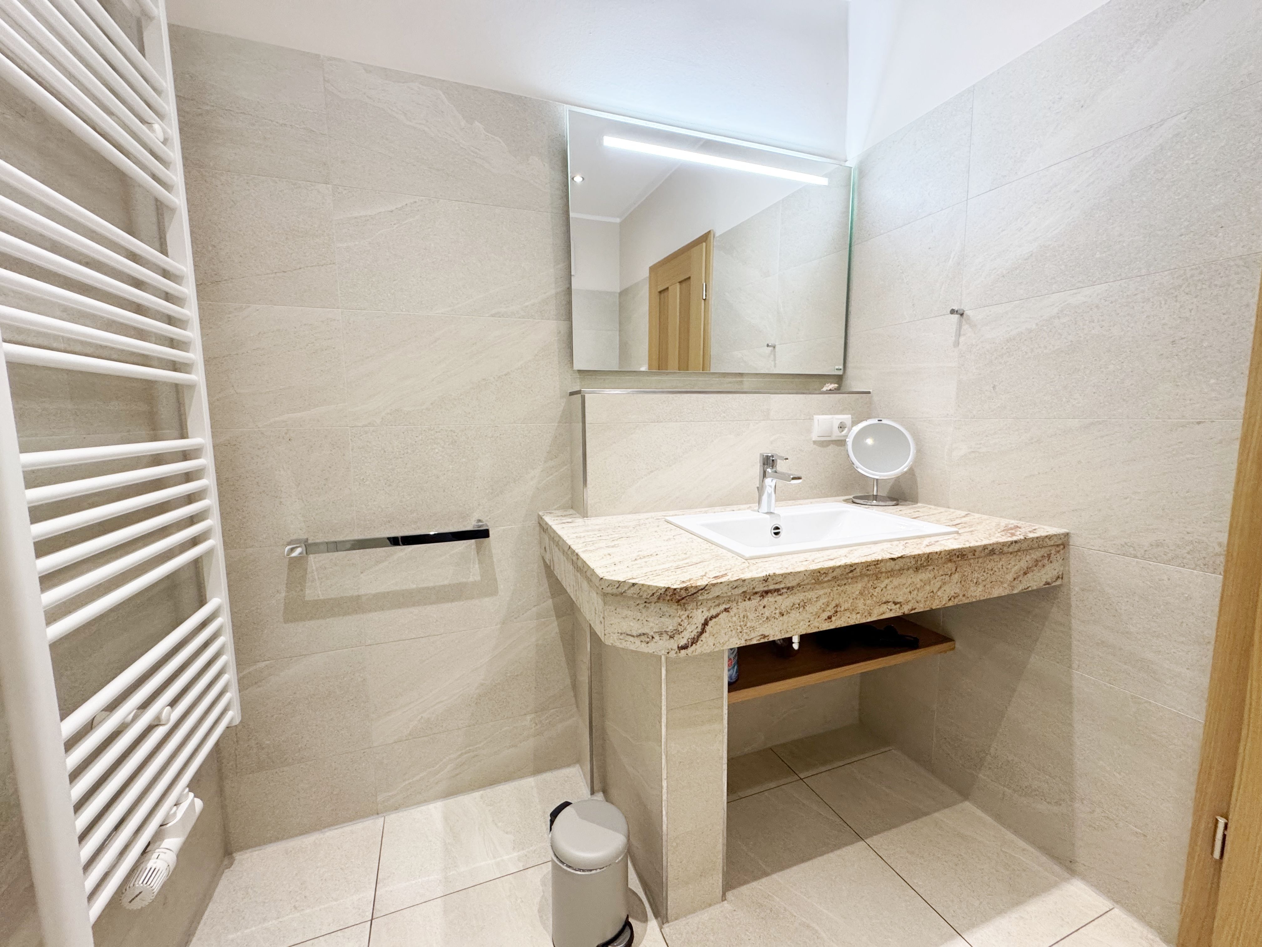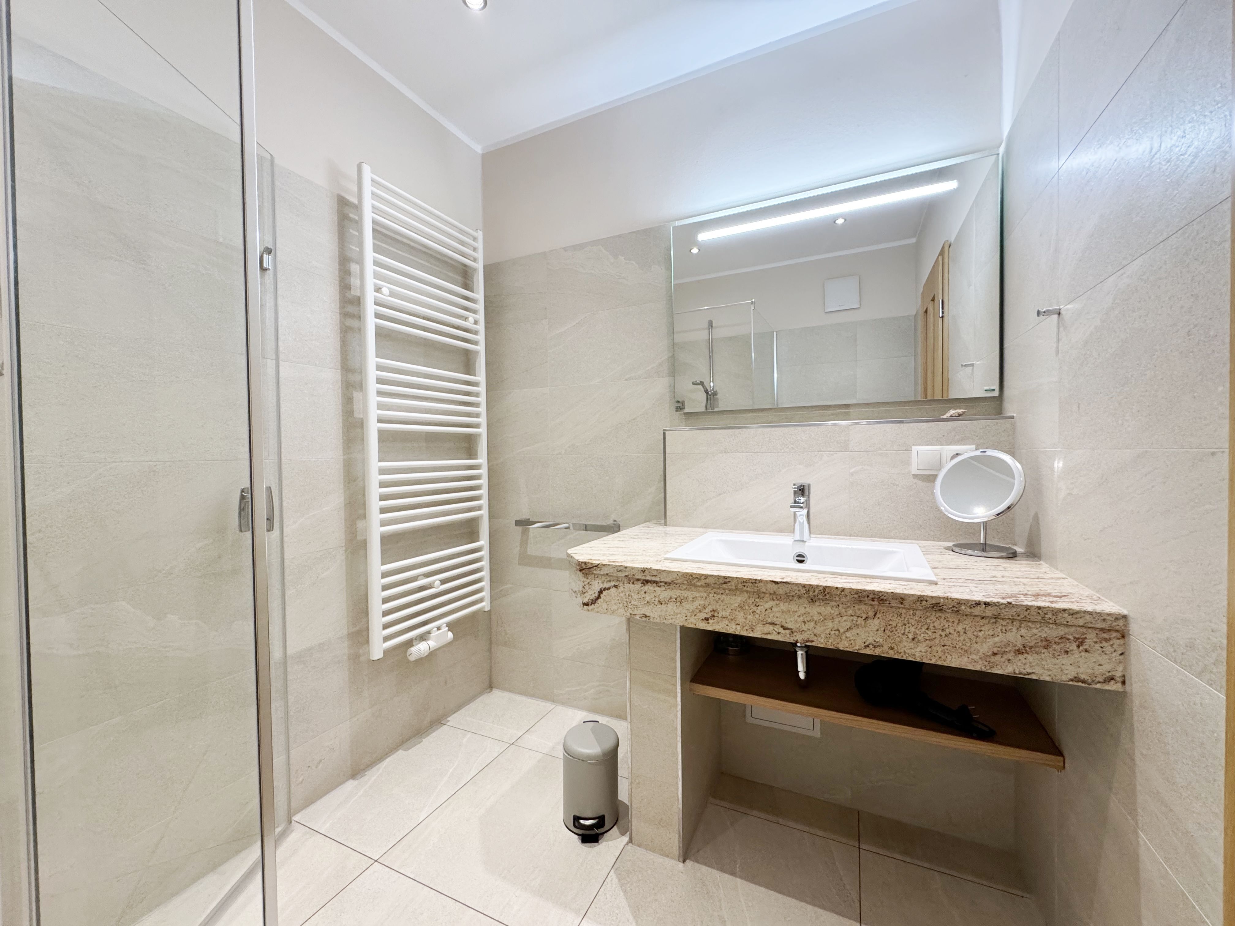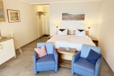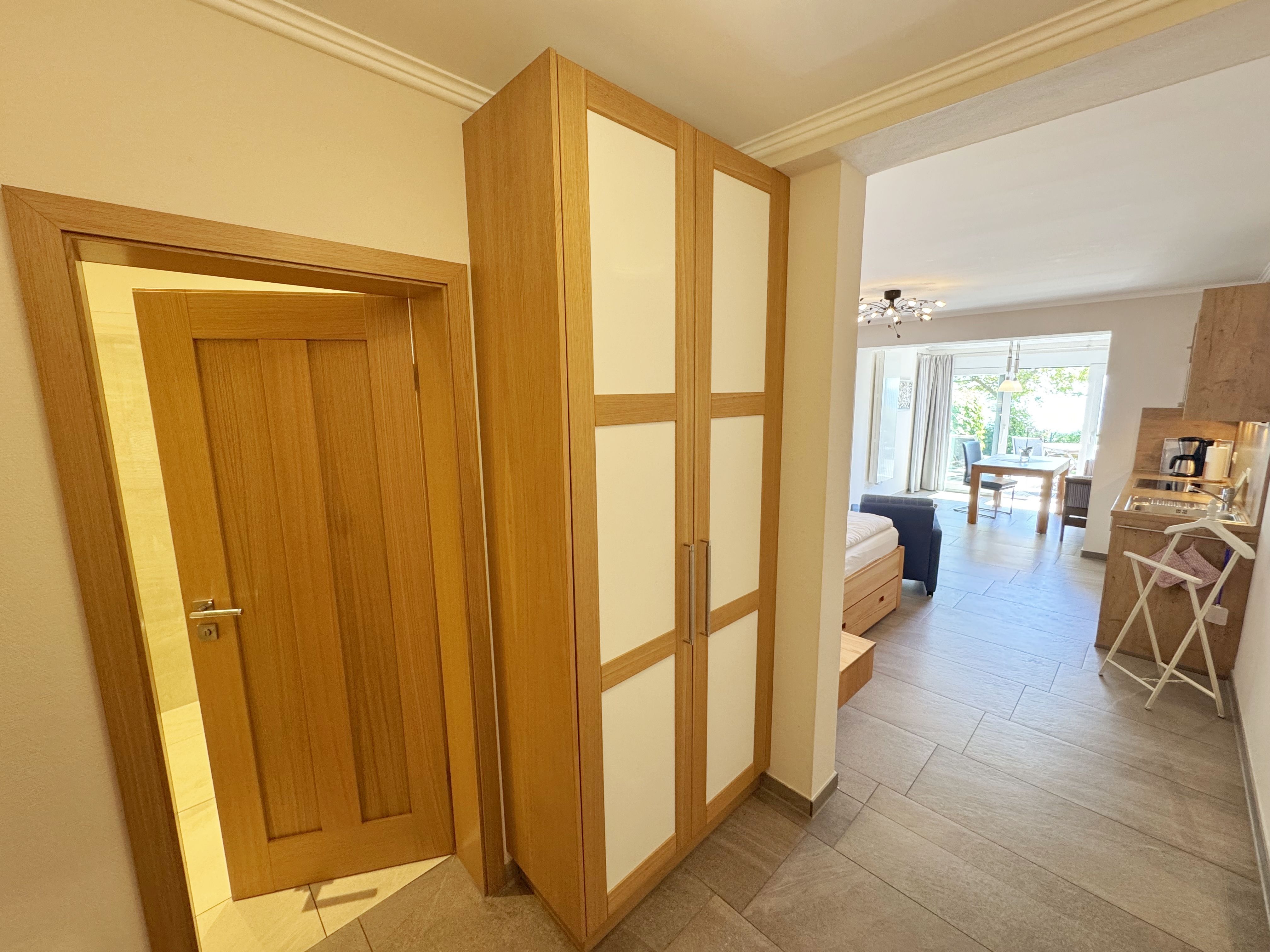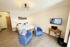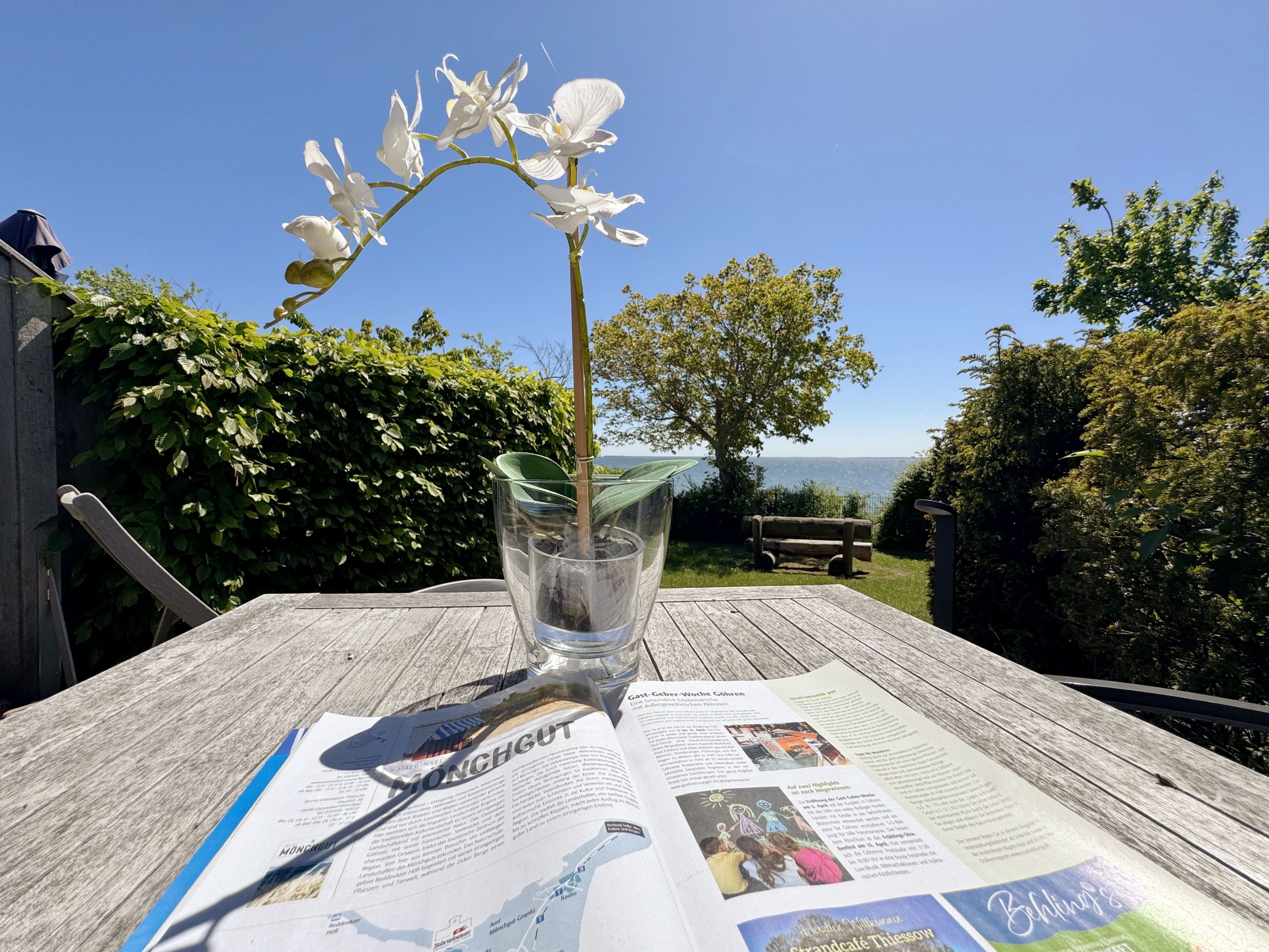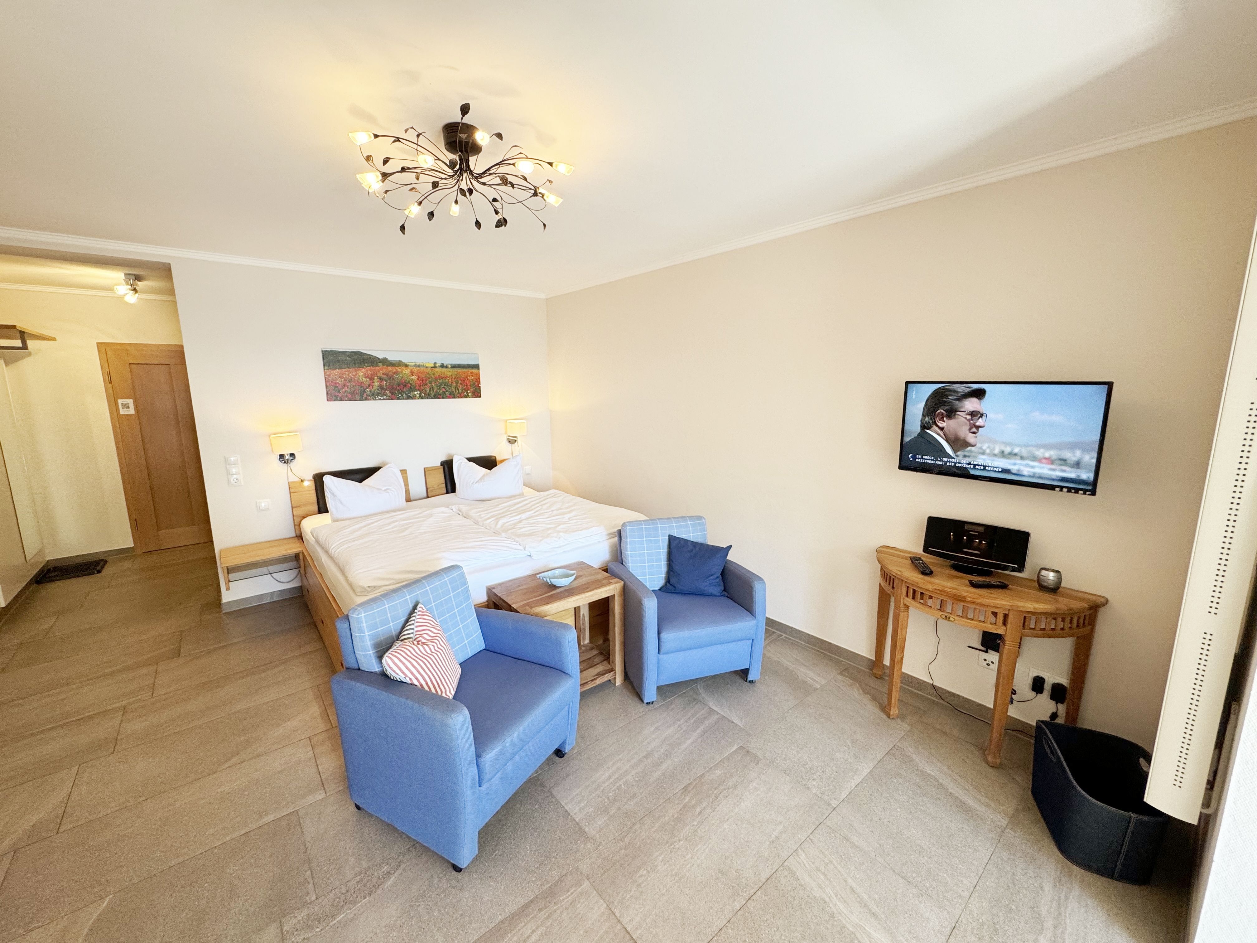 Die Ferienwohnung (Nichtraucher) Nr. 2, ca. 35 m², für bis zu 2 Personen, befindet sich im Erdgeschoss eines 6 Familienhauses auf dem 4.500 m² großen Grundstück in Einzellage ohne Publikums- und PKW-Verkehr. Die Wohnung ist nach Süden ausgerichtet und verfügt über ein Badezimmer und über einen kombinierten, verdunkelbaren Wohn-/Schlafbereich sowie über eine nicht einsehbare ca. 12 m² große Südterrasse. Von hier eröffnet sich ein grandioser Panoramablick über die unmittelbar vor dem Haus liegende Ostsee. Die einzigen Geräusche sind der Wind und das Rauschen des Meeres. Direkt vor den ebenerdigen großen Fenstern befindet sich der gemütliche, sonnige Essbereich. Das komfortable Doppelbett (Größe 1,80 m x 2,00 m) aus geölter, massiver Kernbuche ist ausgestattet mit Druckentlastenden, atmungsaktiven und körperunterstützenden Geltex Kaltschaummatratzen. Die Matratze des Doppelbettes hat die Härtegrade 2 und 3. Von hieraus genießen Sie sogar schon beim Aufwachen den faszinierenden Meerblick- das ist Urlaub pur. Die Wohnung erfüllt ihrer Ausstattung höchste Ansprüche. Erlesene Baumaterialien und Einrichtungsgegenstände vermitteln ein Gefühl des Genießens von Luxus. Nur beispielhaft sei erwähnt, dass das Badezimmer mit Granitwaschtisch, Fön, Fußbodenheizung und Handtuchheizkörper eingerichtet ist. In dem Flur und dem Wohn/Schlafraum sind hochwertige italienische Lake-Stone-Fliesen verlegt worden. Die moderne Küche beinhaltet ein Ceran-Kochfeld, Kühlschrank mit Gefrierfach, Geschirrspülmaschine und Mikrowelle. Die Küchenausstattung enthält an Kleinelektrogeräten Toaster, Kaffeemaschine, Wasser- und Eierkocher sowie Handmixer. Der Essbereich ist möbliert mit einem massiven Tisch aus geölter Wildeiche und Lederschwingstühlen in der Farbe mocca. Flachbildfernseher, Internetanschluss WLAN sowie Mini-Stereo Anlage mit USB sind vorhanden. Eine original finnische Sauna mit moderner Dusche und Ruheliegen steht allen Gästen gegen Gebühr zur Verfügung. Die Terrasse ist mit komfortablen Möbeln für ein Genießen von Sonne, der nahen See und einem gemütlichen Beisammensein ausgerichtet. Die Parkplätze und ein überdachter Fahrradunterstand stehen kostenlos zur Verfügung. Ein ca. 3.000 m² großes Rasengrundstück, am Haus und an der Ostseeküste gelegen, steht zur Freizeitgestaltung mit Grillplatz zur Verfügung. 1 Haustier ist gegen eine Gebühr ein gern gesehener Gast. Die Erstausstattung eines Wäschepaketes (komplette Bettwäsche, 1 Duschhandtuch, 2 kleine Handtücher, 2 Geschirrhandtücher) können Sie bis 14 Tage vor Anreise gegen einen Aufpreis dazu buchen oder durch eigene ergänzen.