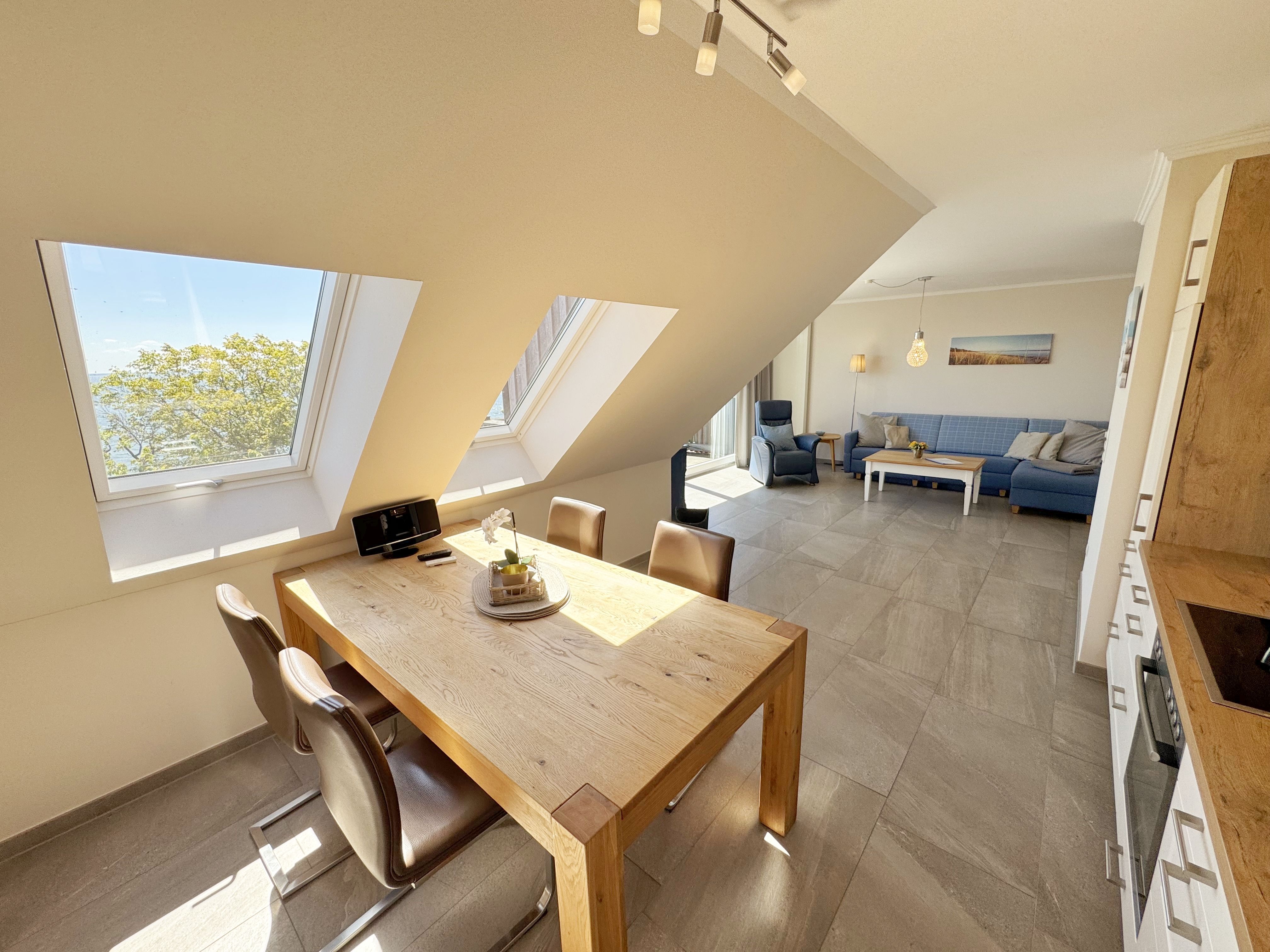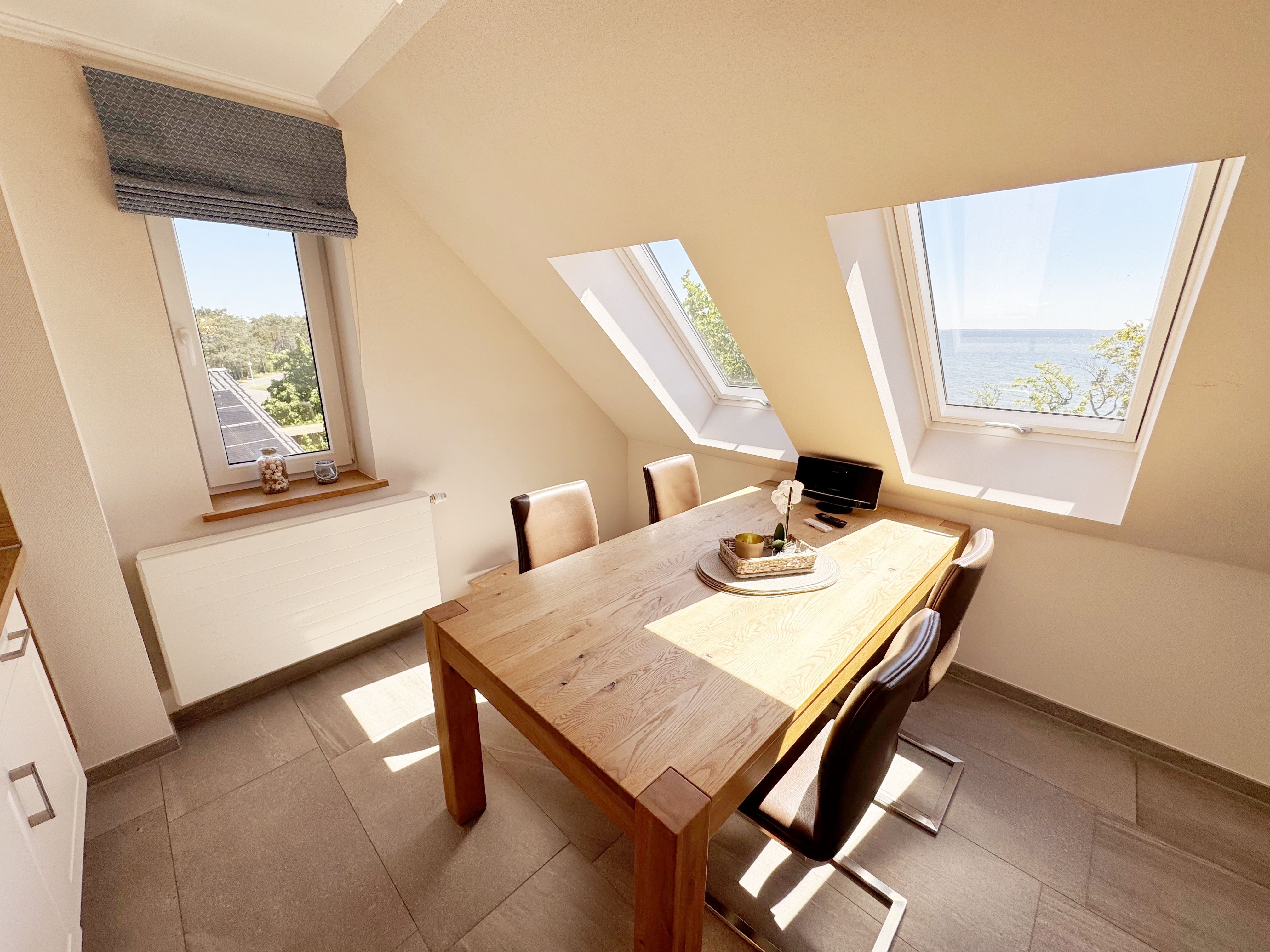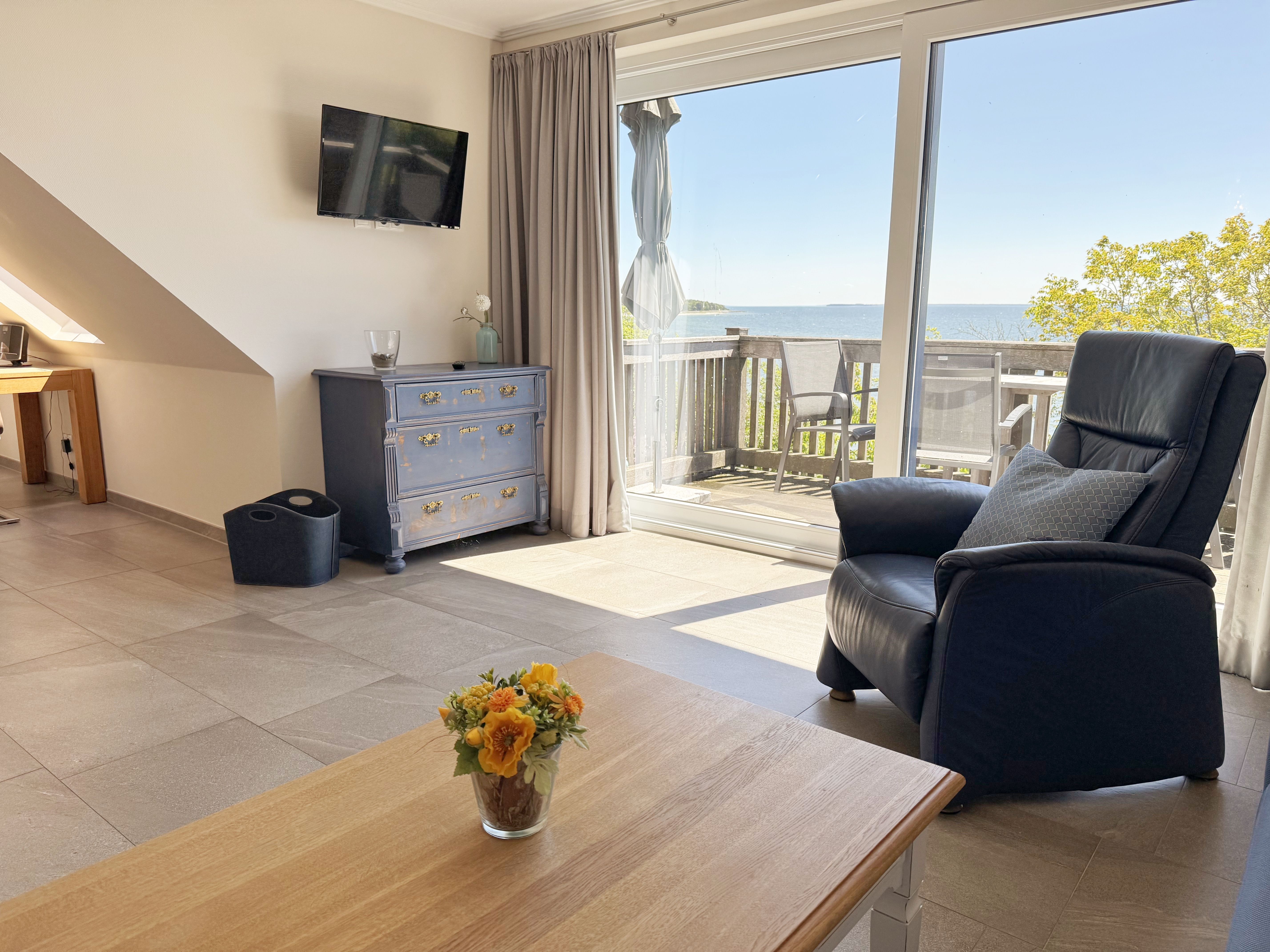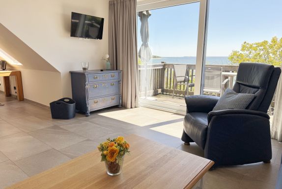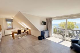 Die Ferienwohnung (Nichtraucher) Nr. 4, ca. 72,5 m², befindet sich im Obergeschoss eines 6 Familienhauses auf 4.500 m² großem Grundstück in Einzellage ohne Publikums- und PKW-Verkehr.Die Wohnung ist nach Süden ausgerichtet und verfügt über ein Badezimmer, ein verdunkelbares Schlafzimmer mit Doppelbett (Größe 1,80 m x 2,00 m) und Insektenschutz, einen ca. 35 m² großen Wohn- und Essbereich mit Schlafcouch (1,80m x 2,00m) sowie über einen ca. 6 m² großen Balkon. Die Matratze des Doppelbettes hat die Härtegrade 2 und 3. Das ausziehbare Schlafsofa verfügt über eine hochwertige Kaltschaummatratze. Von hier eröffnet sich ein grandioser Panoramablick über die unmittelbar vor dem Haus liegende Ostsee. Die einzigen Geräusche sind der Wind und das Rauschen des Meeres. Die Wohnung kann mit bis zu 2 Erwachsenen + 2 Kinder bis 15 Jahre belegt werden. Sie erfüllt in ihrer Ausstattung höchste Ansprüche. Erlesene Baumaterialien und Einrichtungsgegenstände vermitteln ein Gefühl des Genießens von Luxus. Nur beispielhaft sei erwähnt, dass das Badezimmer mit Granitwaschtisch, Fön, Fußbodenheizung und Handtuchheizkörper eingerichtet ist. In dem Flur und dem Wohn/Schlafraum sind hochwertige italienische Lake-Stone-Fliesen verlegt worden. Die moderne Küche beinhaltet einen Backofen mit Ceran-Kochfeld, Kühlschrank mit Gefrierfach und Geschirrspülmaschine. Die Küchenausstattung enthält an Kleinelektrogeräten Toaster, Kaffeemaschine, Wasser- und Eierkocher sowie Handmixer. Der Essbereich ist möbliert mit einem massiven Tisch aus geölter Wildeiche und Lederschwingstühlen in der Farbe mocca. Flachbildfernseher, Internetanschluss WLAN sowie Mini-Stereo Anlage mit USB sind vorhanden. Eine original finnische Sauna mit moderner Dusche und Ruheliegen steht allen Gästen gegen Gebühr zur Verfügung. Der Balkon ist mit komfortablen Möbeln für ein Genießen von Sonne, der nahen See und einem gemütlichen Beisammensein ausgerichtet. Die Parkplätze und ein überdachter Fahrradunterstand stehen kostenlos zur Verfügung. Ein ca. 3.000 m² großes Rasengrundstück, am Haus und an der Ostseeküste gelegen, steht zur Freizeitgestaltung mit Grillplatz zur Verfügung. Für unsere kleinen Gäste steht 1x Kinderreisebett (ohne Zusatzmatratze, ohne Bettinlett) und 1 Hochstuhl inklusive bereit. Haustiere sind nicht erlaubt. Die Erstausstattung eines Wäschepaketes (komplette Bettwäsche, 1 Duschhandtuch, 2 kleine Handtücher, 2 Geschirrhandtücher) können Sie bis 14 Tage vor Anreise gegen einen Aufpreis dazu buchen oder durch eigene ergänzen.