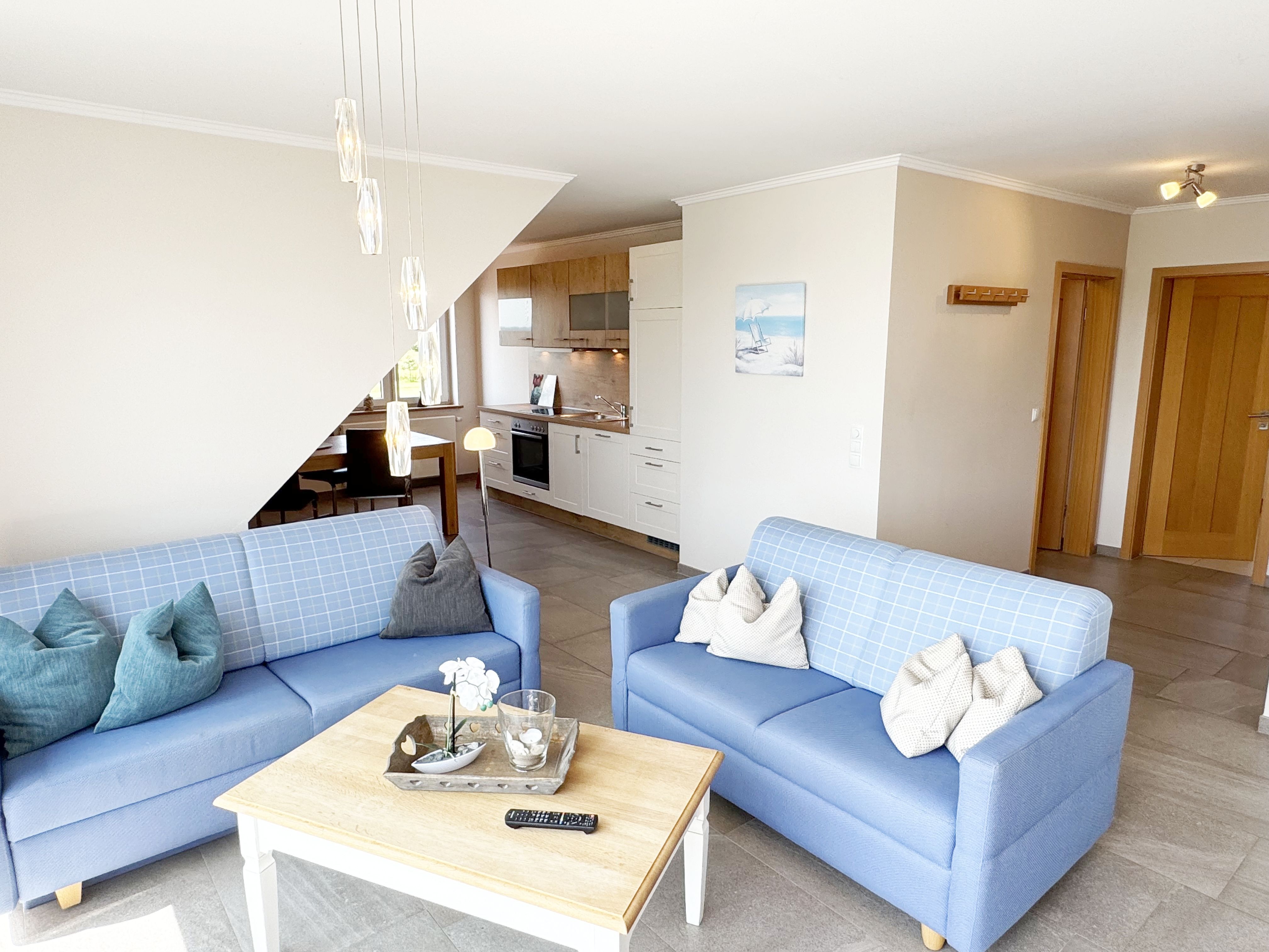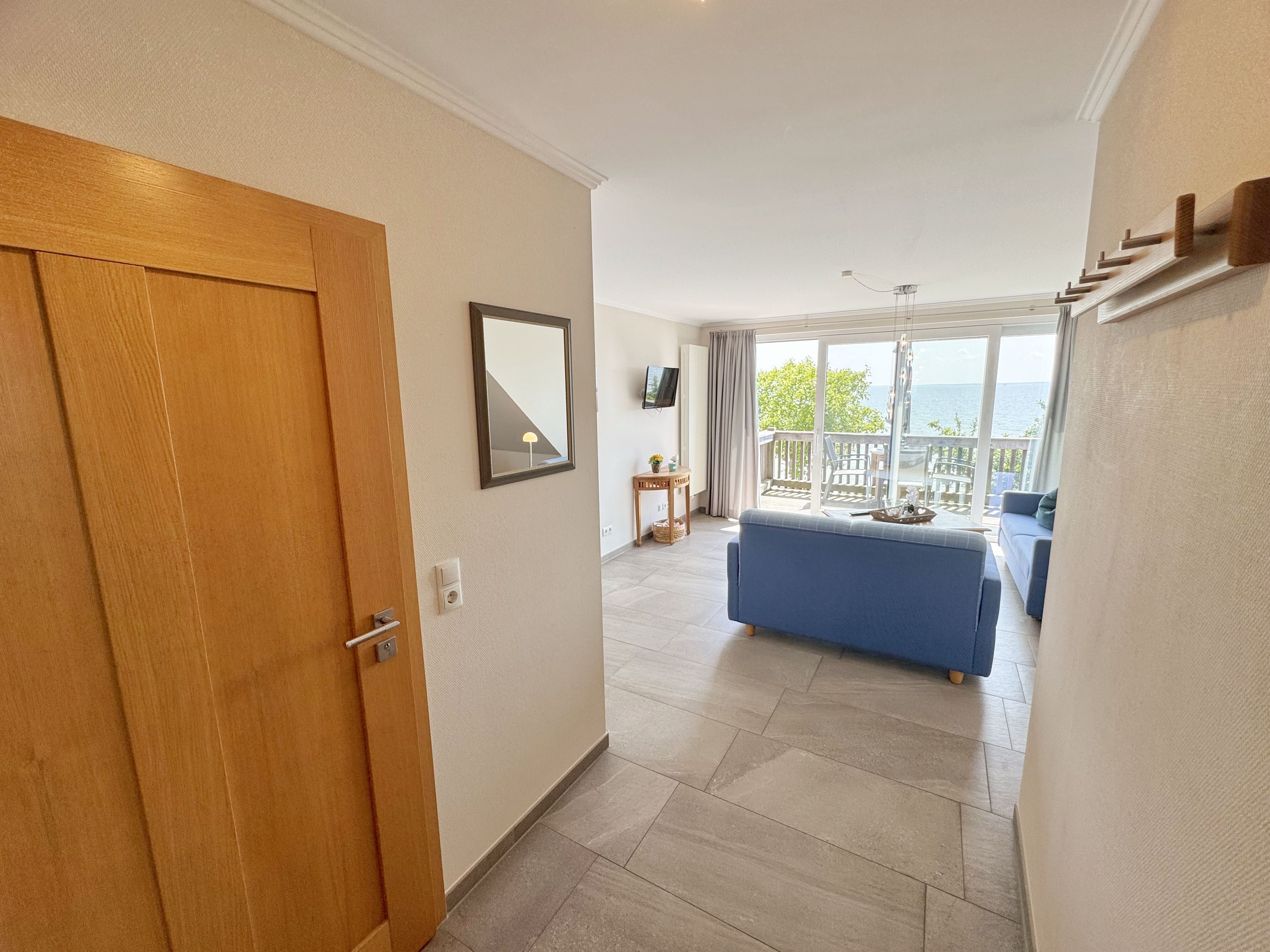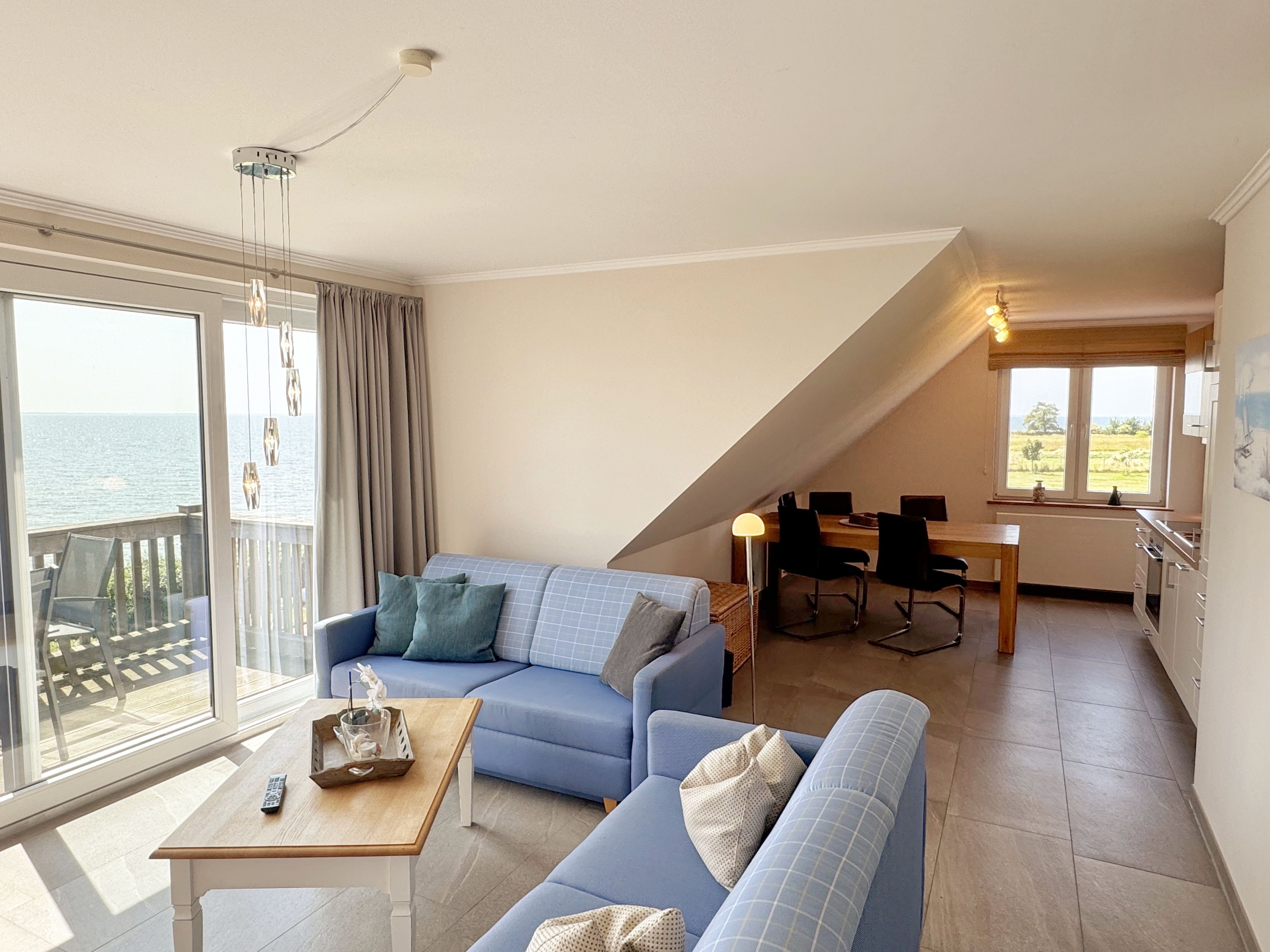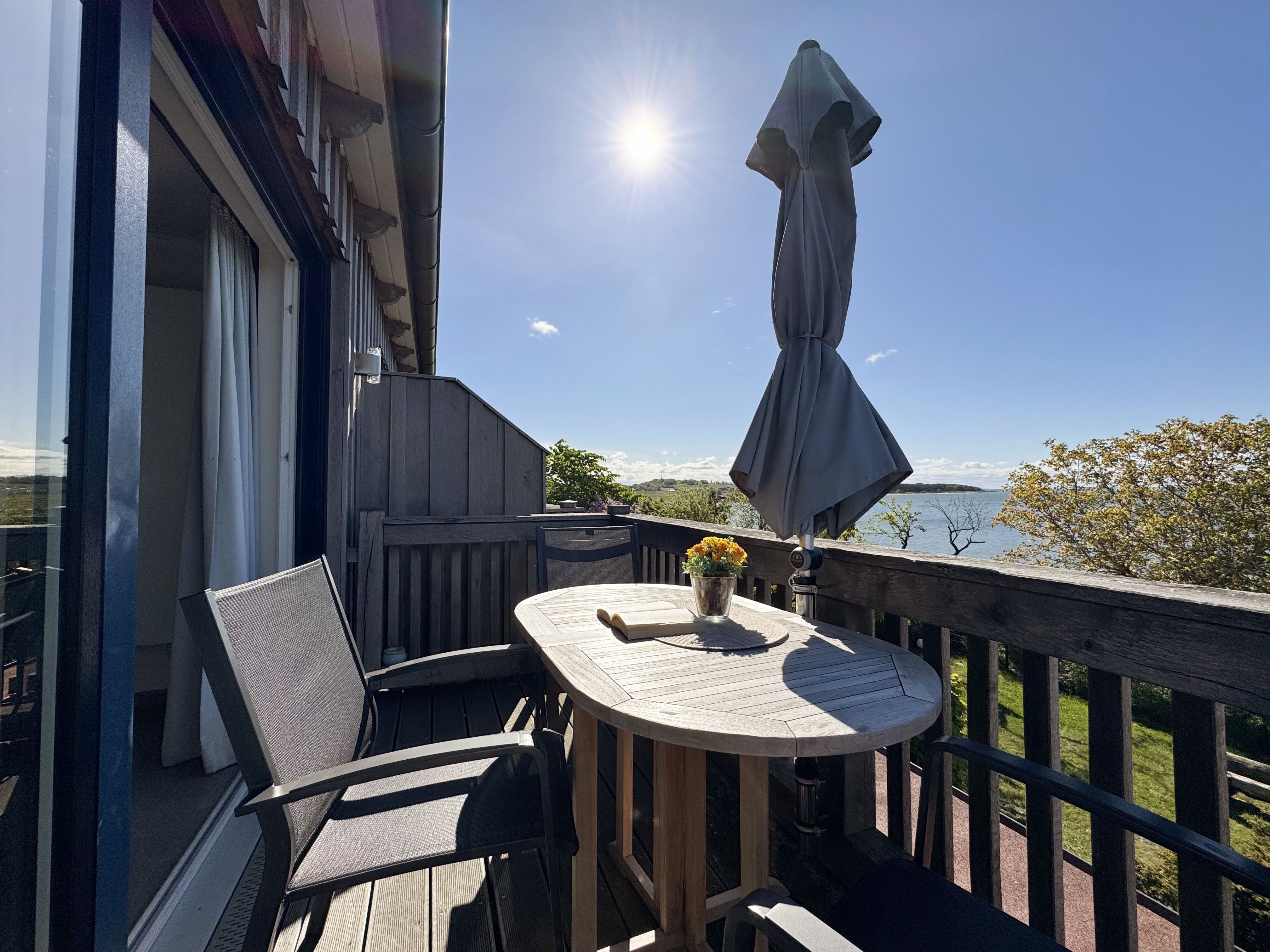 Die Ferienwohnung (Nichtraucher) Nr. 5, ca. 67,6 m², befindet ich im Obergeschoss eines 6 Familienhauses auf 4.500 m² großem Grundstück in Einzellage ohne Publikums- und PKW-Verkehr. Die Wohnung ist nach Süden ausgerichtet und verfügt über ein Badezimmer, ein verdunkelbares Schlafzimmer mit Doppelbett (Größe 1,80 m x 2,00 m) und Insektenschutz, einen ca. 35 m² großen Wohn- und Essbereich mit Schlafcouch (1,60m x 2,00m) sowie über einen ca. 6 m² großen Balkon. Die Matratze des Doppelbettes hat die Härtegrade 2 und 3. Das ausziehbare Schlafsofa verfügt über eine hochwertige Kaltschaummatratze. Von hier eröffnet sich ein grandioser Panoramablick über die unmittelbar vor dem Haus liegende Ostsee. Die einzigen Geräusche sind der Wind und das Rauschen des Meeres. Die Wohnung kann mit bis zu 2 Erwachsenen + 2 Kinder bis 15 Jahre belegt werden. Sie erfüllt in ihrer Ausstattung höchste Ansprüche. Erlesene Baumaterialien und Einrichtungsgegenstände vermitteln ein Gefühl des Genießens von Luxus. Nur beispielhaft sei erwähnt, dass das Badezimmer mit Granitwaschtisch, Fön, Fußbodenheizung und Handtuchheizkörper eingerichtet ist. In dem Flur und dem Wohn/Schlafraum sind hochwertige italienische Lake-Stone-Fliesen verlegt worden. Die moderne Küche beinhaltet einen Backofen mit Ceran-Kochfeld, Kühlschrank mit Gefrierfach und Geschirrspülmaschine. Die Küchenausstattung enthält an Kleinelektrogeräten Toaster, Kaffeemaschine, Wasser- und Eierkocher sowie Handmixer. Der Essbereich ist möbliert mit einem massiven Tisch aus geölter Wildeiche und Lederschwingstühlen in der Farbe mocca. Flachbildfernseher, Internetanschluss WLAN sowie Mini-Stereo Anlage mit USB sind vorhanden. Eine original finnische Sauna mit moderner Dusche und Ruheliegen steht allen Gästen gegen Gebühr zur Verfügung. Der Balkon ist mit komfortablen Möbeln für ein Genießen von Sonne, der nahen See und einem gemütlichen Beisammensein ausgerichtet. Die Parkplätze und ein überdachter Fahrradunterstand stehen kostenlos zur Verfügung. Ein ca. 3.000 m² großes Rasengrundstück, am Haus und an der Ostseeküste gelegen, steht zur Freizeitgestaltung mit Grillplatz zur Verfügung. Für unsere kleinen Gäste steht 1x Kinderreisebett (ohne Zusatzmatratze, ohne Bettinlett) und 1 Hochstuhl inklusive bereit. Haustiere sind nicht erlaubt. Die Erstausstattung eines Wäschepaketes (komplette Bettwäsche, 1 Duschhandtuch, 2 kleine Handtücher, 2 Geschirrhandtücher) können Sie bis 14 Tage vor Anreise gegen einen Aufpreis dazu buchen oder durch eigene ergänzen.