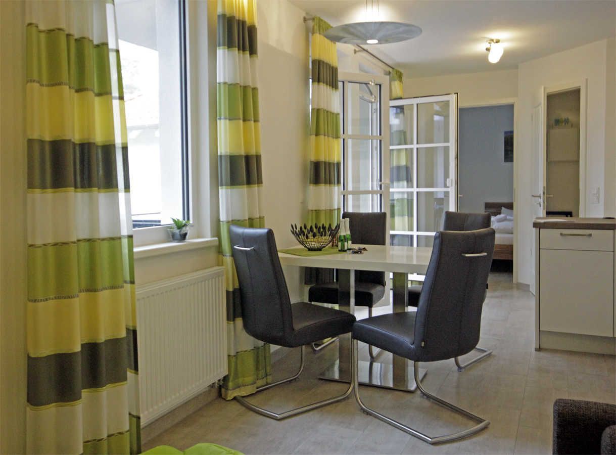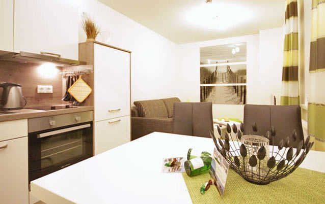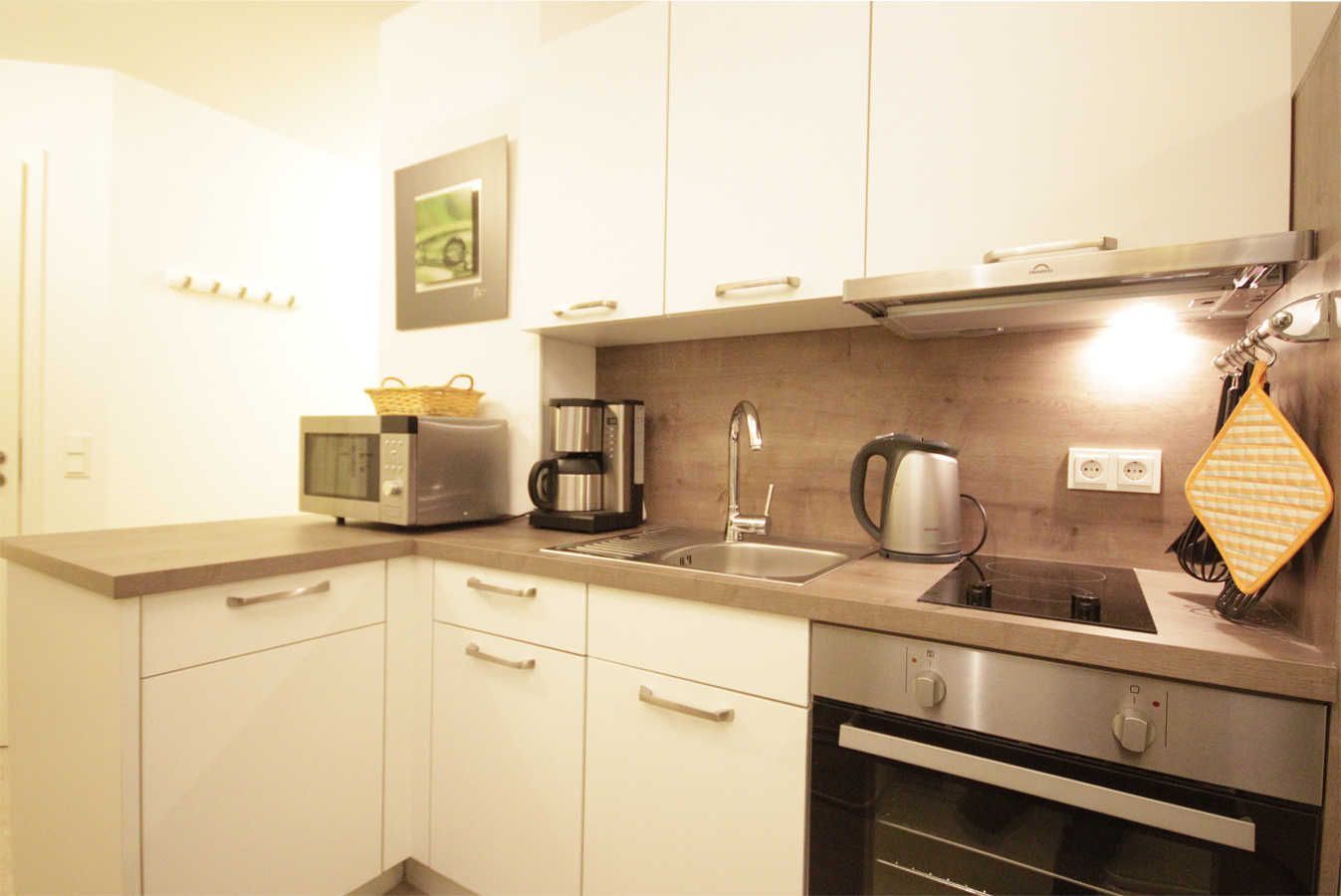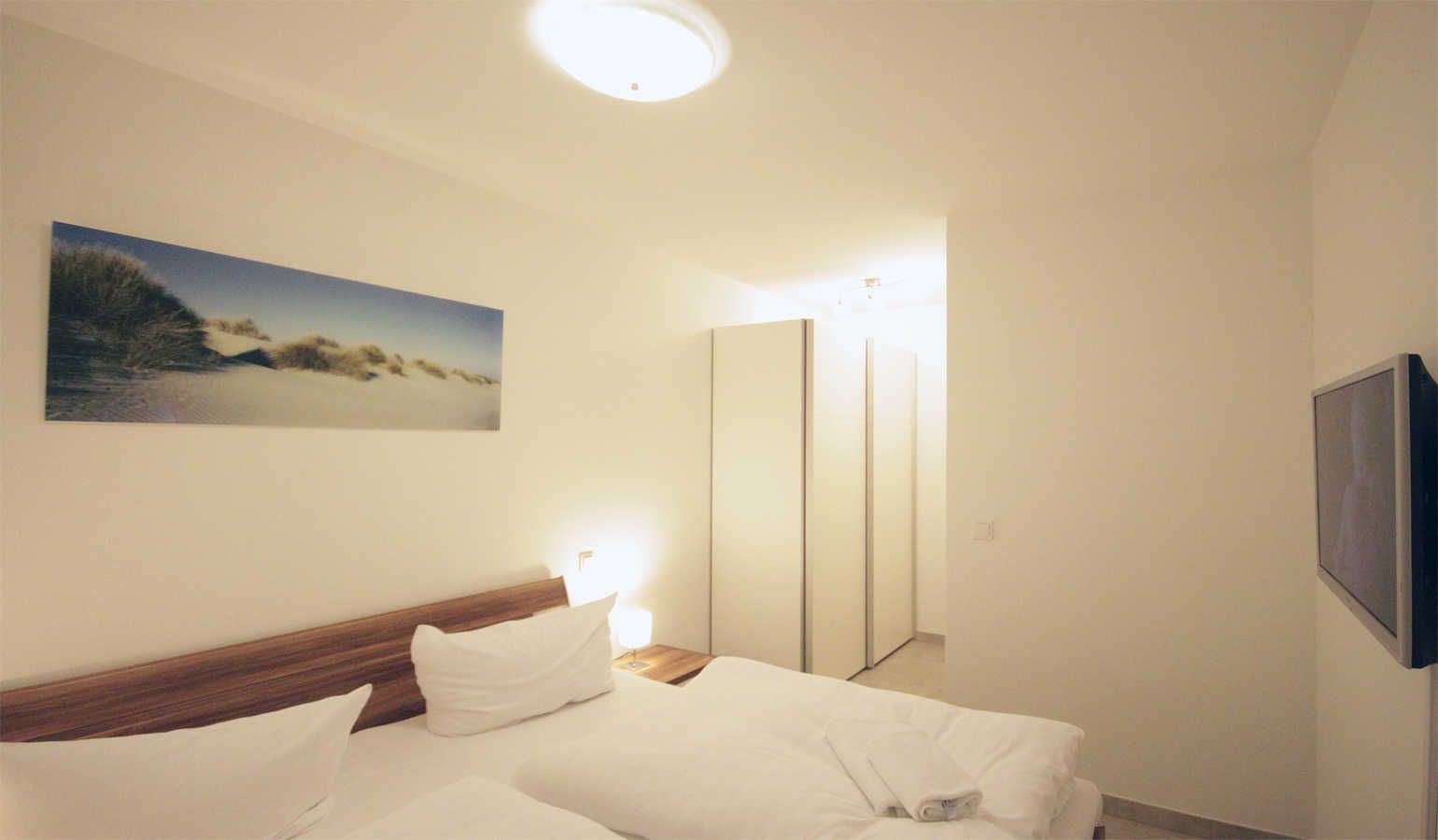 Vom Balkon aus ein Blick ins Grüne, der Strand in zwei Minuten erreichbar - die Ferienwohnung Am Strand ist eine schmucke Unterkunft im 1. Obergeschoss der Residenz Haus Meeresblick. Im Schlafzimmer mit einem extra Fernseher finden zwei Personen im Doppelbett Platz. Zwei weitere Gäste können das Schlafsofa im Wohn-/Essbereich nutzen. Die dort integrierte Küchenzeile ist modern ausgestattet mit einem Zwei-Plattenherd (Ceranfeld), einem Kühlschrank, einem Backofen, einer Mikrowelle, einer Geschirrspülmaschine, einem Toaster und Wasserkocher sowie einer Kaffeemaschine.