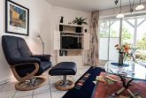 Rückenlehnen, einem Relaxsessel mit Hocker, kleinem Schreibtisch und im Raum