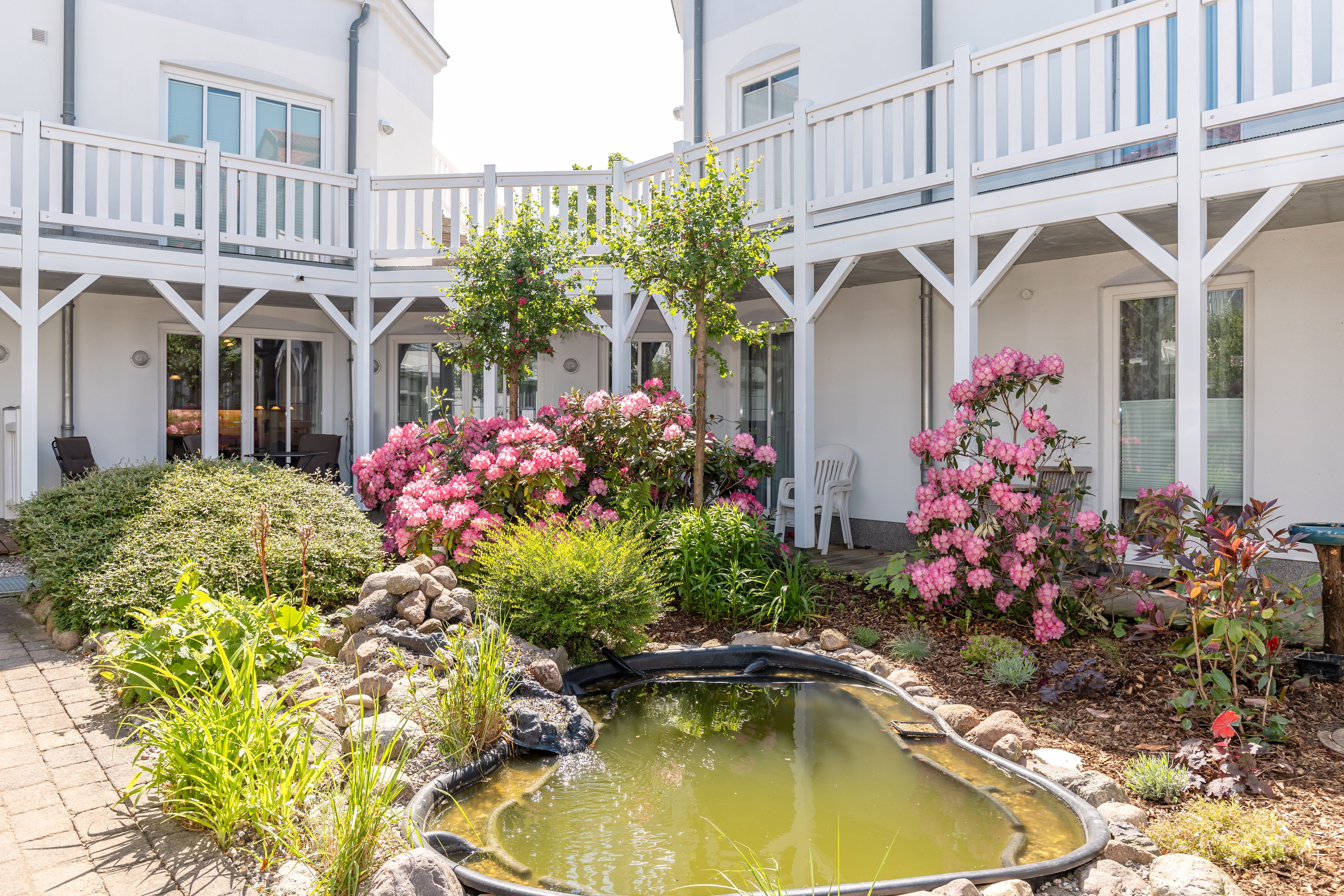 Gemeinschaftsgarten mit einem kleinen Goldfischteich, Büschen, Bäumen und