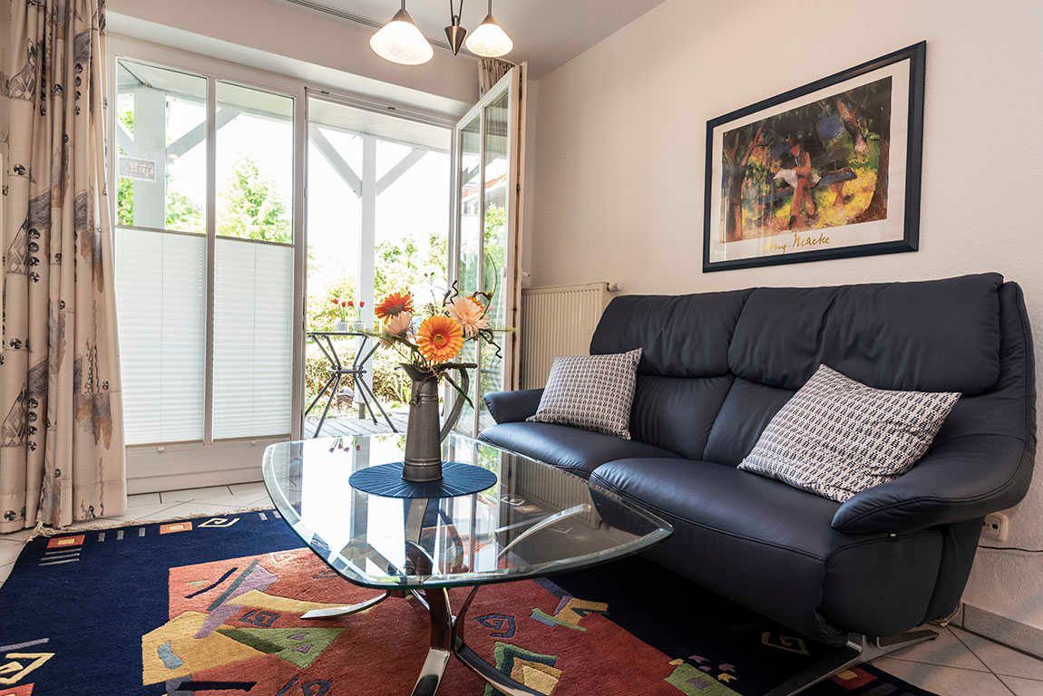 Der Wohnraum ist ausgestattet mit einem Ledersofa mit hohen