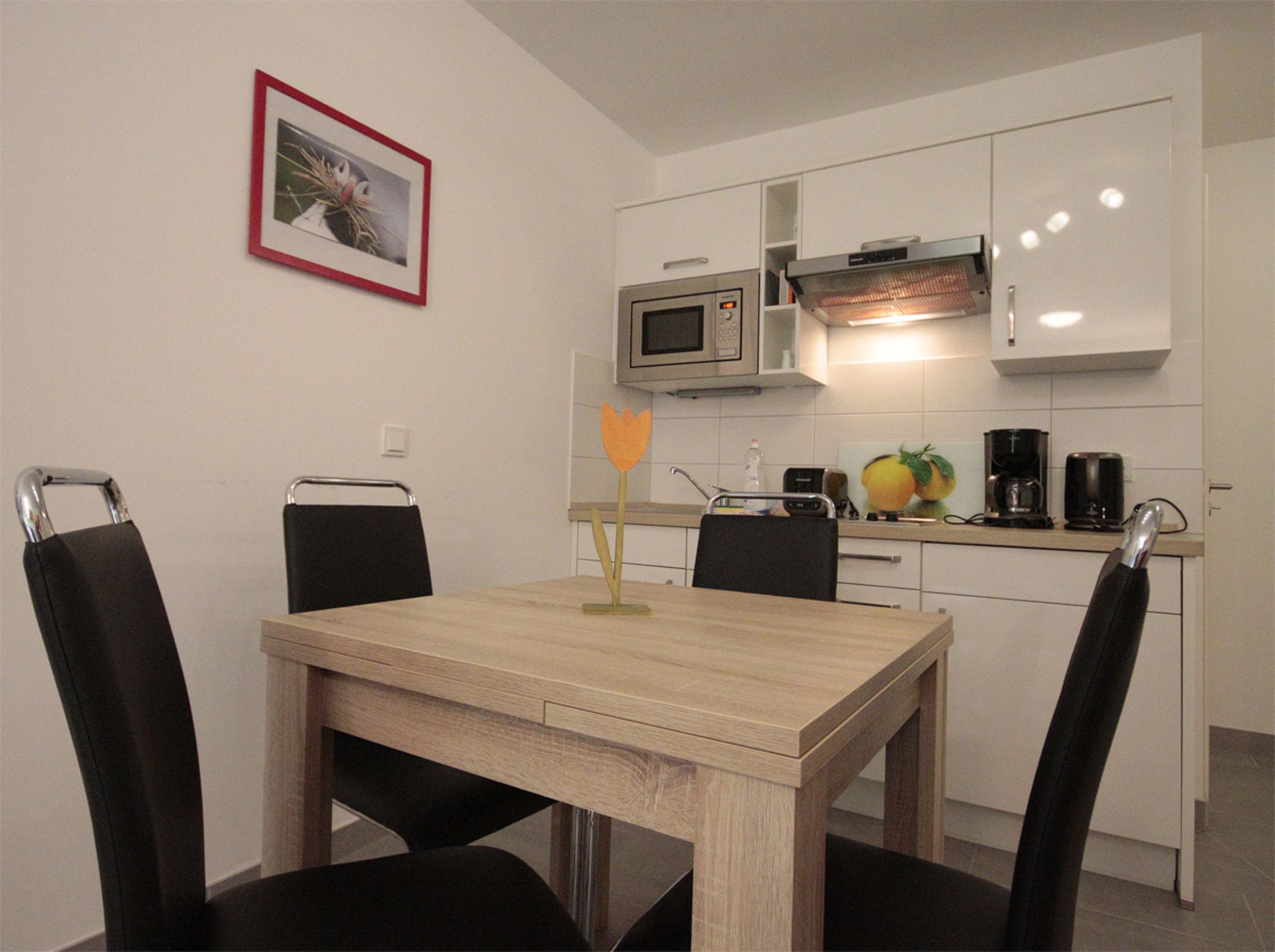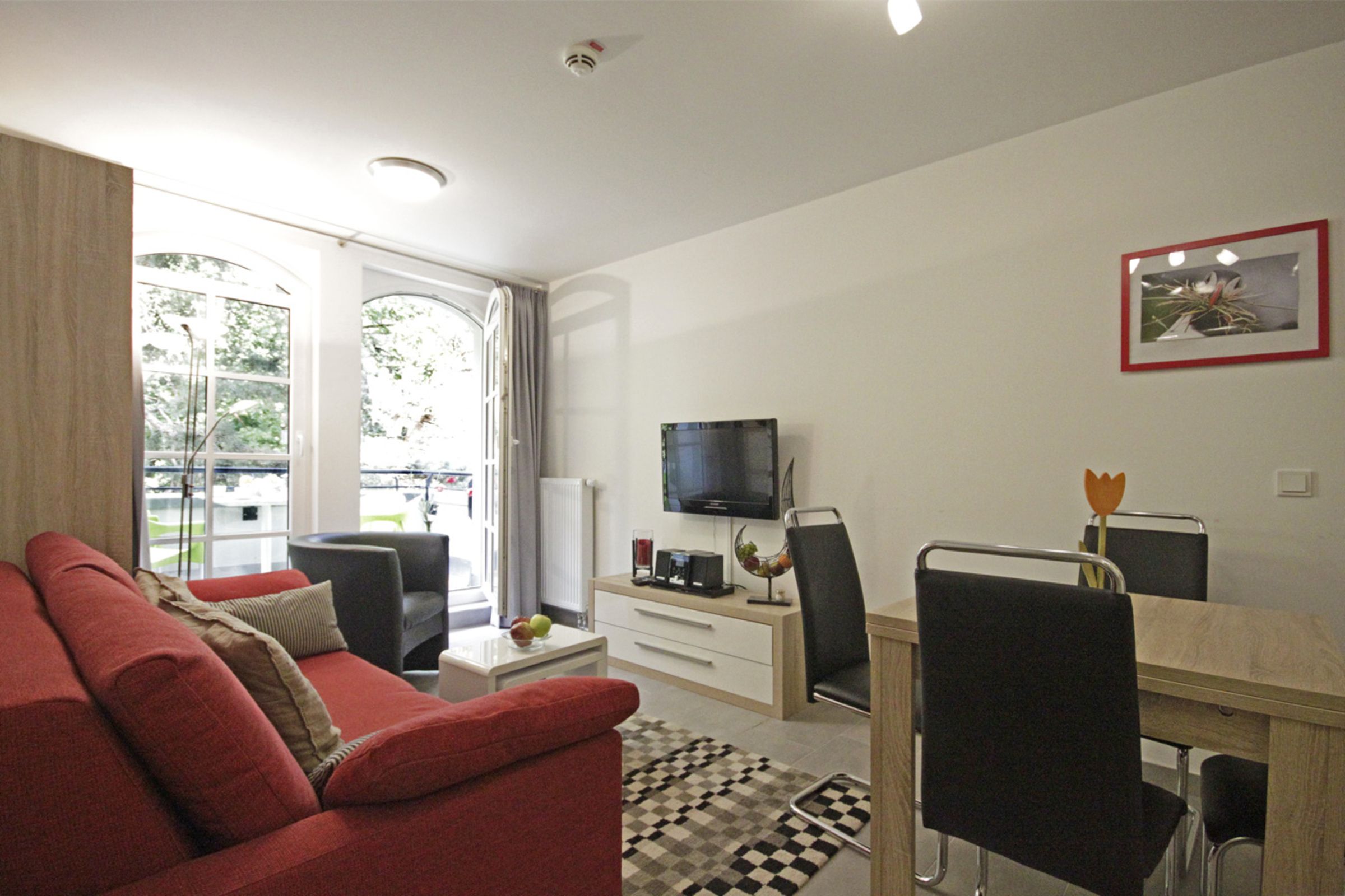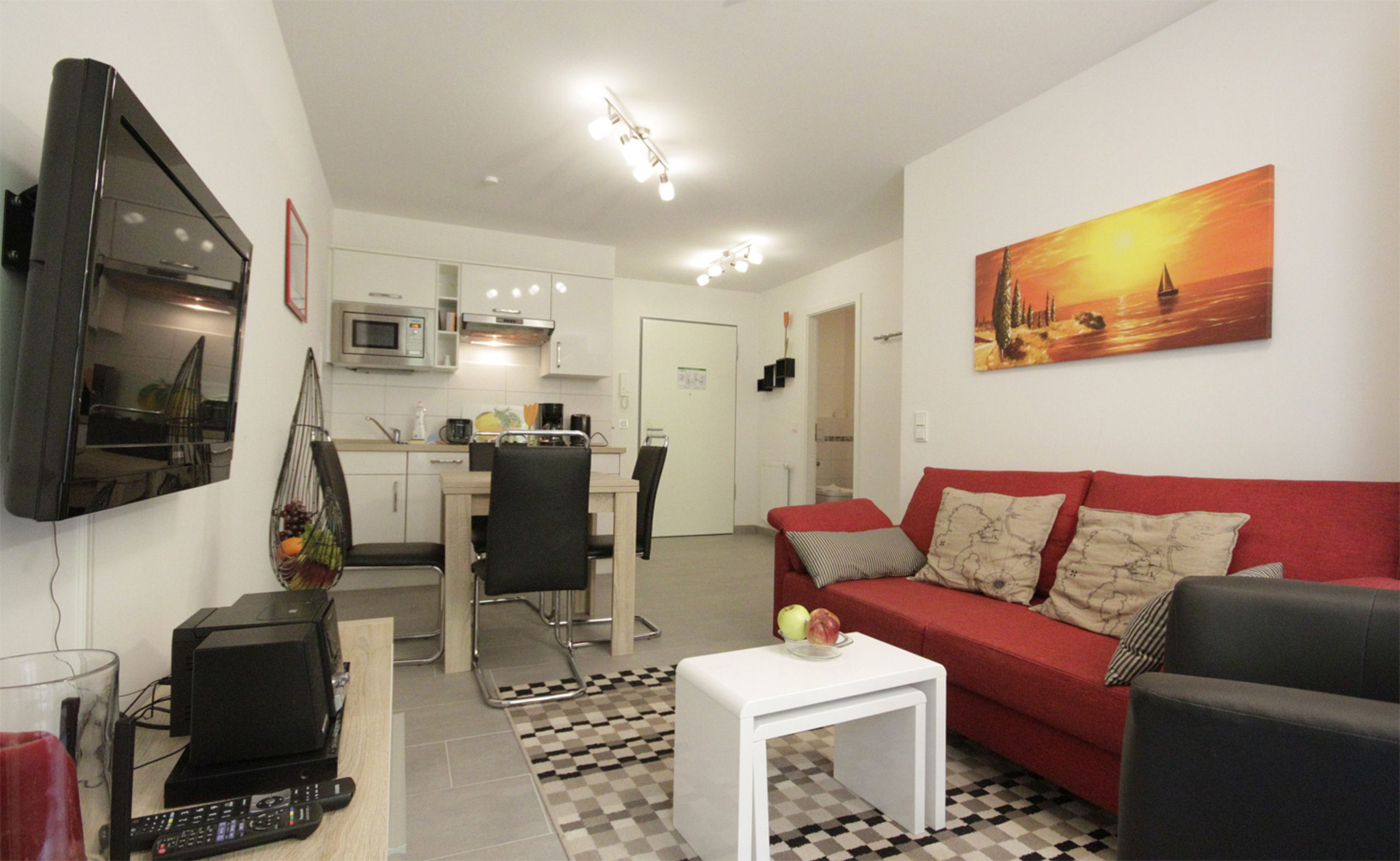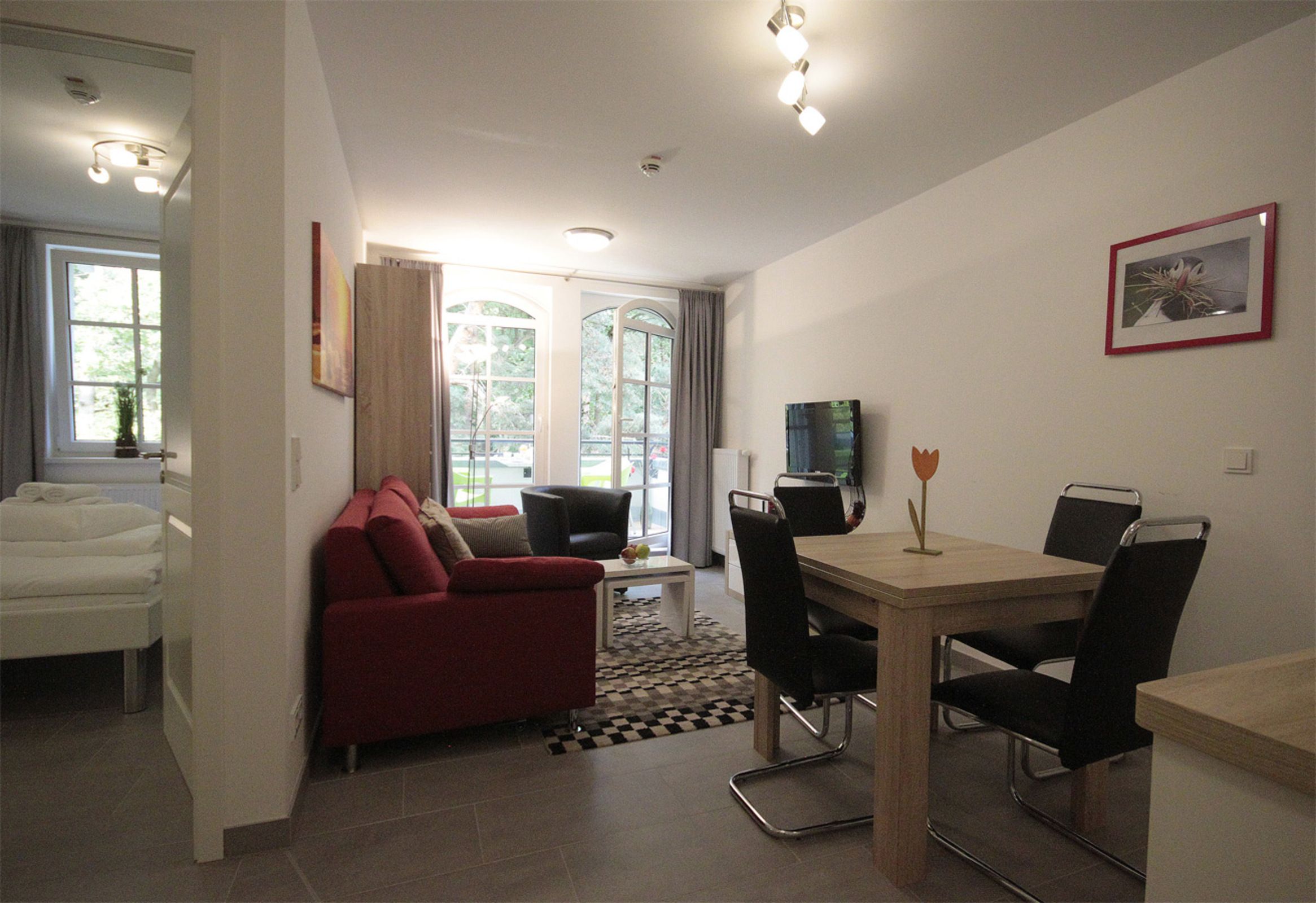 Die Räume bestehen aus Wohn-/Essbereich mit offener Küchenzeile und Schlafsofa für 2 Personen, Schlafzimmer mit Doppelbett, Badezimmer mit ebenerdiger Dusche und Abstellraum im Eingangsbereich.