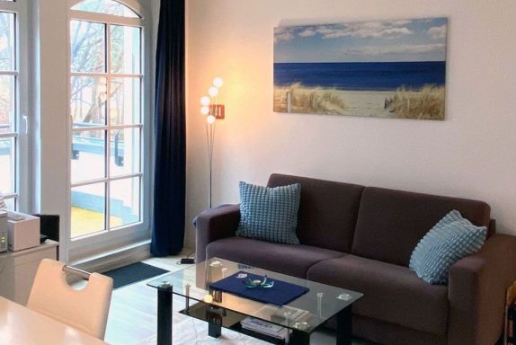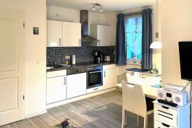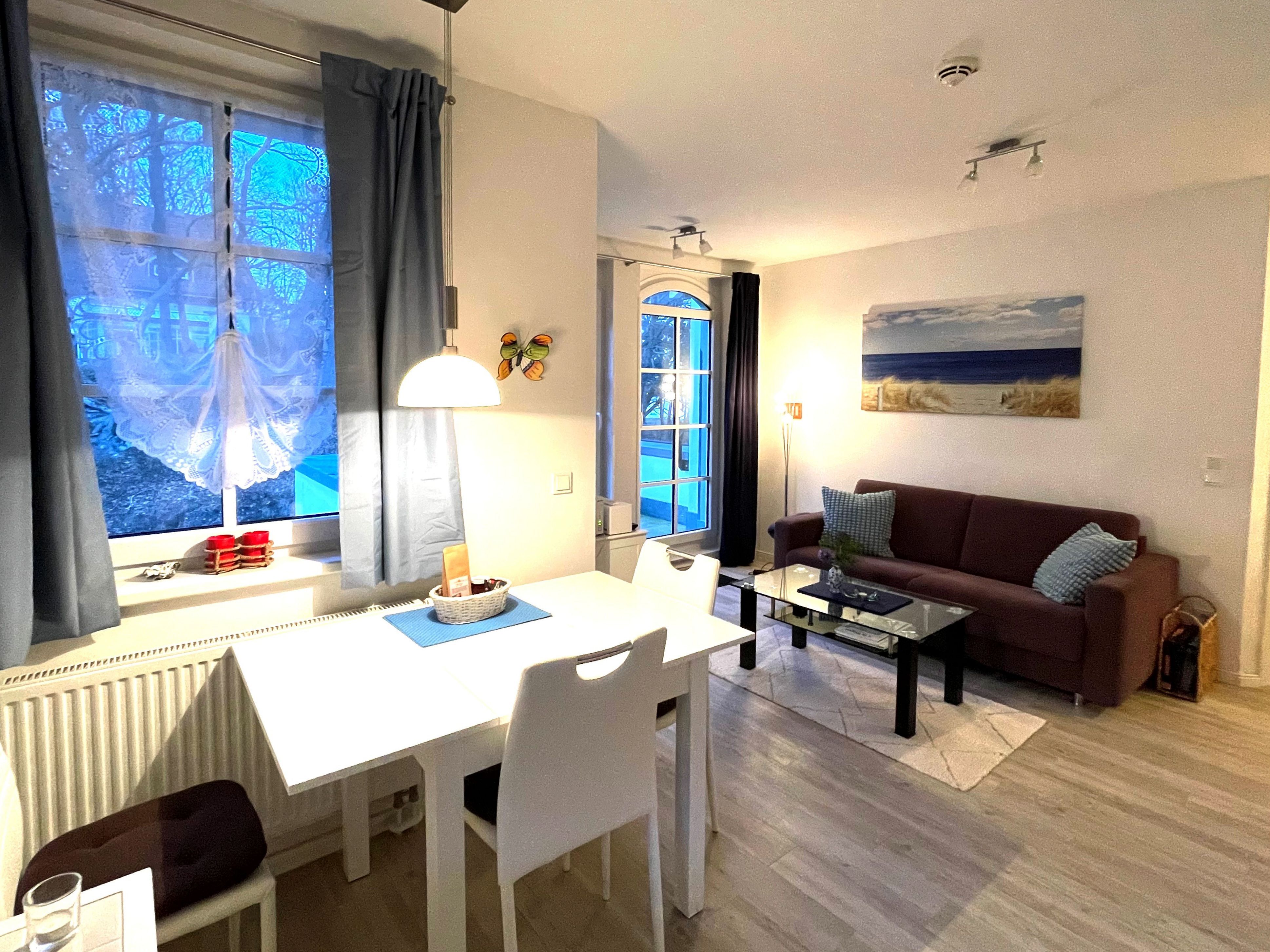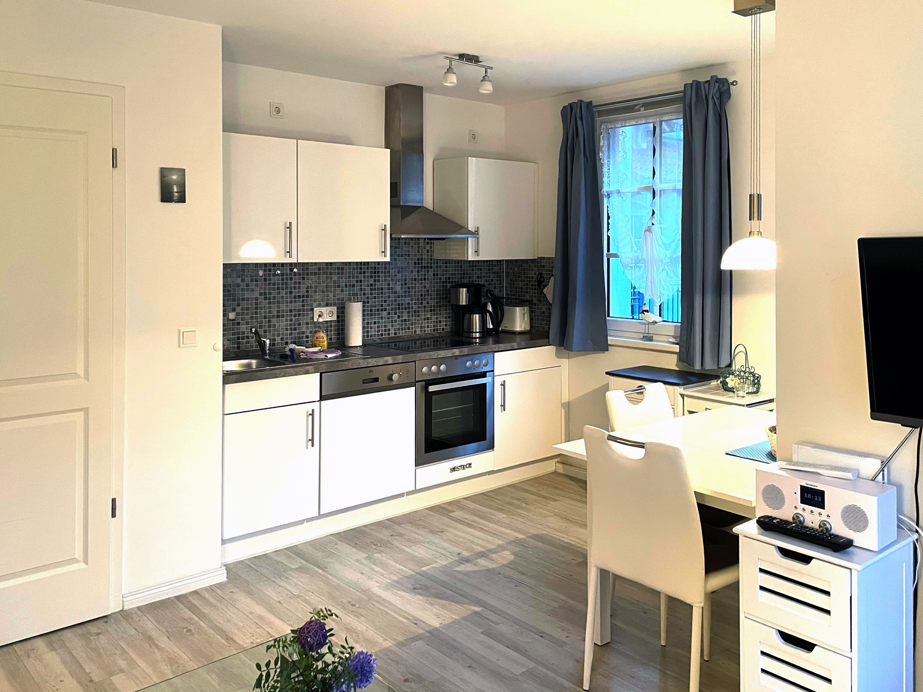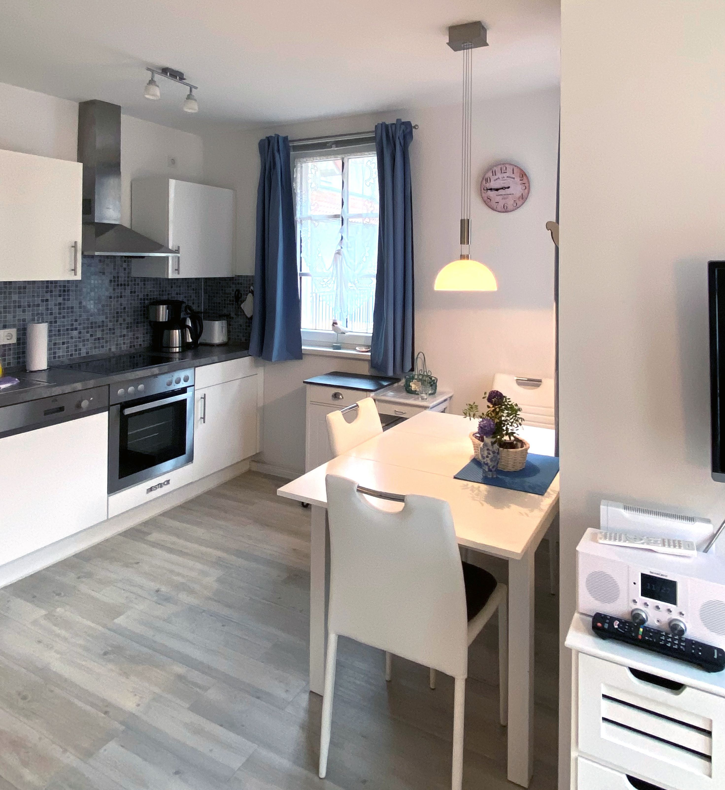 Die Ferienwohnung Seeschwalbe hat einen kombinierten Wohn- und Essbereich mit einer harmonisch integrierten Küchenzeile. Ein bequemes Sofa zum Entspannen sowie ein Fernseher, ein Radio und kostenfreies WLAN stehen Ihnen selbstverständlich zur Verfügung.