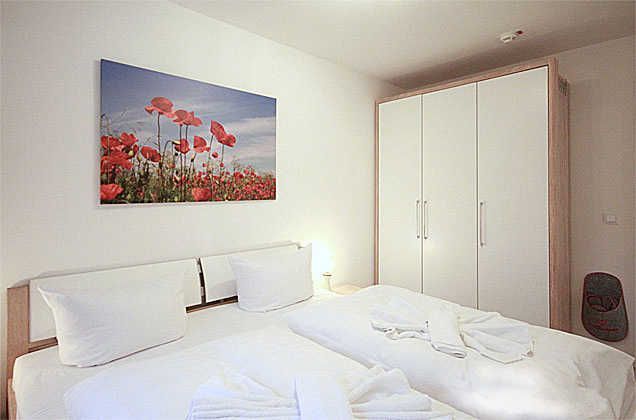 Das separate Schlafzimmer ist mit einem Doppelbett und einem Kleiderschrank eingerichtet.