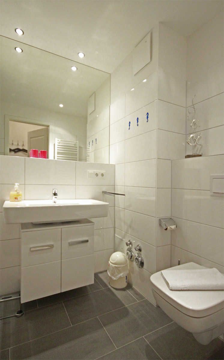 Das Bad verfügt über eine ebenerdige Dusche, Waschbecken und WC.