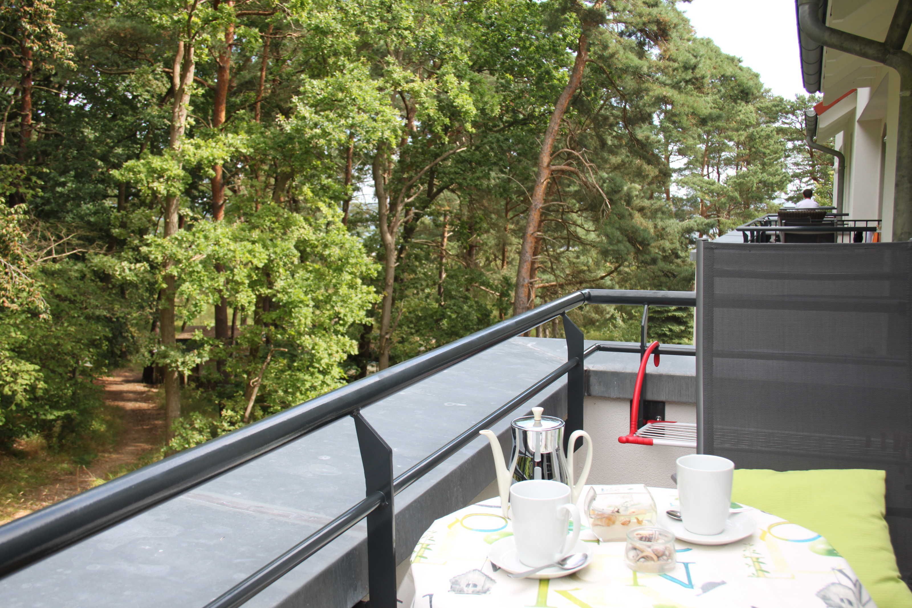 Von Ihrem Balkon genießen Sie einen seitlichen Meerblick und schauen über die Dünen und durch das Kiefernwäldchen bis zum Meer.