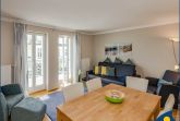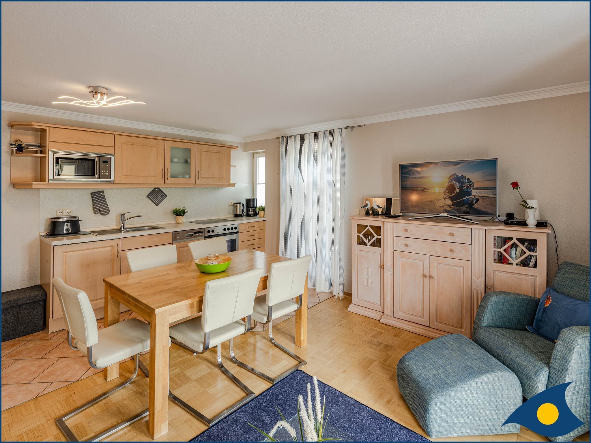 Das Wohnzimmer bildet das Herzstück des Appartements. Durch die teilweise bodentiefen Fenster und den modernen Möbeln genießen Sie hier das morgendliche Frühstück, planen Ihre Ausflüge oder lassen den Tag auf dem gemütlichen Sofa ausklingen. Die vollausgestattete Küchenzeile lädt zum gemeinsamen Kochen ein.