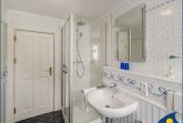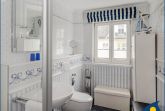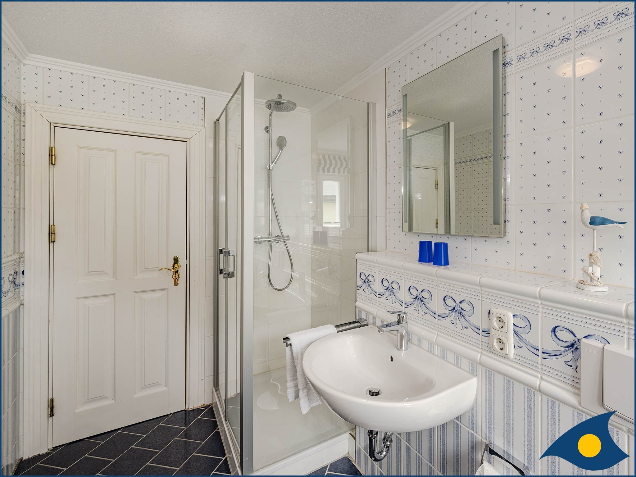 Das Badezimmer ist mit einem WC, einem Handwaschbecken und einer Dusche ausgestattet.