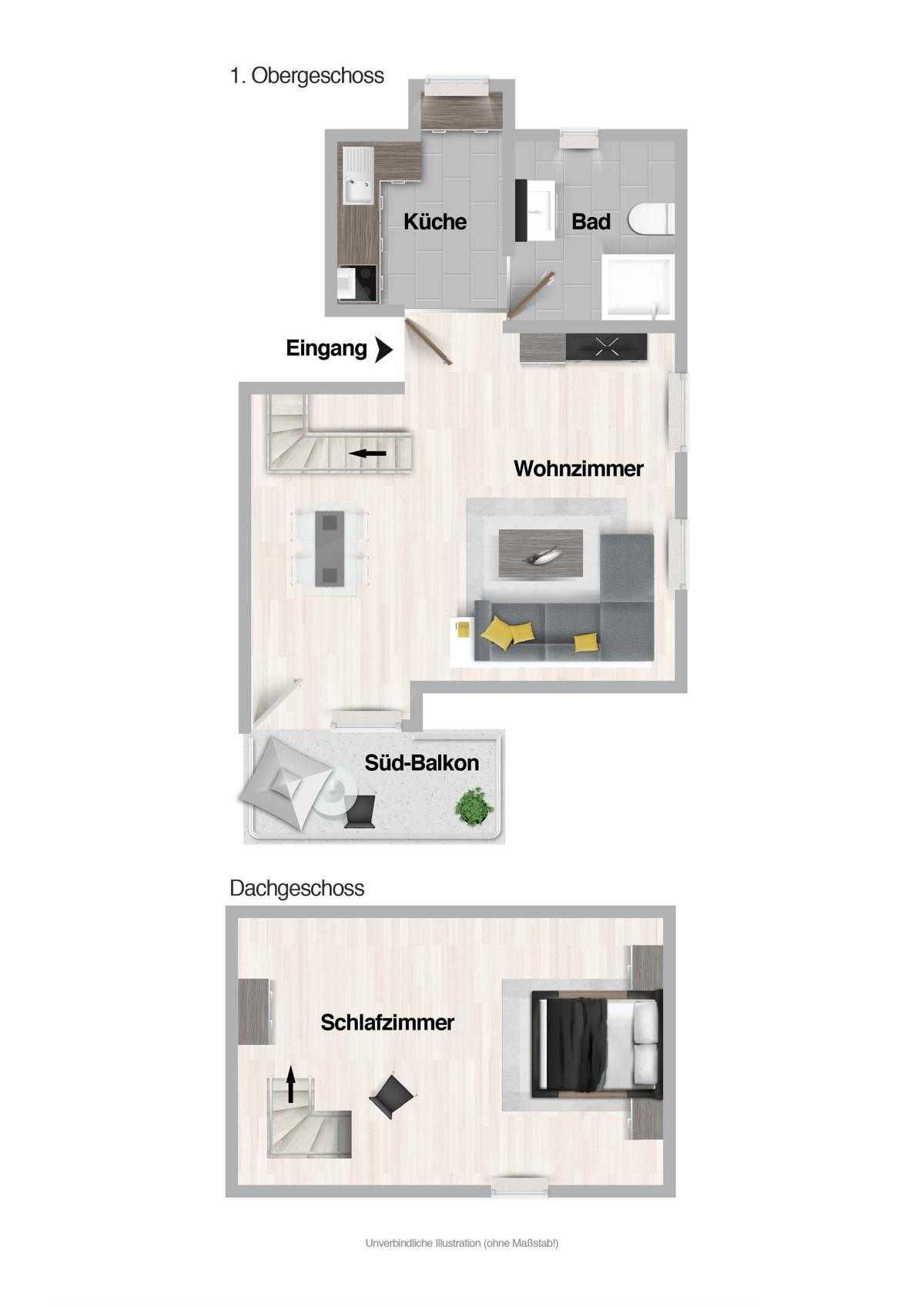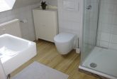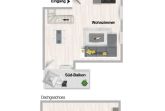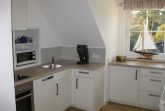 Sie bietet auf 50 qm einen großzügigen Wohn/ Essbereich mit offener weißer Einbauküche, ein helles Duschbad mit Fenster, große Dusche mit Echtglas, Kopf und Seitenbrause. Das Schlafzimmer ist über eine innenliegende Holztreppe vom Wohnbereich zugänglich.