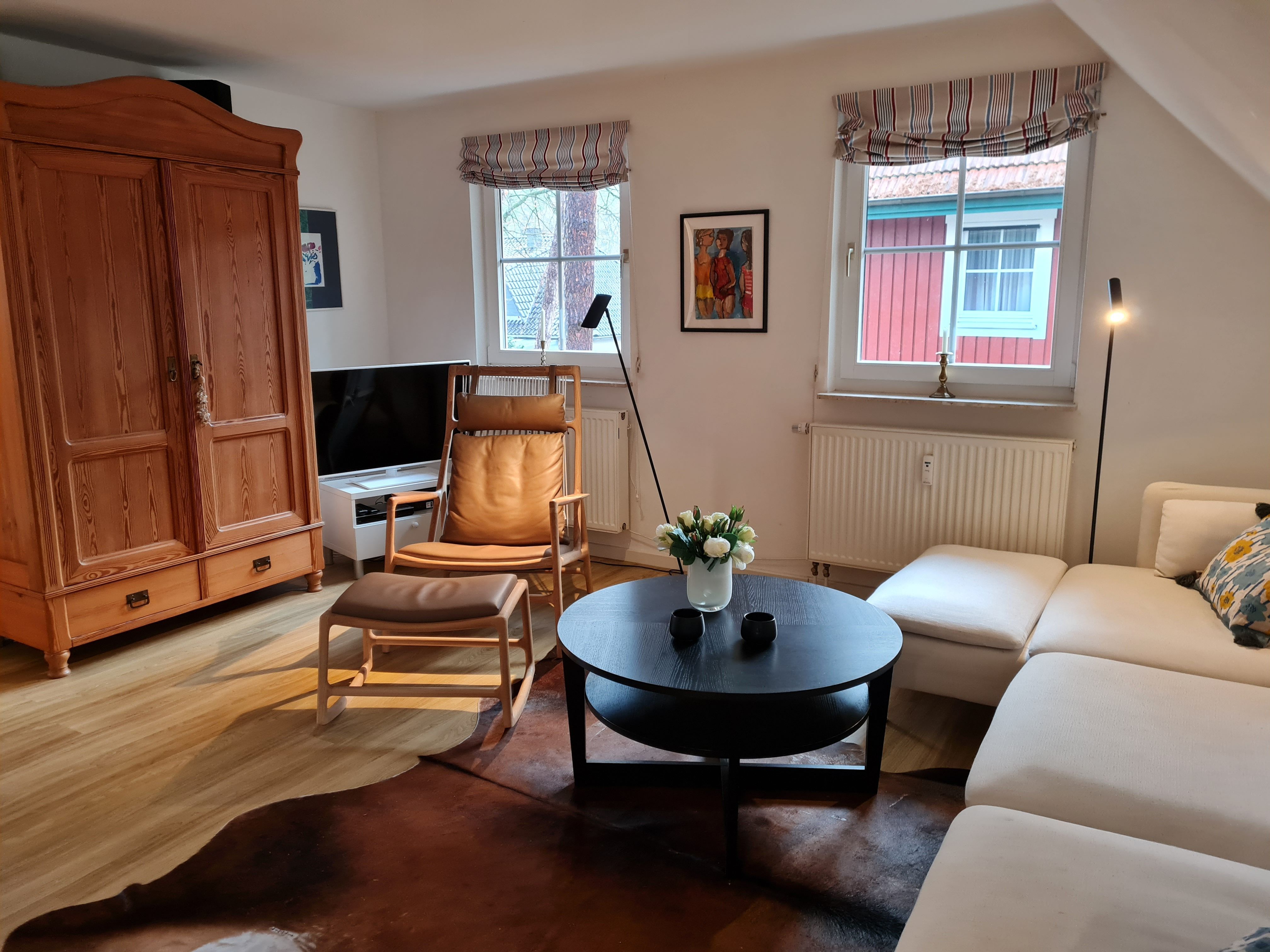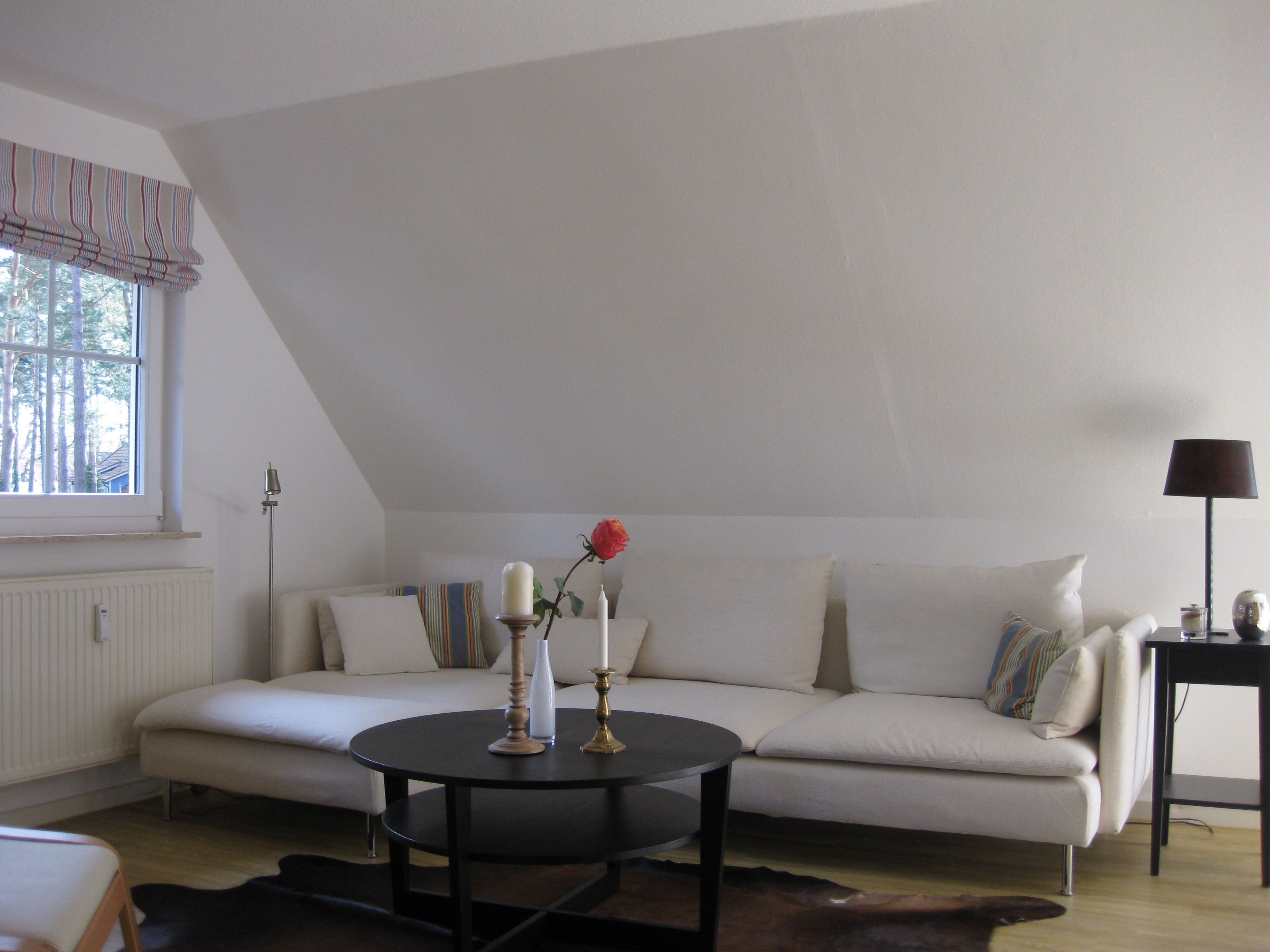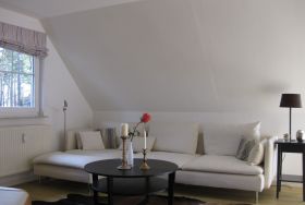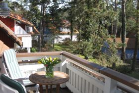 Herzlich willkommen in der Ferienwohnung „ Strandlust „ Die geschmackvoll eingerichtete Maisonettewohnung befindet sich in absolut ruhiger Lage, umgeben von Pinien und liegt direkt hinter dem Deich im 1.Obergeschoß eines modernen Ferienhauses und lässt keine Wünsche offen. Sie bietet auf 50 qm einen großzügigen Wohn/ Essbereich mit offener weißer Einbauküche, ein helles Duschbad mit Fenster, große Dusche mit Echtglas, Kopf und Seitenbrause. Das Schlafzimmer ist über eine innenliegende, raumsparende Holztreppe vom Wohnbereich zugänglich. Wachen Sie morgens auf und genießen Sie Ihr Frühstück auf dem großen Südbalkon mit Blick ins Grüne. Die Wohnung ist 2014 komplett neu eingerichtet, Küche mit Ceranfeld, Backofen, Mikrowelle, Geschirrspüler, Kühlschrank mit Gefrierfach, Kaffeeautomat. Außerdem stehen ein großer Flachbildschirm mit SAT-TV, Radio/CD Player sowie bequeme Balkonmöbel, ein Abstellschuppen und ein eigener PKW-Stellplatz vor der Wohnung zur Verfügung. Zum feinsandigen Ostseestrand gehen Sie wenige Minuten über eine Brücke am Prerow Strom. In unmittelbarer Nähe der Wohnung befinden sich einige gute Restaurants und Cafes. Einkaufsmöglichkeiten und Bäcker im Ortskern sind fußläufig in 10 Minuten erreichbar. Für sportbegeisterte Feriengäste gibt es einen Fahrradverleih und einen Nordic Walking Parcour in direkter Nachbarschaft. Surf/ Kiteboard und Bootsverleih am Strand. Die Haltestelle für Kutschfahrten ist in 300 m Entfernung. Es besteht die Möglichkeit, den Wellnessbereich und den Innen-und Außenpool eines benachbarten Hotels gegen Gebühr zu benutzen. Der Nationalpark „ Vorpommersche Boddenlandschaft lädt auf der anderen Strassenseite zu herrlichen Wanderungen und Fahrradtouren an den naturbelassenen Weststrand ein.