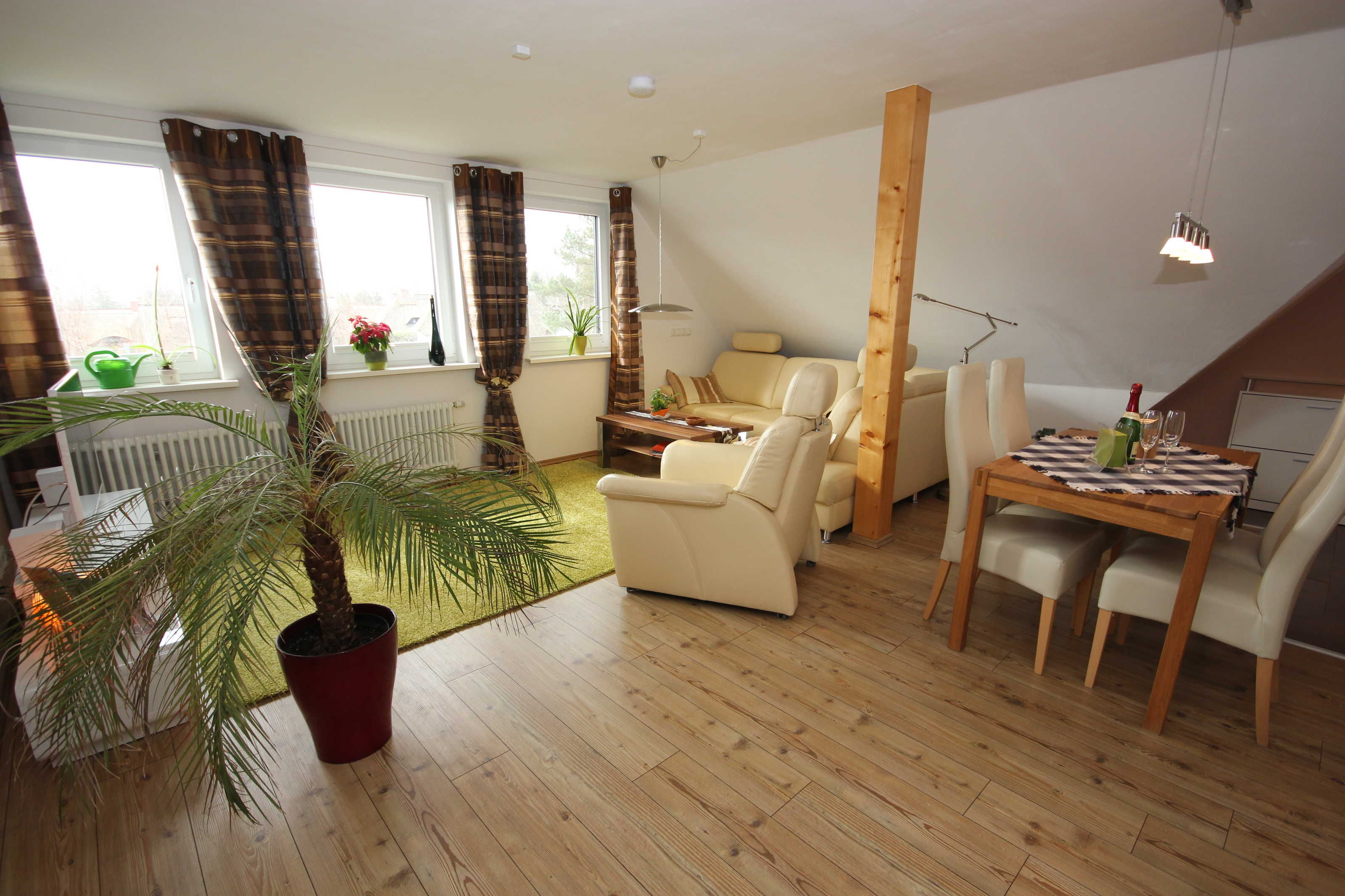 die komfortabel eingerichtete 4 Sterne Ferienwohnung Möwennest befindet sich im Obergeschoss in einer ruhigen und zentralen Lage und bietet Platz für 2 - 3 Personen.Sie verfügt über einen separaten Eingang über die Dachterrasse. Die Dachterrasse mit den Balkonmöbeln laden zum Verweilen ein.
