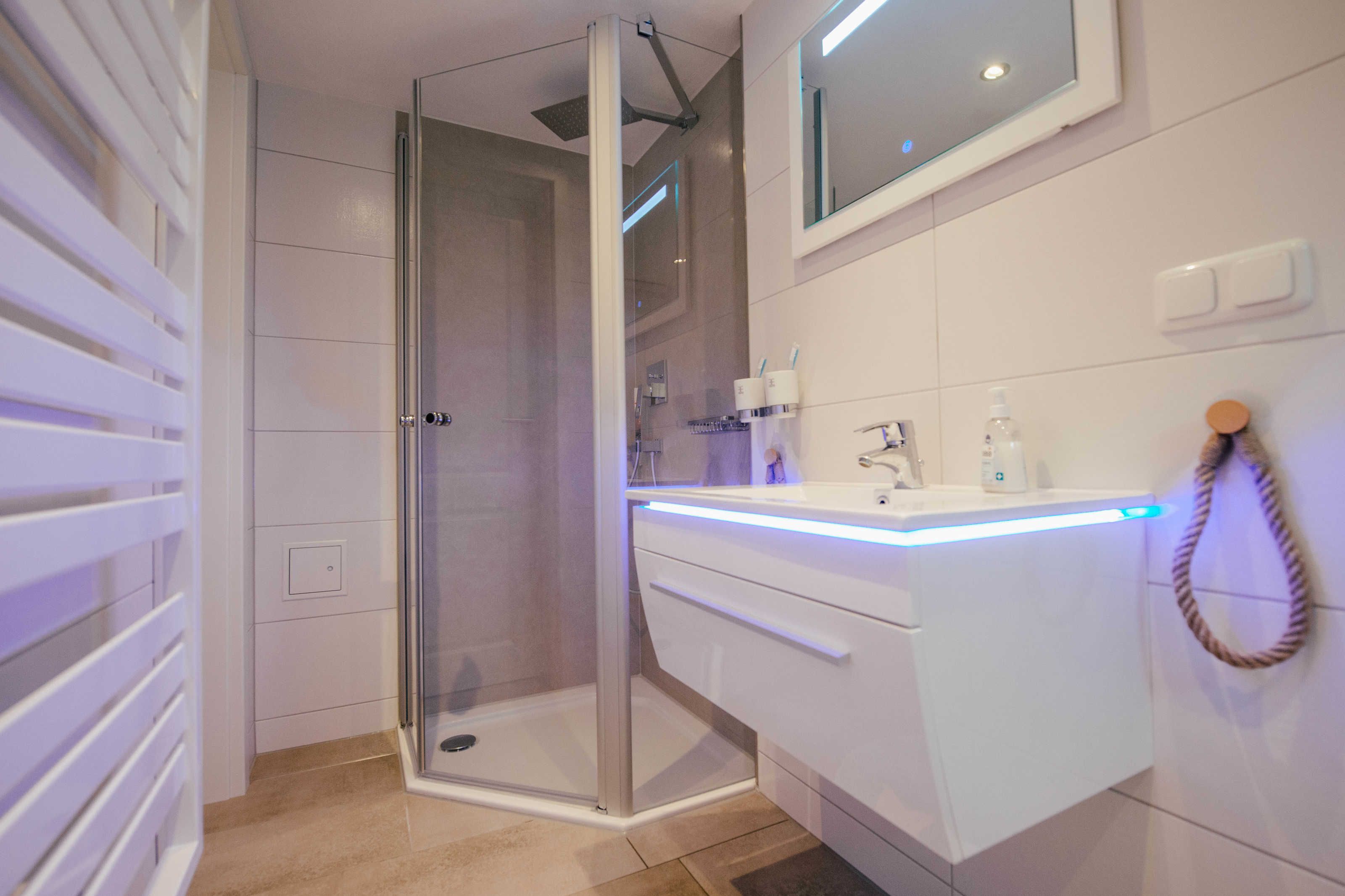 Das Badezimmer mit Dusche und WC ausgestattet.