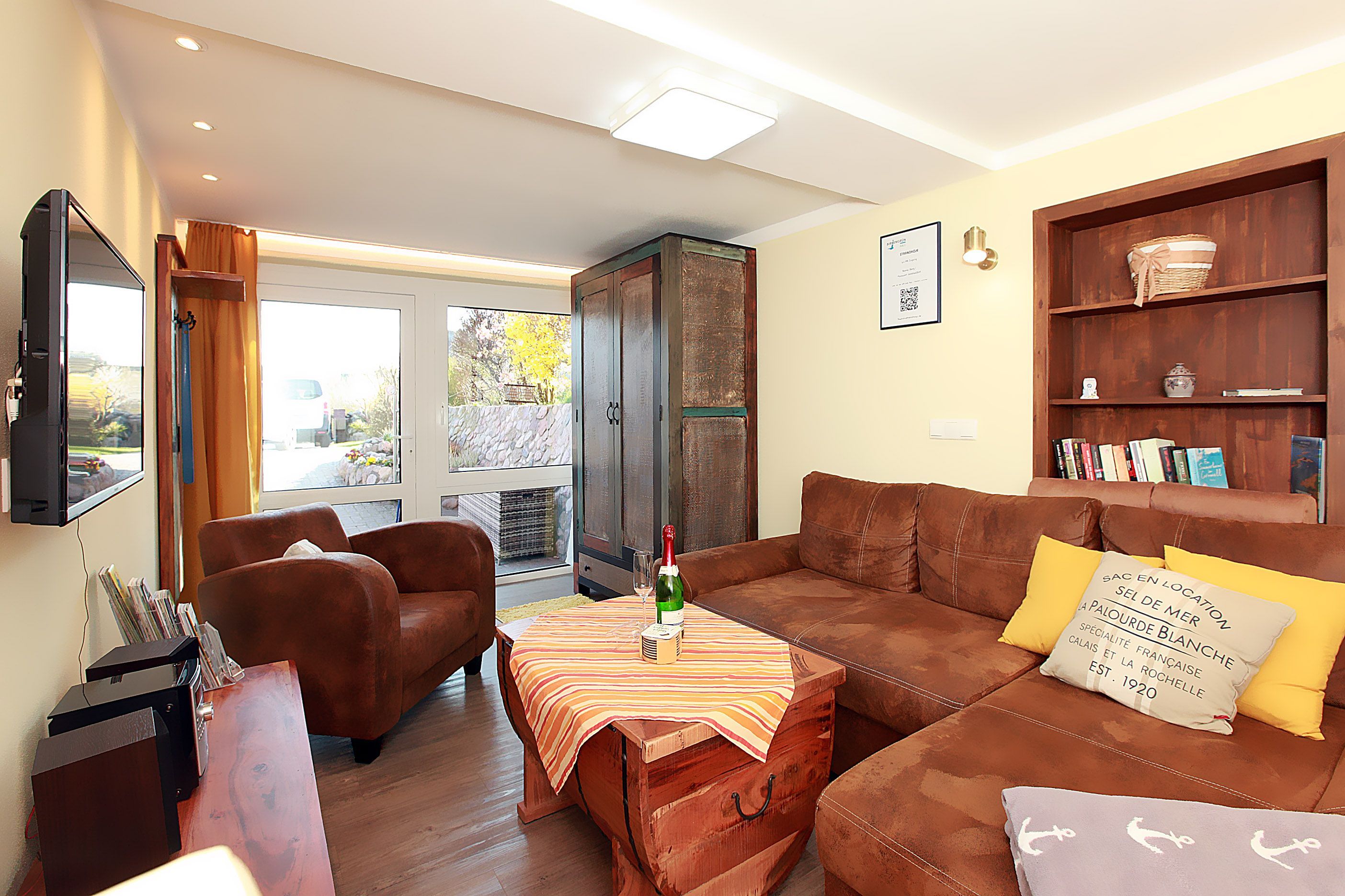 Der Wohnbereich ist ausgestattet mit einem SAT- TV, Radio und WLAN- Gästezugang.