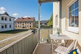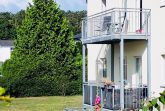 Ein sonniger Balkon mit einer grünen Wiese im Vordergrund lädt Sie zum Verweilen ein.