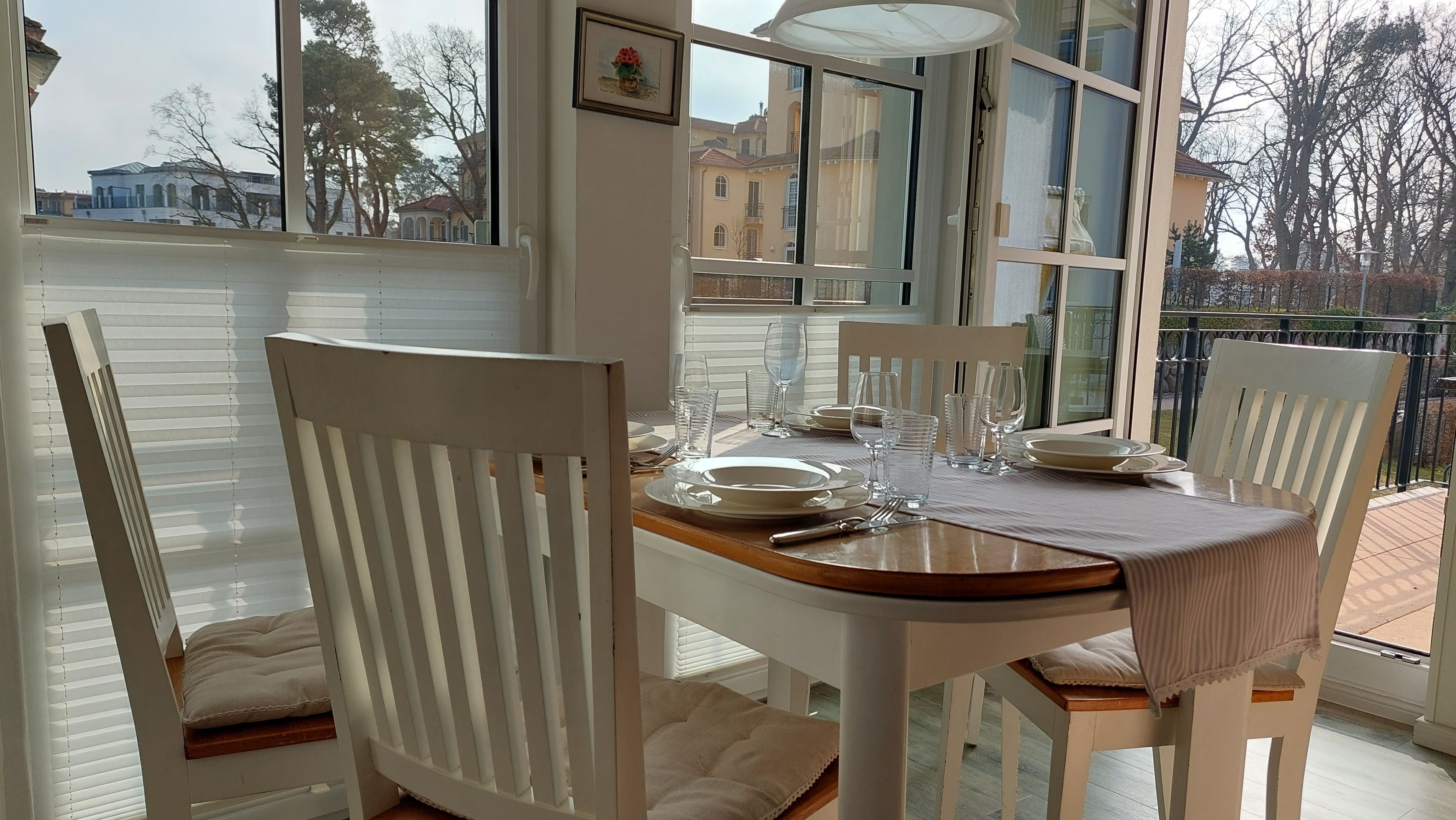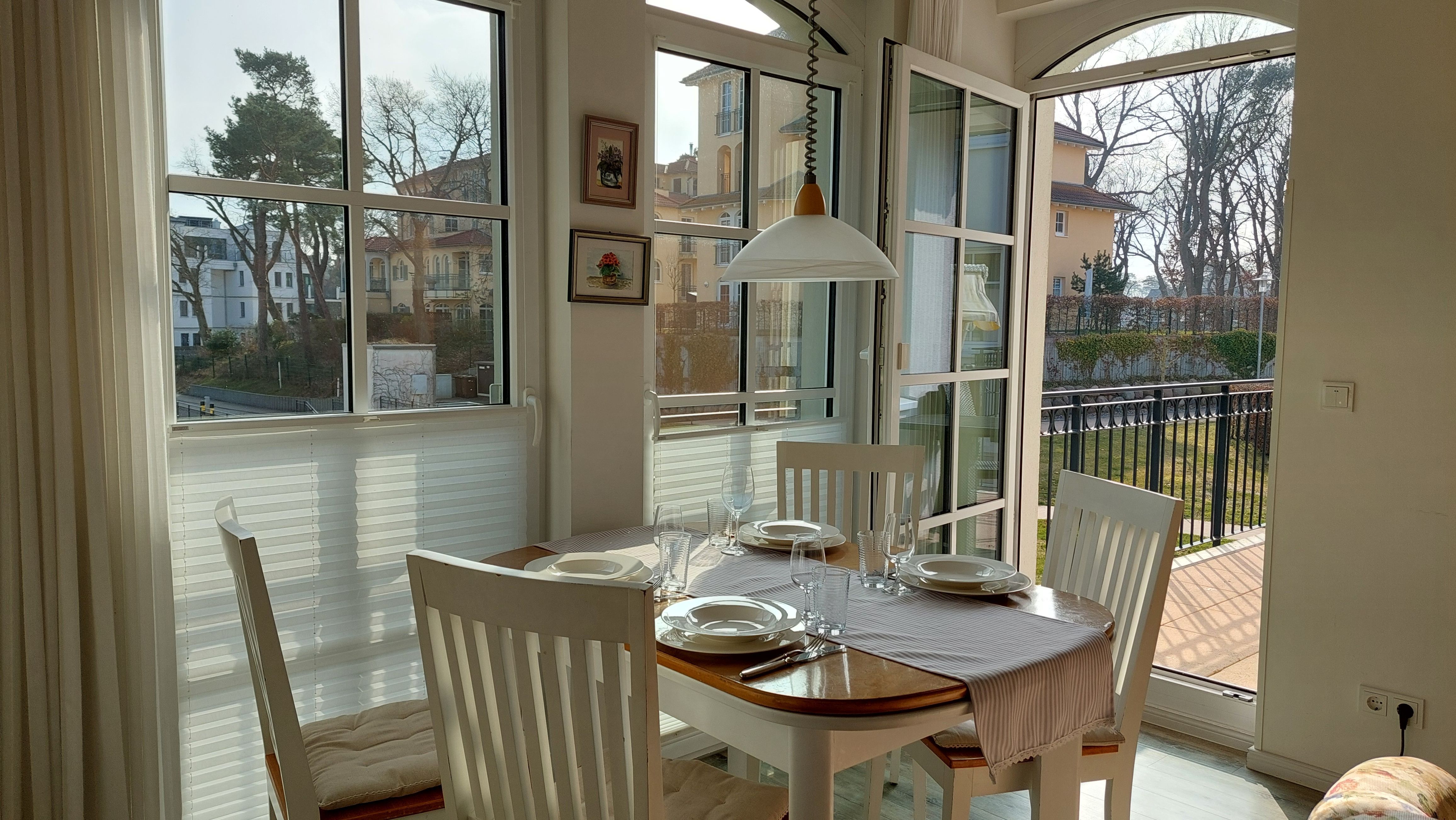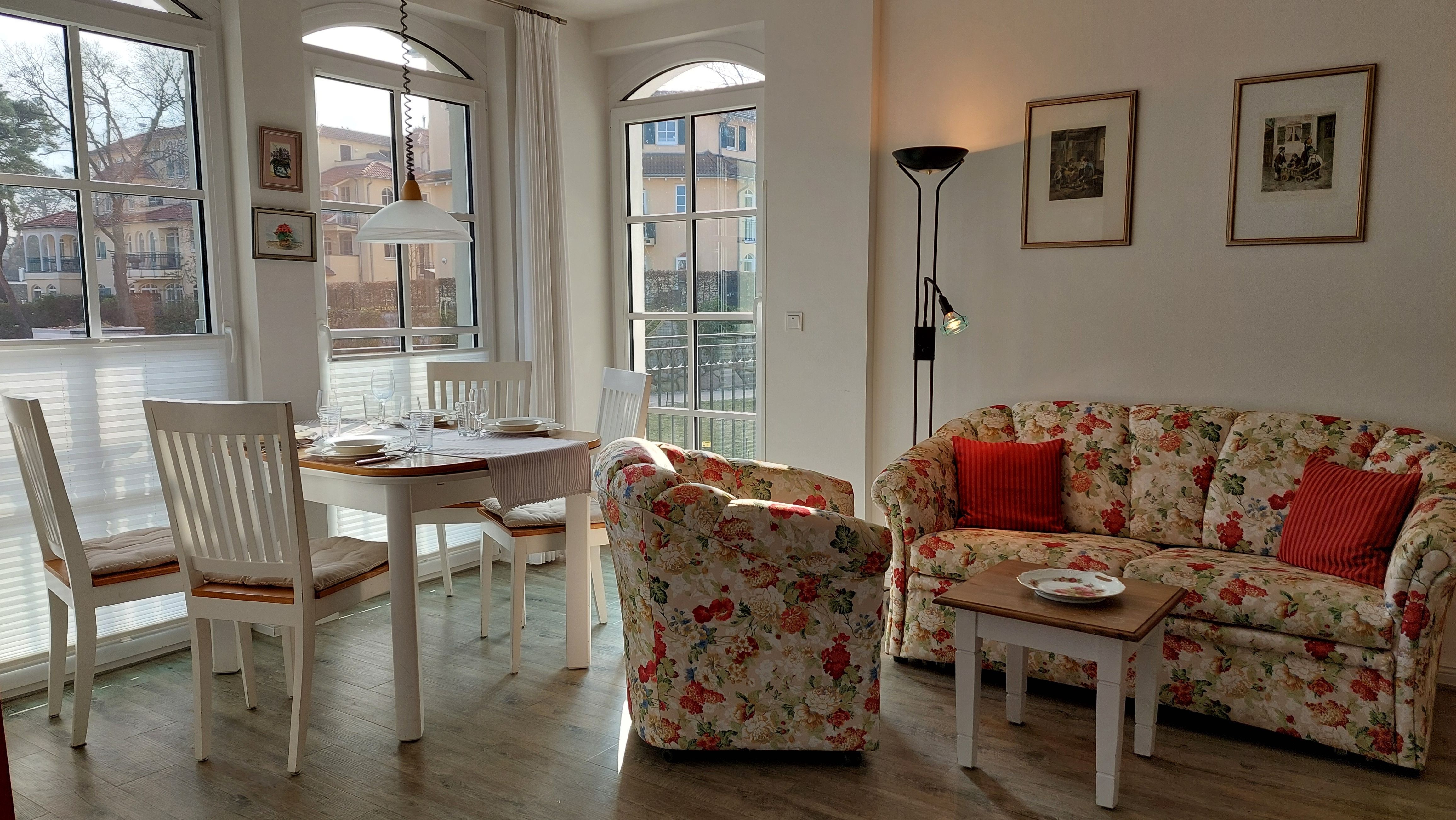 Sonnige Ferienwohnung für 2 - 3 Personen mit 2 Schlafzimmern und schönen möbliertem Balkon mit Blick zum Kurpark, WLAN vorhanden. Die Ferienwohnung liegt in der 1. Etage des  Hauses. Das erst 2013 neu eröffnete Haus Meeresblick mit Schwimmbad, Massage- und Saunabereich liegt direkt am Strand von Baabe.