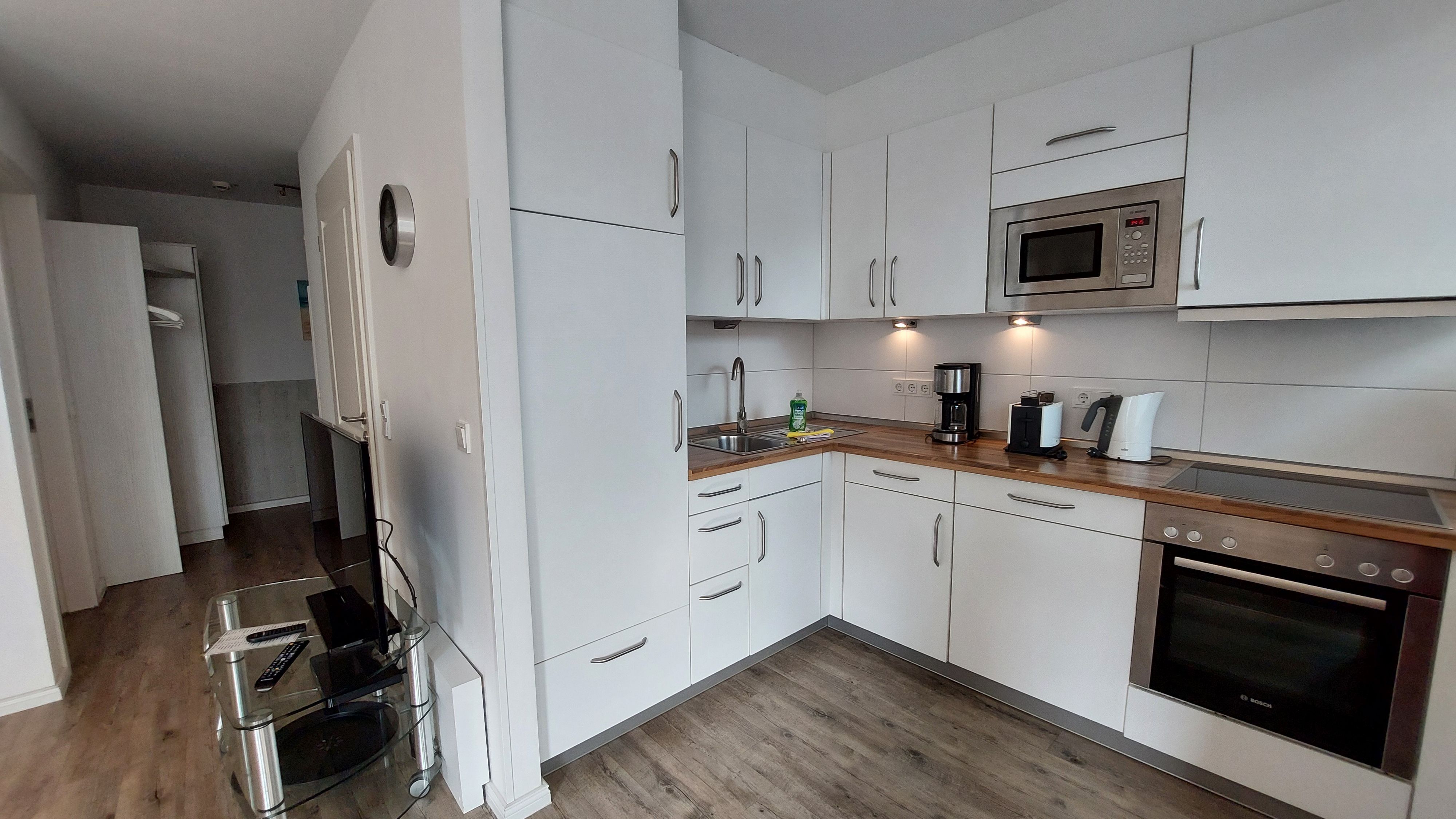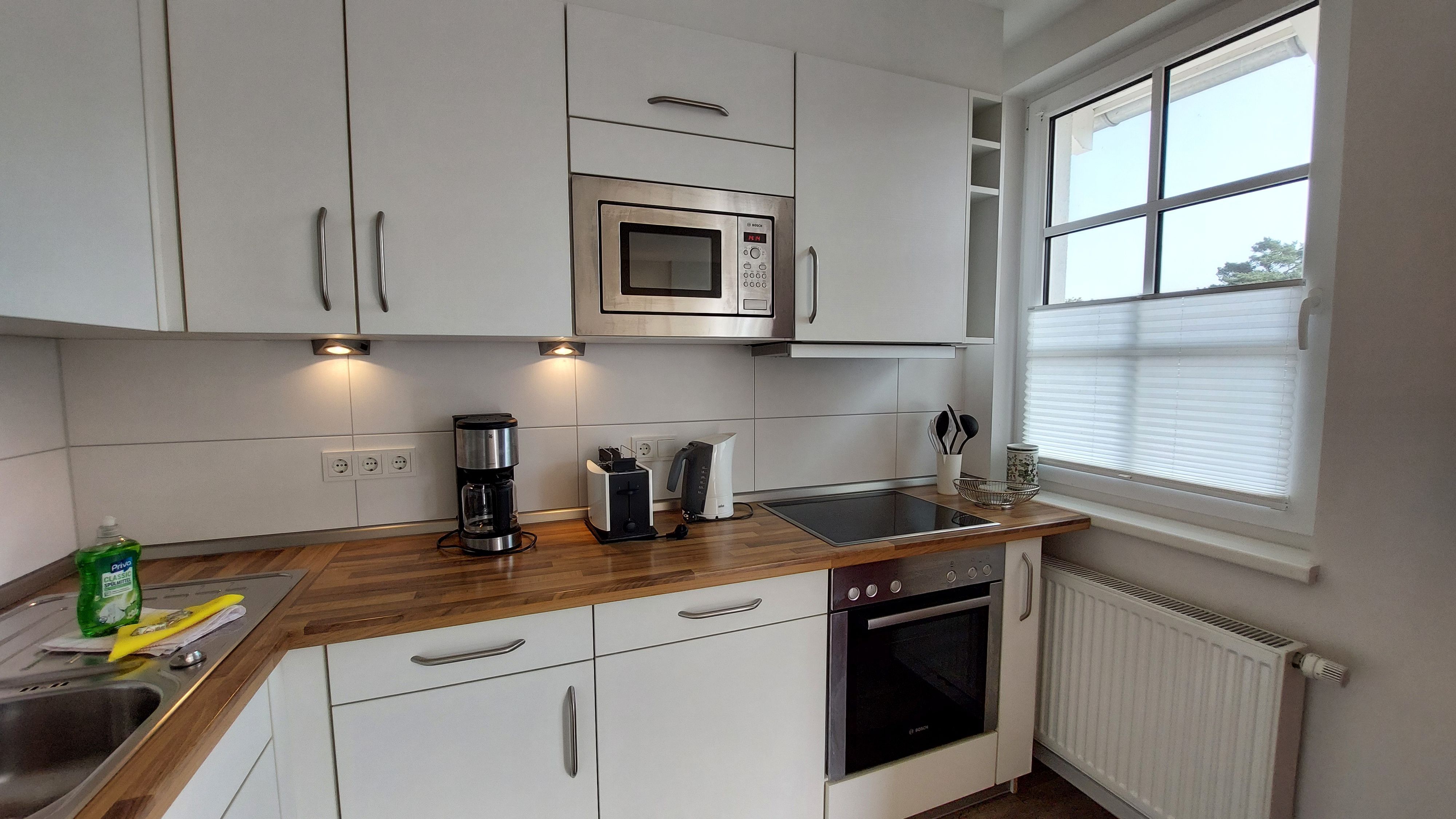 Großzügig geschnitten und ausgestattet ist die Küchenzeile mit einem 4-Plattenherd inklusive Backofen, einem Kühlschrank mit Gefrierfach, einem Geschirrspüler, Mikrowelle, Toaster und Kaffeemaschine.