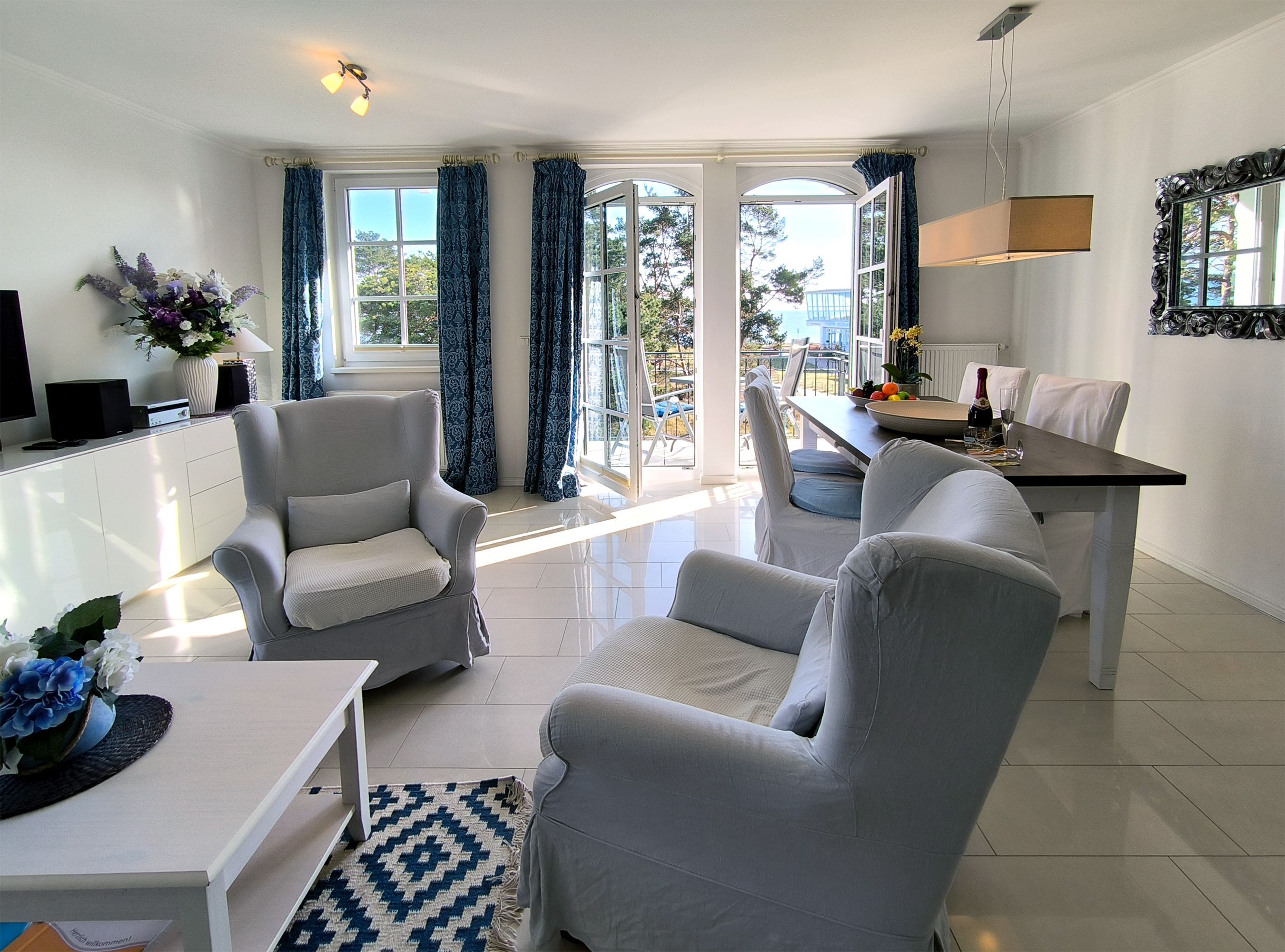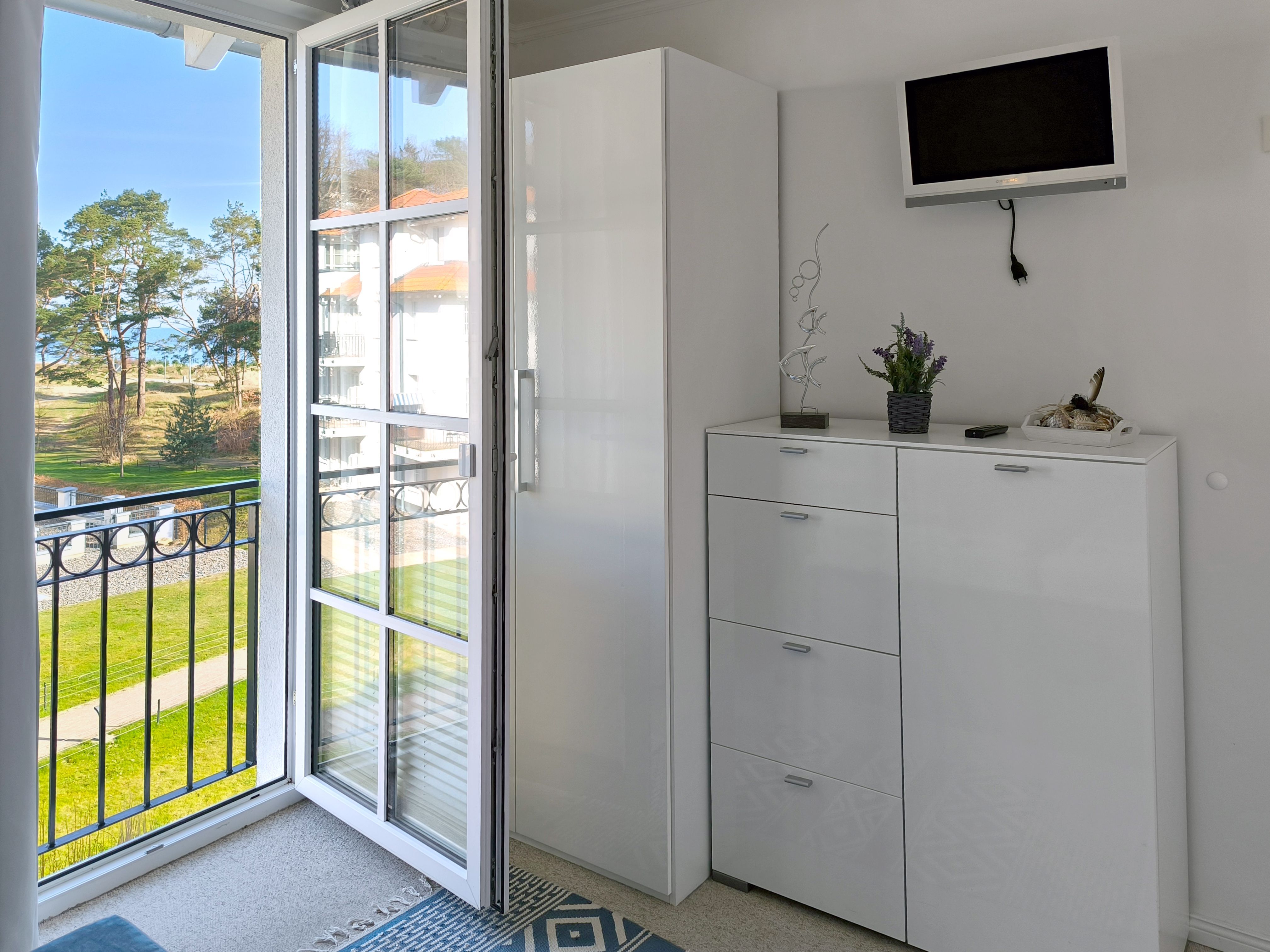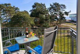 Meerblick, Eckbadewanne und 65 Quadratmeter Wohnfläche: Die Nichtraucher-Ferienwohnung Strandlöper in der 2. Etage der Residenz Haus Meeresblick lässt in Sachen Komfort wohl keinen Wunsch offen. Die 2-Zimmerunterkunft mit französischem Flair liegt in einem Villenhaus (Nebenhaus C), das zur Ferienanlage gehört. Vom Balkon aus schauen Sie bis zur Ostsee und den Müther-Bau am Strand. Das Schlafzimmer hat ein Doppelbett, Nachtkonsolen, einen Kleiderschrank sowie einen Flachbild-TV. Im Wohnbereich stehen außerdem eine Sitzgruppe, ein weiterer Fernseher, ein Radio und ein CD-Player für Sie bereit. Die separate Küche ist ebenfalls gut ausgestattet. Sie hat einen 4-Plattenherd mit Blitzkochzonen, einen Mikrowellen-Kompaktbackofen, einen Geschirrspüler, einen Kühlschrank mit Gefrierfach sowie Kaffeemaschine, Toaster und Wasserkocher.