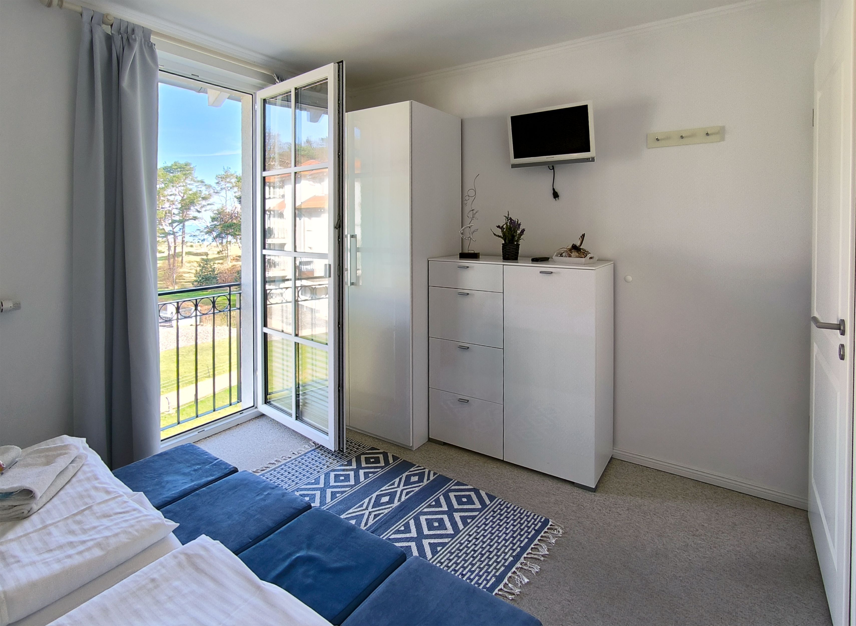 Die 2-Zimmerunterkunft mit französischem Flair liegt in einem Villenhaus (Nebenhaus C), das zur Ferienanlage gehört. Vom Balkon aus schauen Sie bis zur Ostsee und den Müther-Bau am Strand. Das Schlafzimmer hat ein Doppelbett, Nachtkonsolen, einen Kleiderschrank sowie einen Flachbild-TV. Im Wohnzimmer stehen außerdem eine Sitzgruppe, ein weiterer Fernseher, ein Radio und ein CD-Player für Sie bereit. Die separate Küche ist ebenfalls gut ausgestattet. Sie hat einen 4-Plattenherd mit Blitzkochzonen, einen Mikrowellen-Kompaktbackofen, einen Geschirrspüler, einen Kühlschrank mit Gefrierfach sowie Kaffeemaschine, Toaster und Wasserkocher.