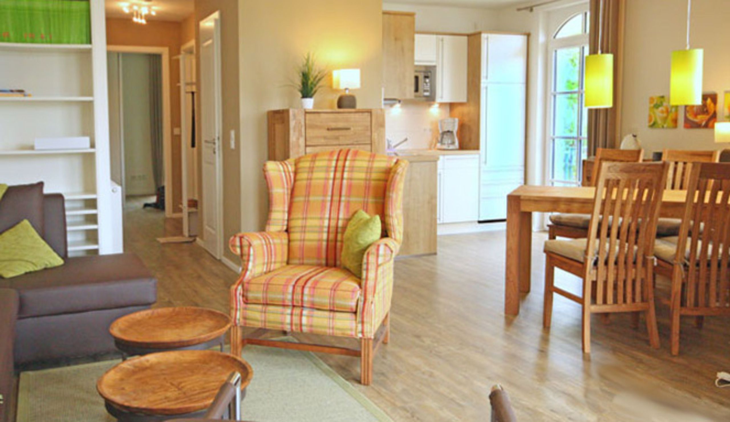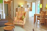 Der Wohnbereich ist für 4 Personen eingerichtet. Dort befindet sich das Schlafsofa für 2 Gäste, der möblierte Ostbalkon, ein Fernseher, ein Radio/CD-Player-Mini-Stereo-System sowie ein DVD- und Blu-Ray-Player. WLAN ist ebenfalls inklusive.