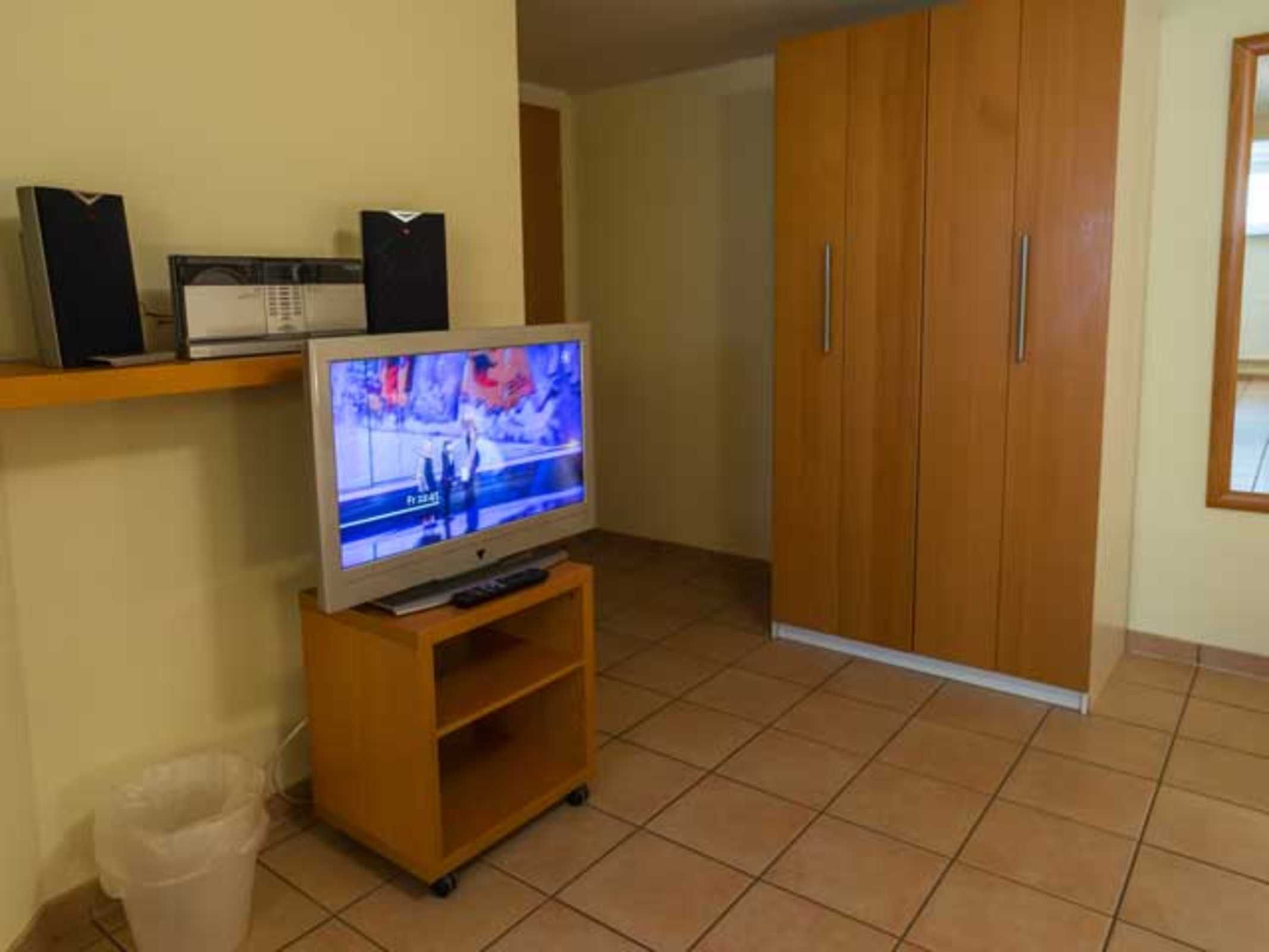 ● Wohnraum mit Sofa, Fernseher und Stereoanlage