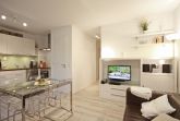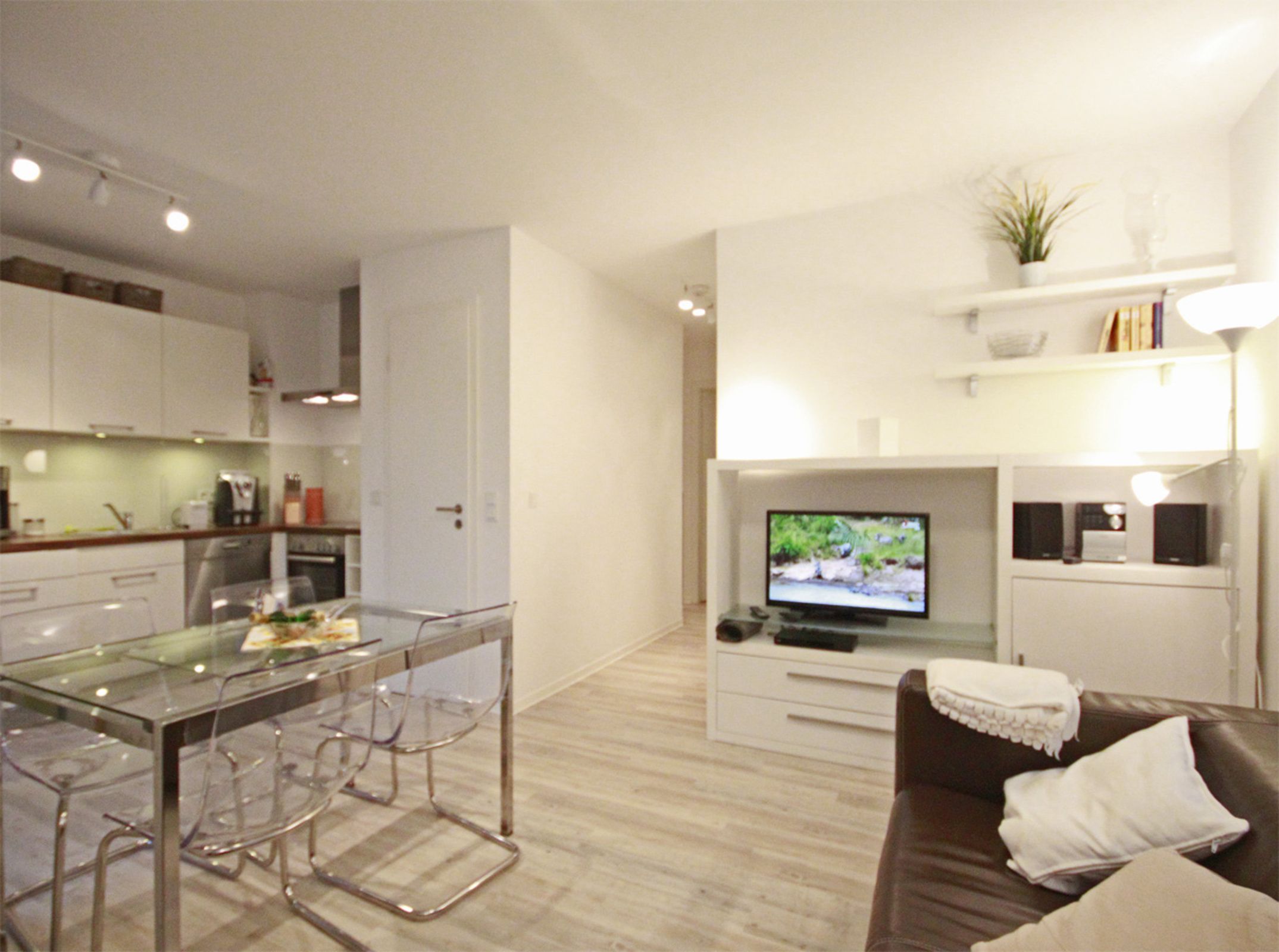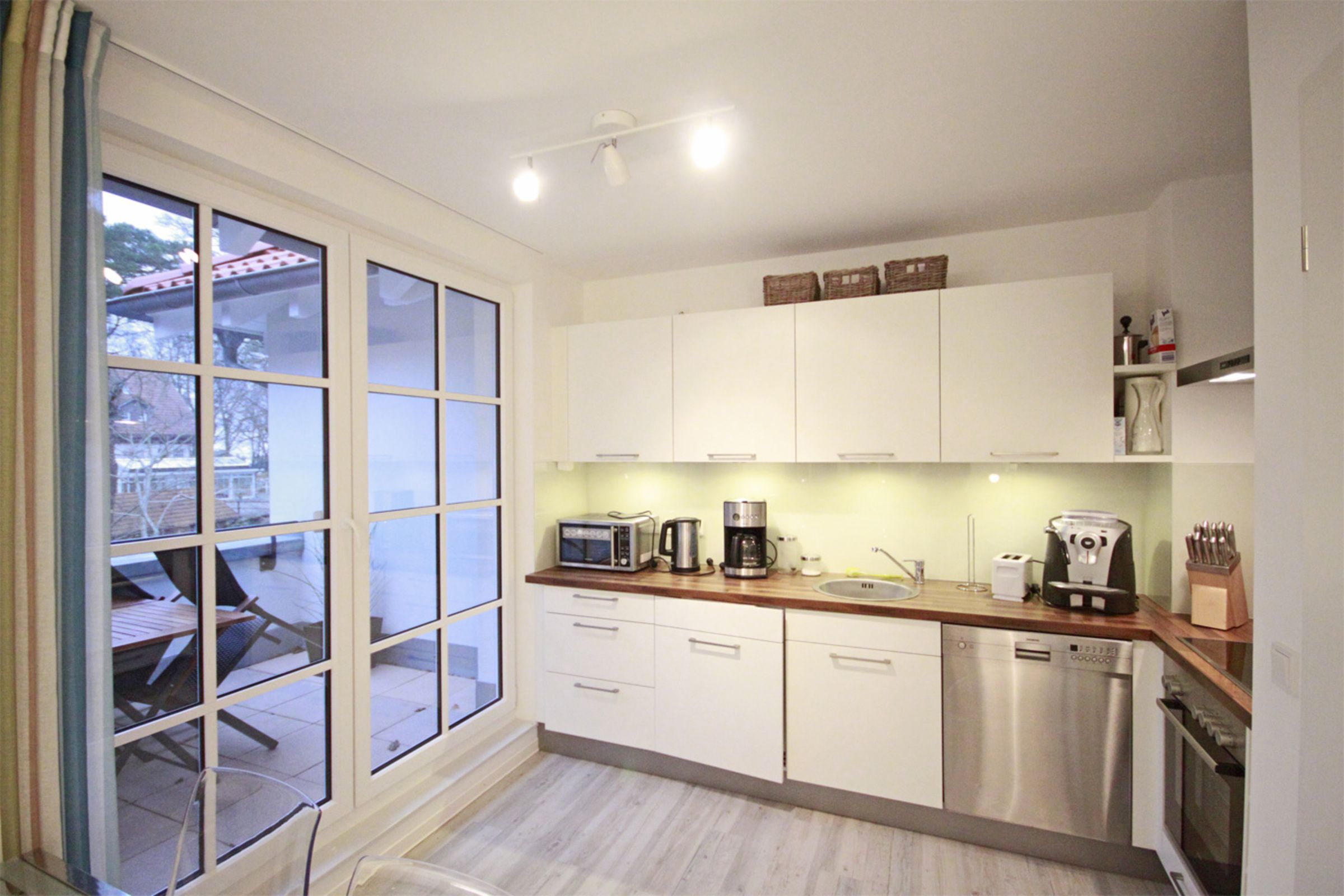 In den Wohn-/Essraum ist die offene Küche integriert. Sie bietet einen 4-Plattenherd mit Backofen, Geschirrspüler, Kühlschrank mit Gefrierfach, Mikrowelle, Toaster, Kaffeemaschine.