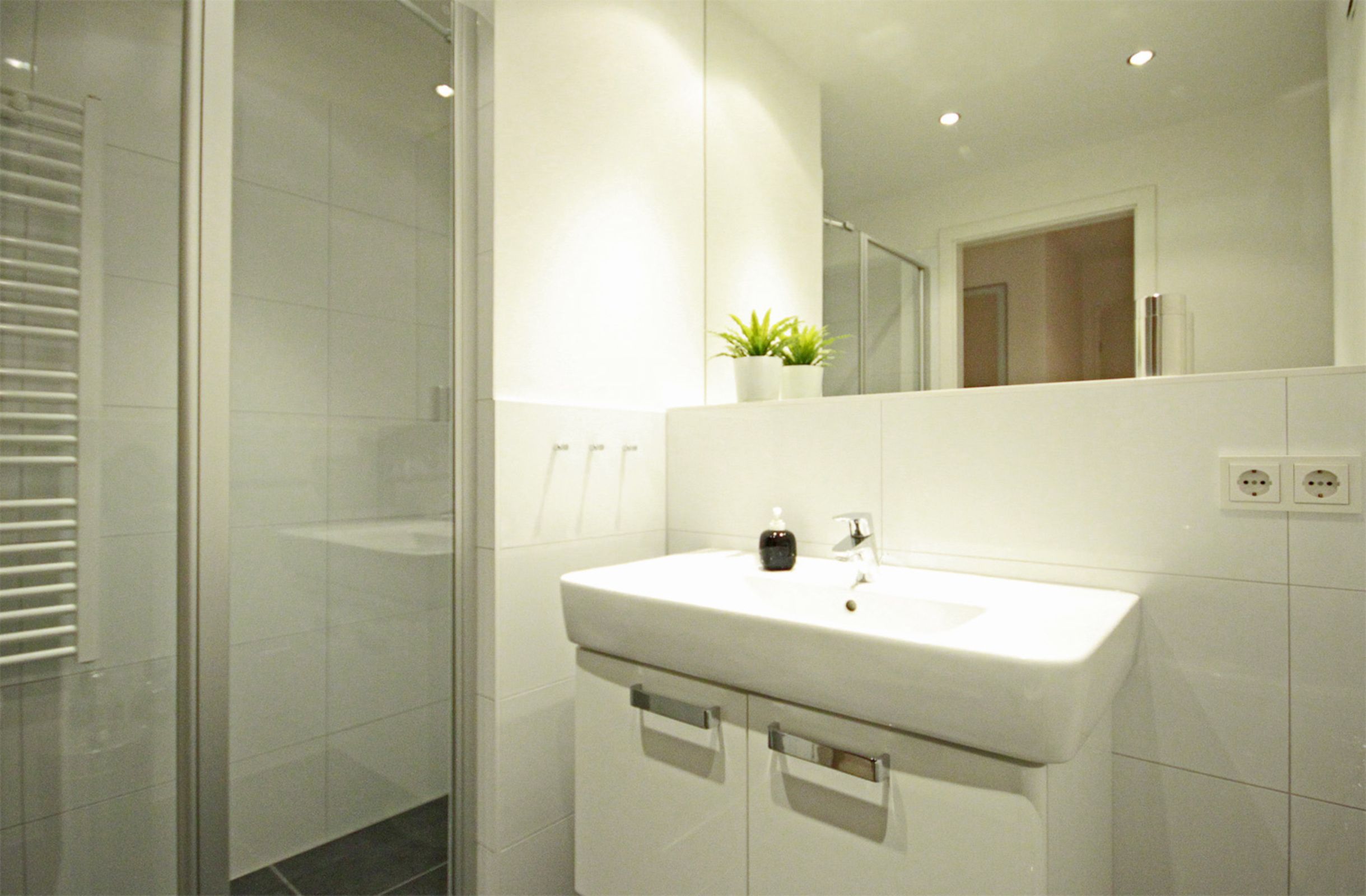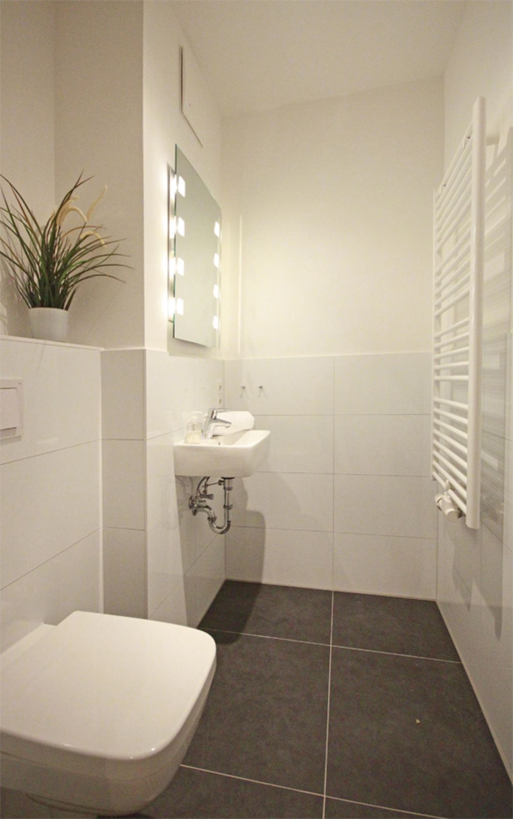 Neben einem Bad mit begehbarer Dusche, WC und Waschbecken verfügt die Wohnung über ein Gäste-WC.