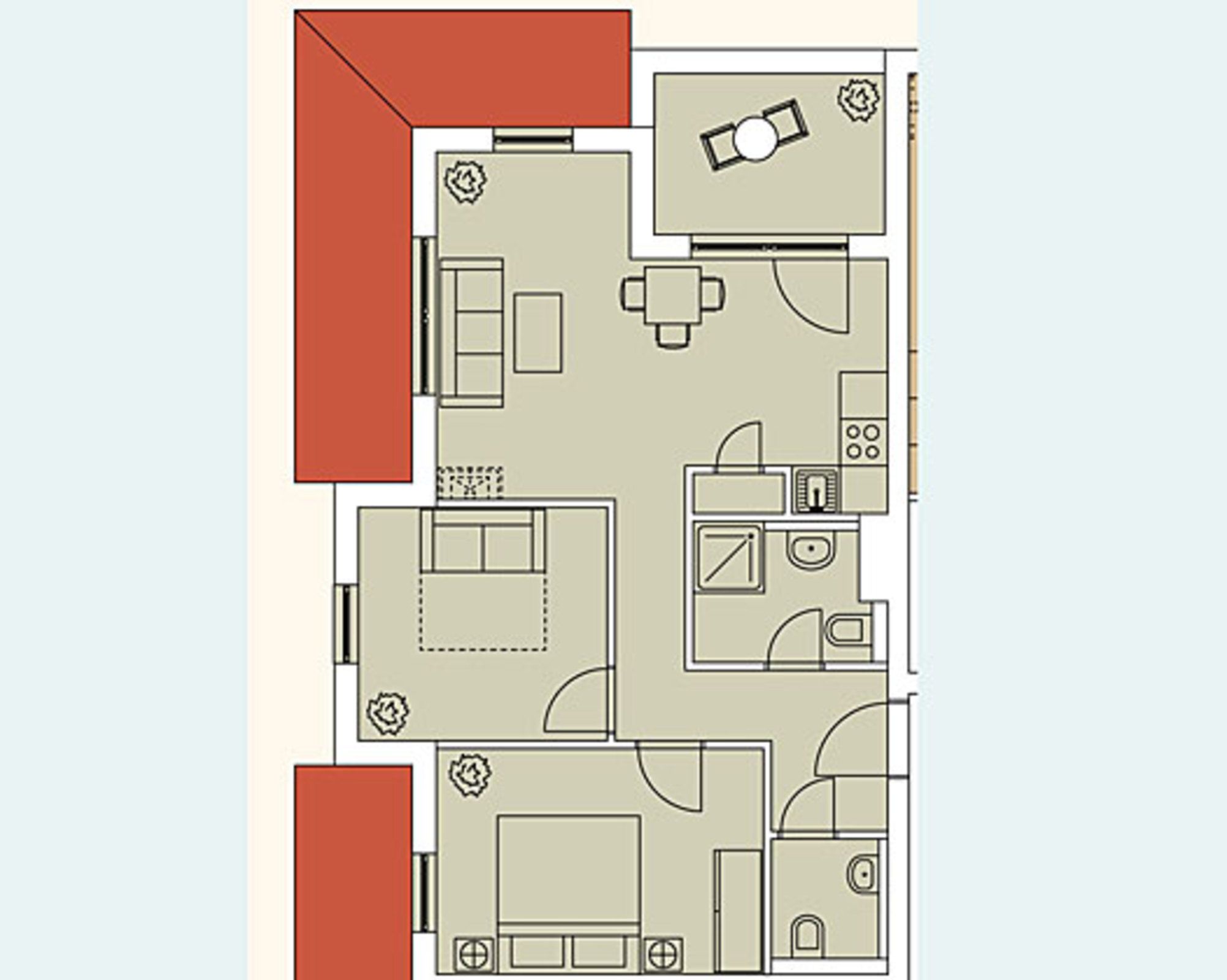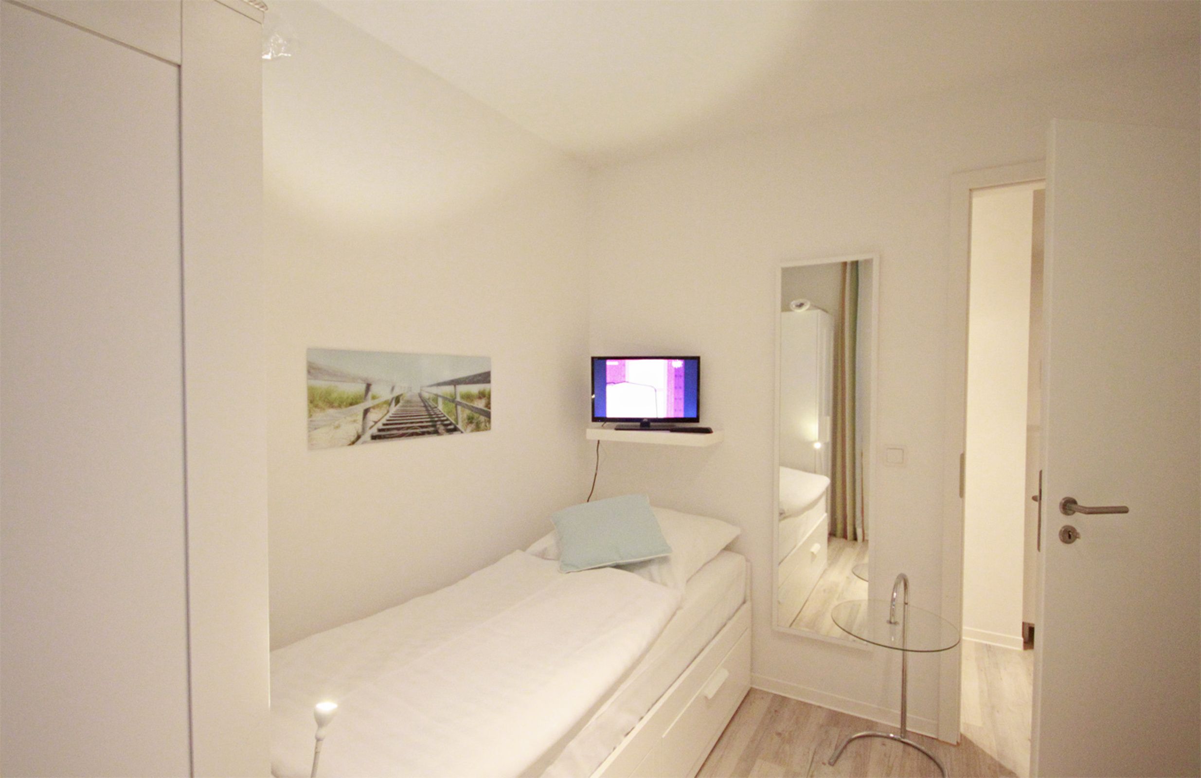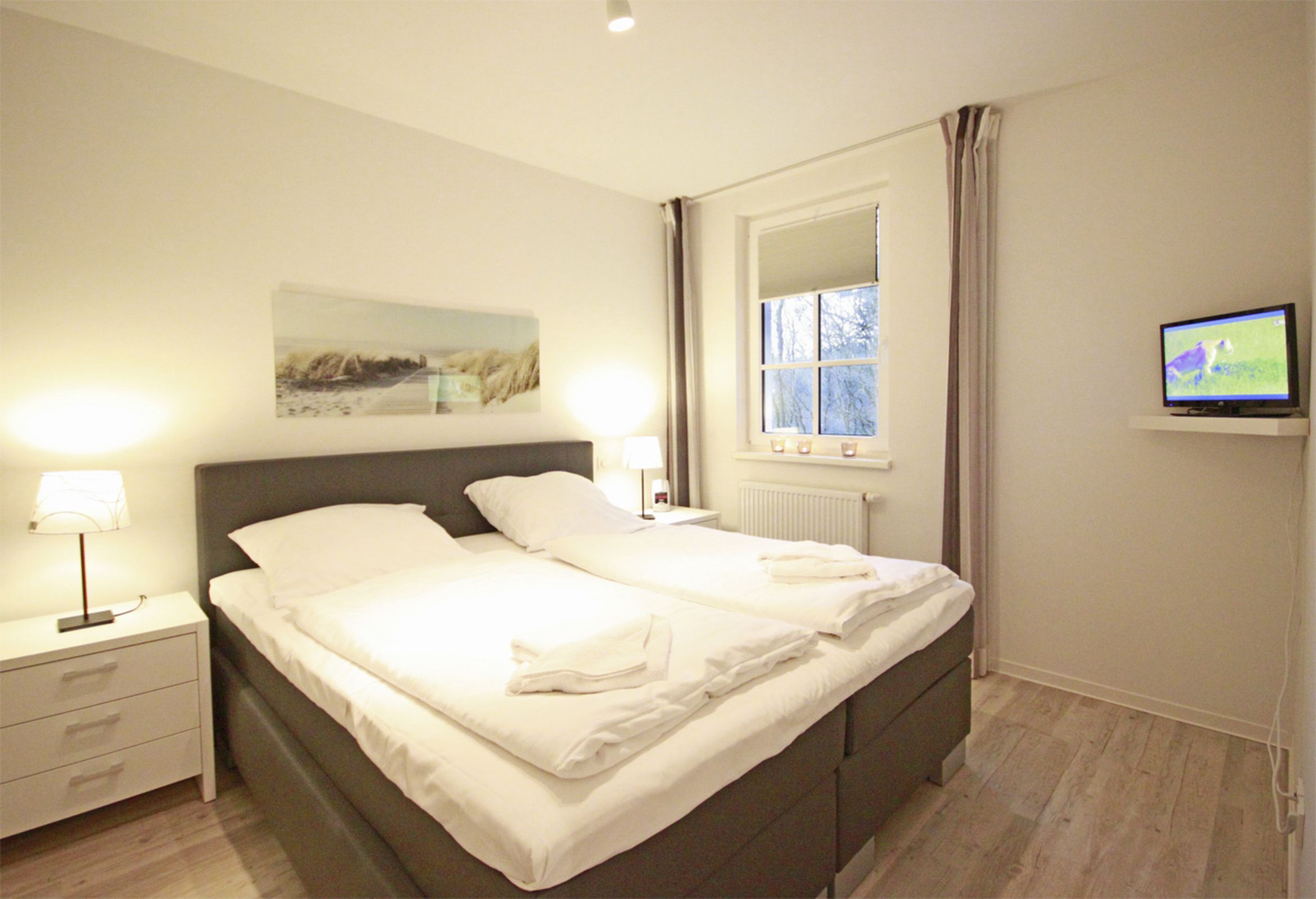 Die Nichtraucher-Unterkunft hat 2 Schlafzimmer - eines mit einem Doppelboxspringbett, eines mit 2 Einzelbetten - beide mit TV. Gegen einen einmaligen Aufpreis kann ein Babybett (für Kinder bis einschl. 2 Jahre) dazugestellt werden. Auch ein Hochstuhl kann dazugebucht werden.