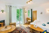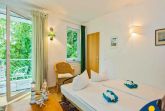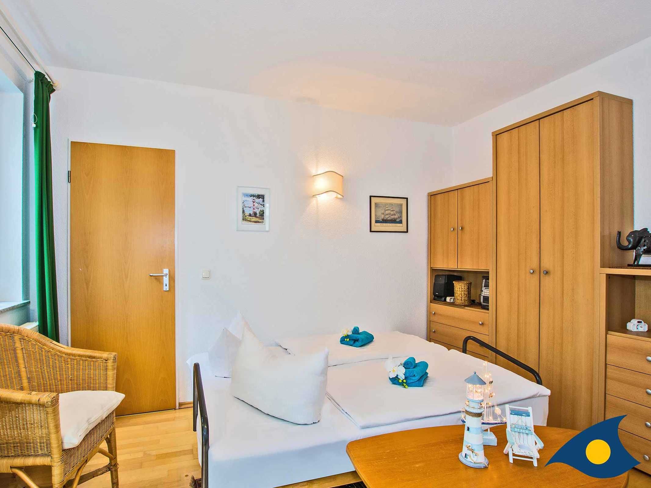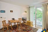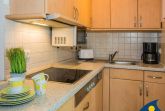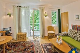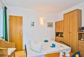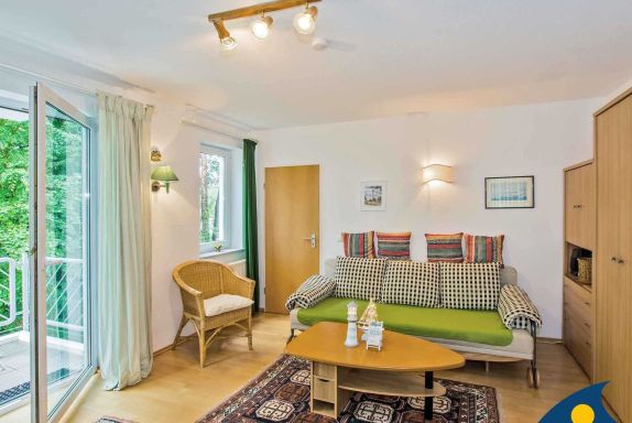 Im Wohnzimmer dieses kleinen Appartements befindet sich eine Schlafcouch für zwei Personen. Zusätzlich gehört ein zweites kleines Zimmer zu dieser Wohnung - ausgestattet mit einem Einzelbett (1,90 x 0,90 m) wurde hier ein separater Platz geschaffen für eine dritte Person. Die 9 qm große Terrasse bietet eine windgeschützte Sitzecke und freien Blick zur Ostsee. Ein Balkon (4 qm) in Südwestlage lädt dazu ein, die Nachmittagssonne zu genießen.
