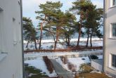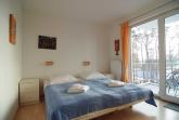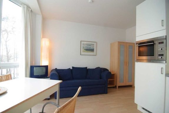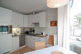 Dieses moderne und komfortable Appartement verfügt über einen Wohnraum mit integrierter, sehr gut ausgestatteter Küchenzeile, ein Schlafzimmer mit Doppelbett, das auch zu Einzelbetten umfunktioniert werden kann und ein zweites Schlafzimmer mit einem Einzelbett. Die Wohnung ist ideal für kleine Familien. Bücher, Spiele und ein CD-Player stehen für Sie bereit. Vom Glaserker im Wohnzimmer reicht der Blick bis hinüber zum Meer.