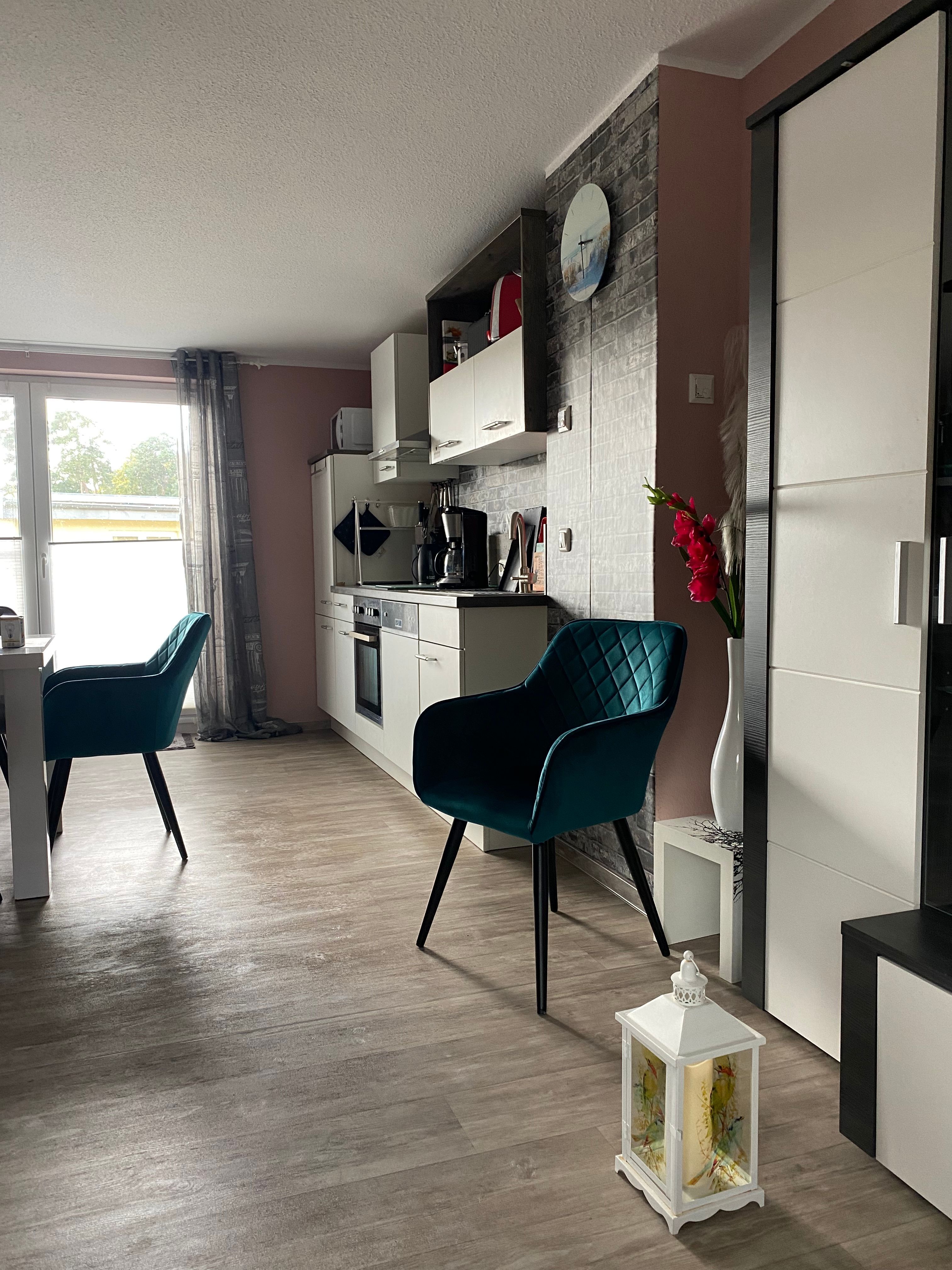 Die moderne Einbauküche, im angesagten Vintage Style gestaltet, ist mit Geschirrspülmaschine, Kühlschrank mit Gefrierfach , Mikrowelle , Toaster , CAFISSIMO Kaffeemaschine , Wasserkocher und sämtlichen Kochgeschirr , Besteck und Gläsern ausgestattet .