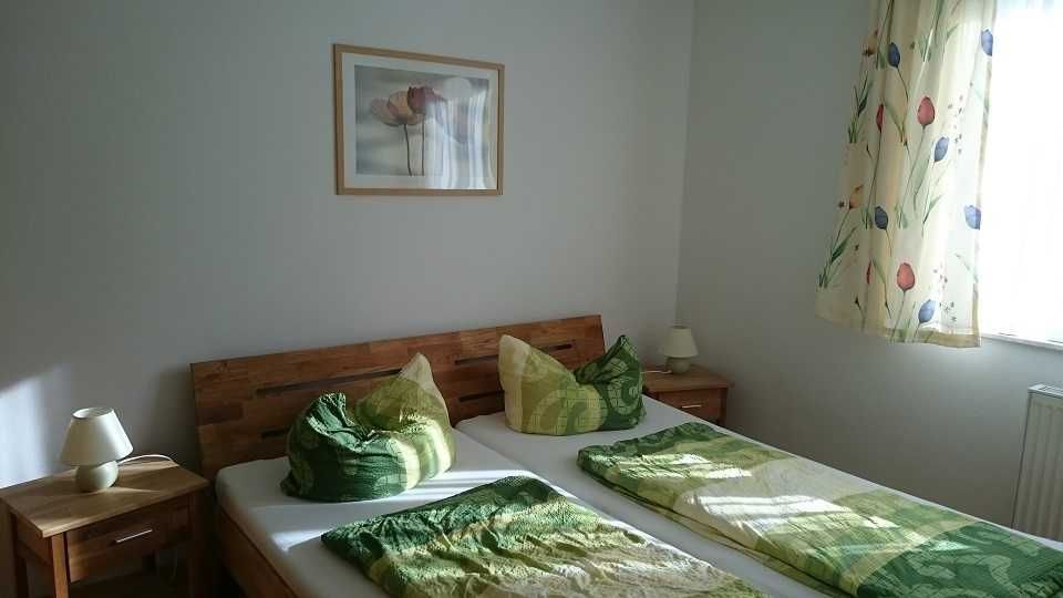 • neben dem Wohnbereich befinden sich zwei Schlafräume, einmal ausgestattet mit Doppelbett, Nachttisch und einem großen Kleiderschrank und einmal ausgestattet mit zwei Einzelbetten, Nachttisch und Kleiderschrank