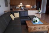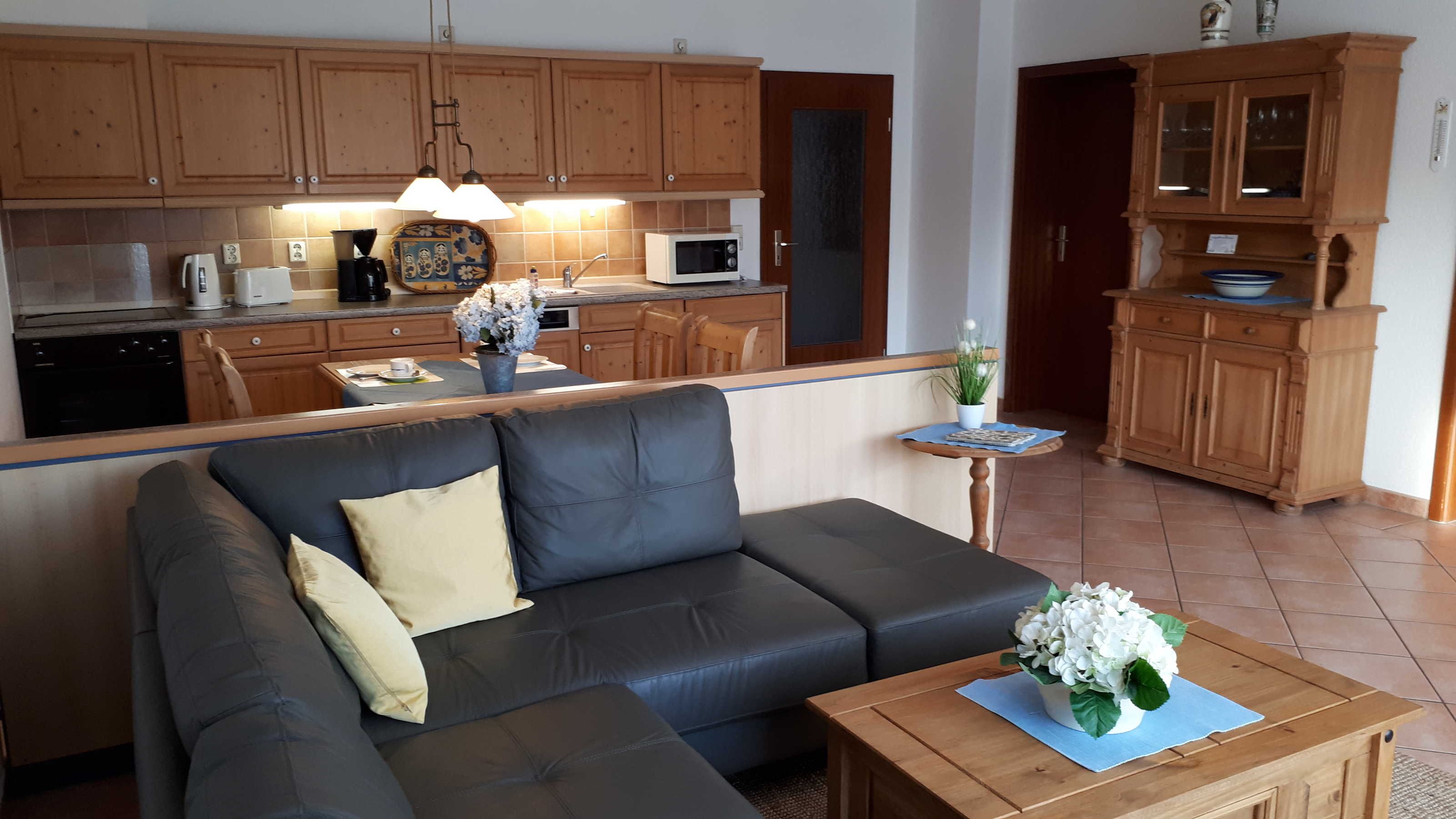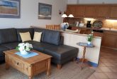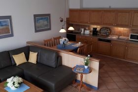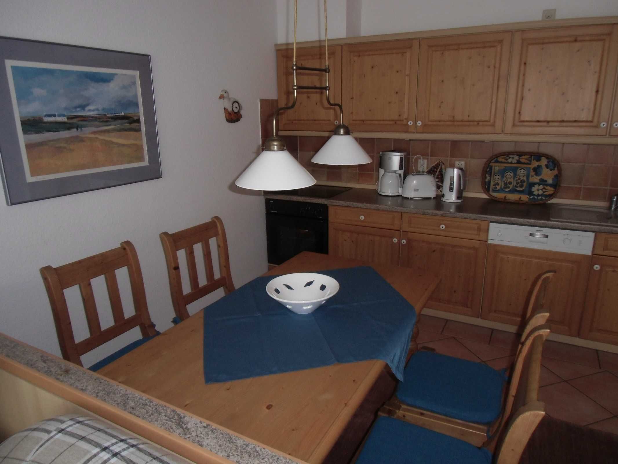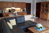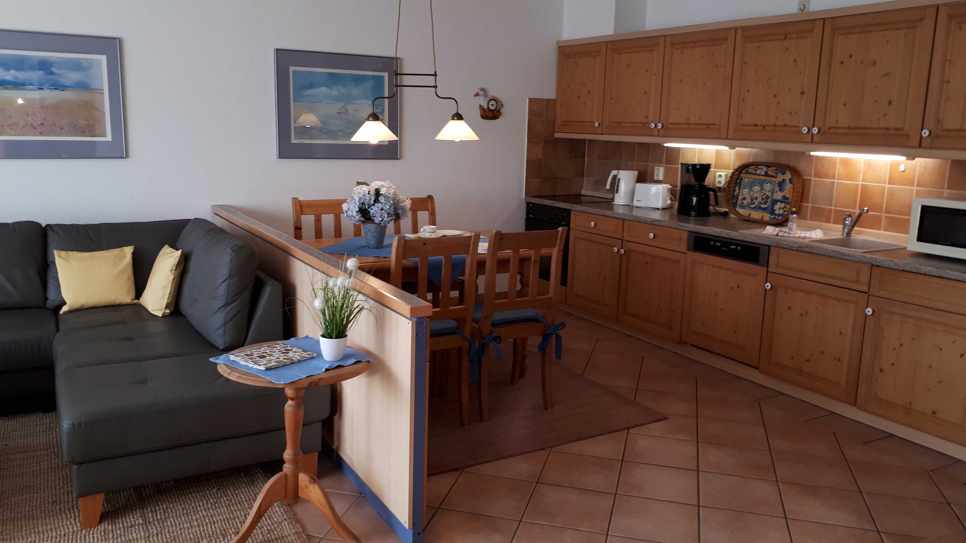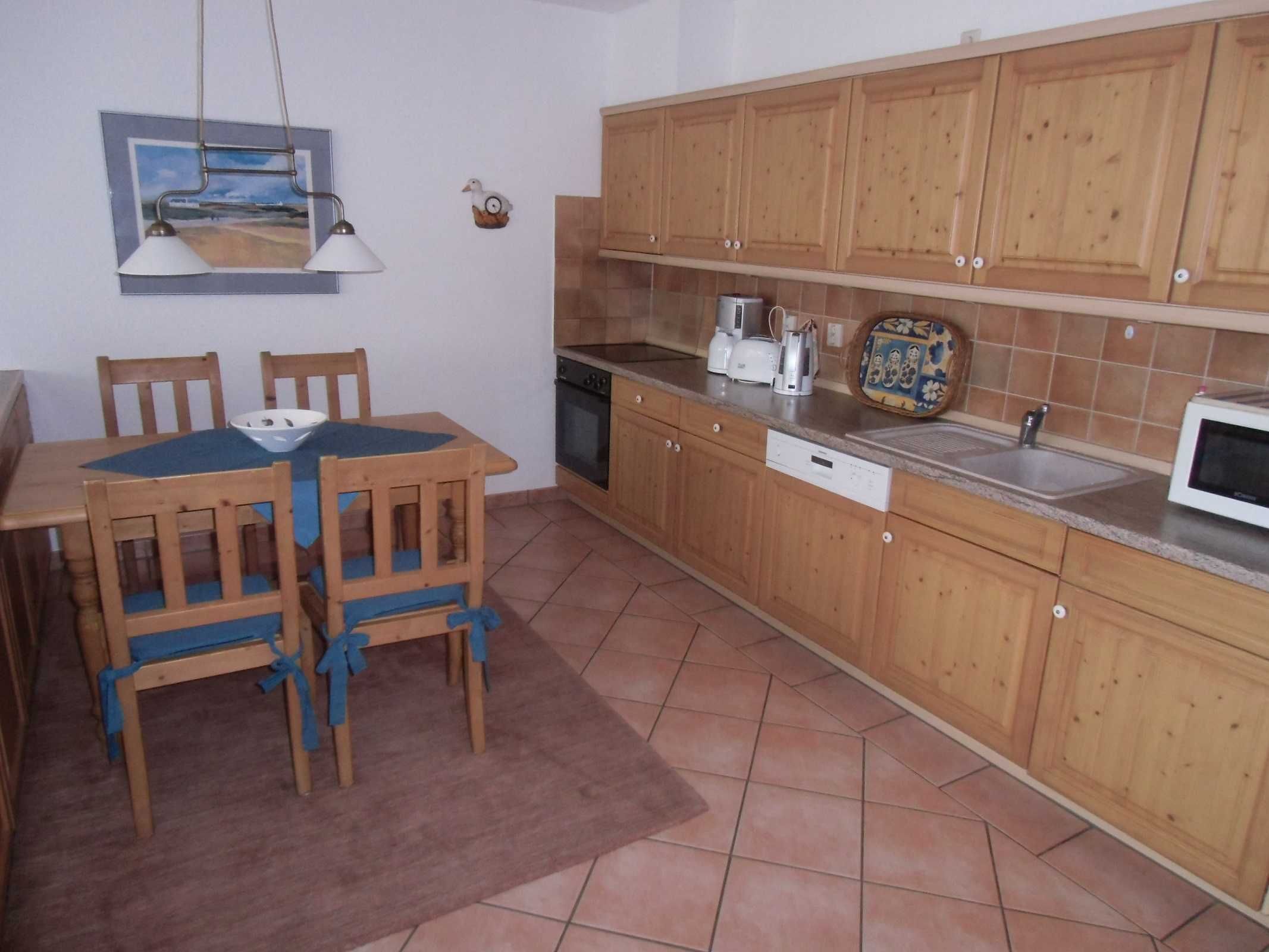 Die Küche ist komplett ausgestattet mit Geschirrspüler, Spüle, Kühlschrank mit Gefrierfach, Cerankochfeld, Backofen, Wasserkocher, Mikrowelle, Toaster, Kaffeemaschine, Eierkocher und natürlich mit Geschirr und weiteren Küchenutensilien. Von der offenen Küche kann man über die große Rundsitzgruppe bis zur Terrasse schauen. Die Möblierung ist aus Vollholz und vermittelt elegante Gemütlichkeit.
