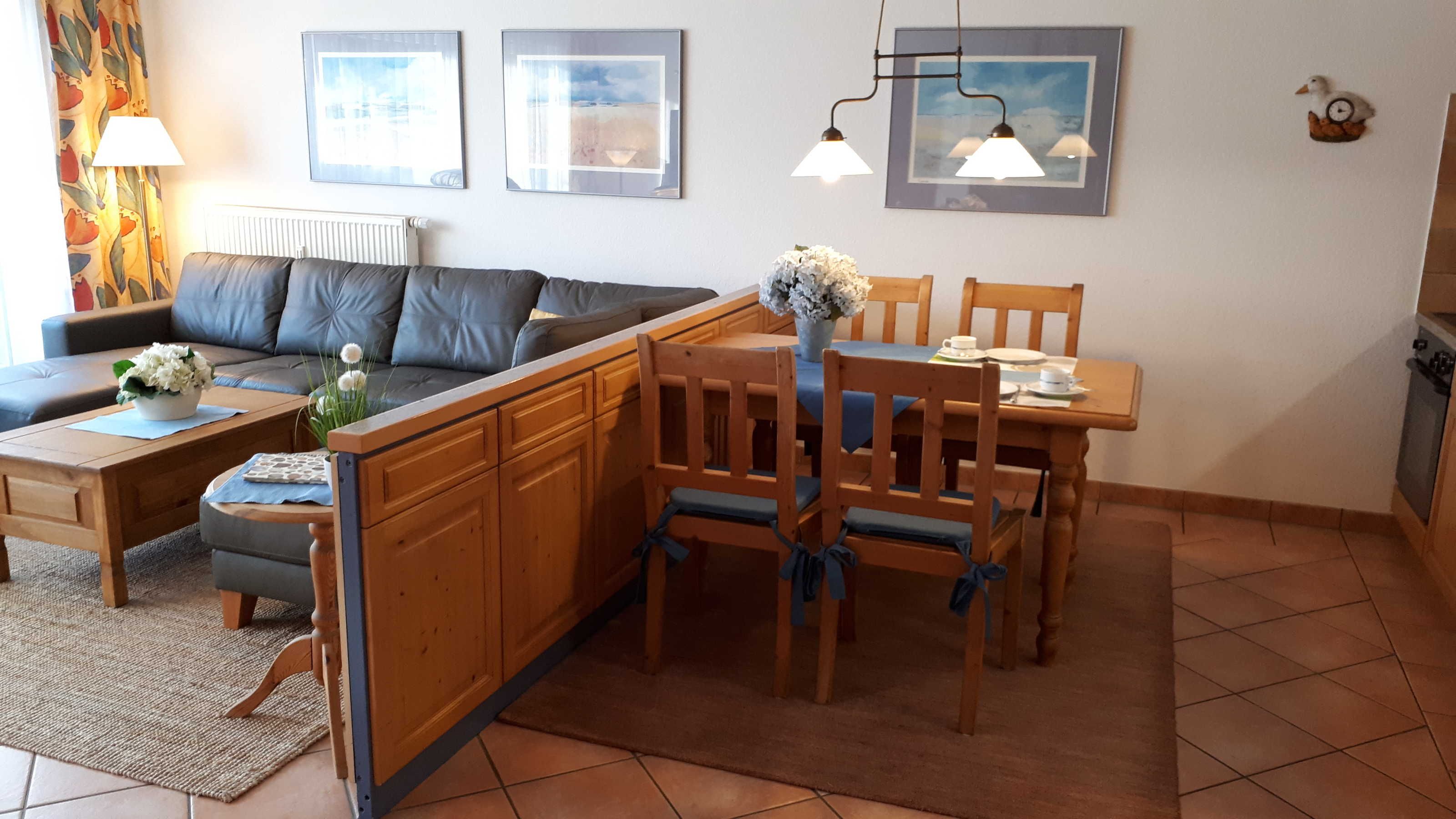 Die Küche ist komplett ausgestattet mit Geschirrspüler, Spüle, Kühlschrank mit Gefrierfach, Cerankochfeld, Backofen, Wasserkocher, Mikrowelle, Toaster, Eierkocher, Kaffeemaschine und natürlich mit Geschirr und Besteck. Von der offenen Küche kann man über die große Rundsitzgruppe bis zur Terrasse schauen. Die Möblierung ist aus Vollholz und vermittelt elegante Gemütlichkeit.