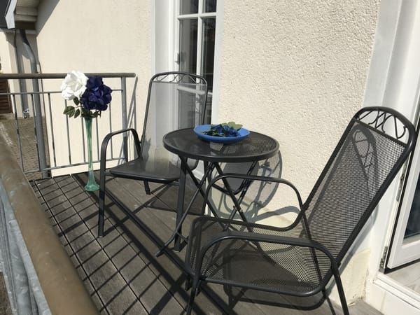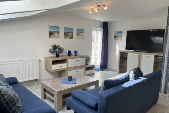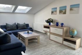 Die Ferienwohnung(DG/1.OG) ist geschmackvoll eingerichtet mit allem Komfort,wie voll ausgestattete Küchenzeile (Cerankochfeld, Backofen, Geschirrspüler, Microwelle sowie mit diversen Kleingeräten) offen zum Wohnbereich.Schlafzimmer mit Boxspringbett,großzügigen Kleiderschrank und TV.Liebevoll eingerichtetes Wohnzimmer mit gemütlicher Sitzgarnitur (ausziehbar als Aufbettung), TV und Radio. Am Wohnraum und Schlafraum angrenzender möblierter süd-west Balkon. Fahrradabstellraum sowie ein Parkplatz stehen kostenfrei zur Verfügung. Münzwaschmaschine und Münztrockner im Haus.