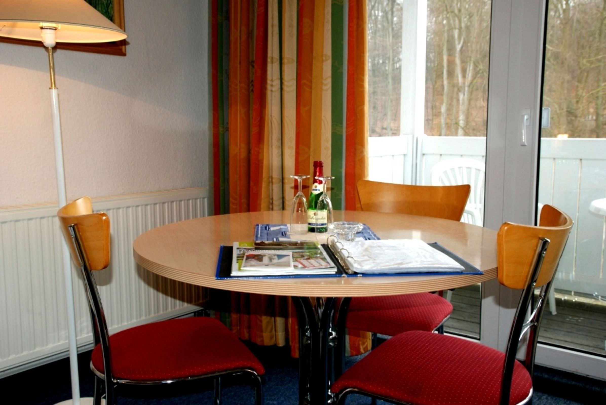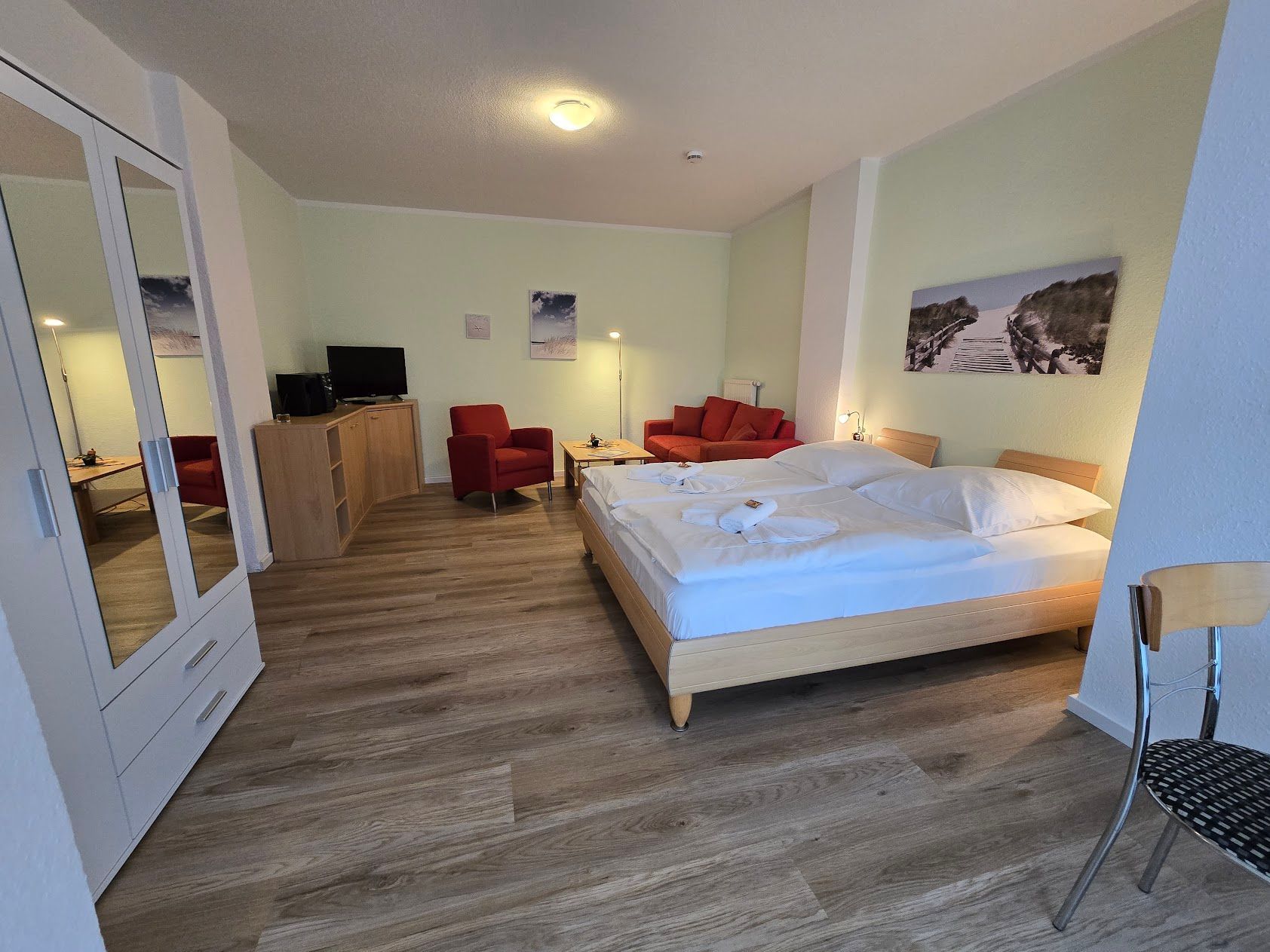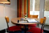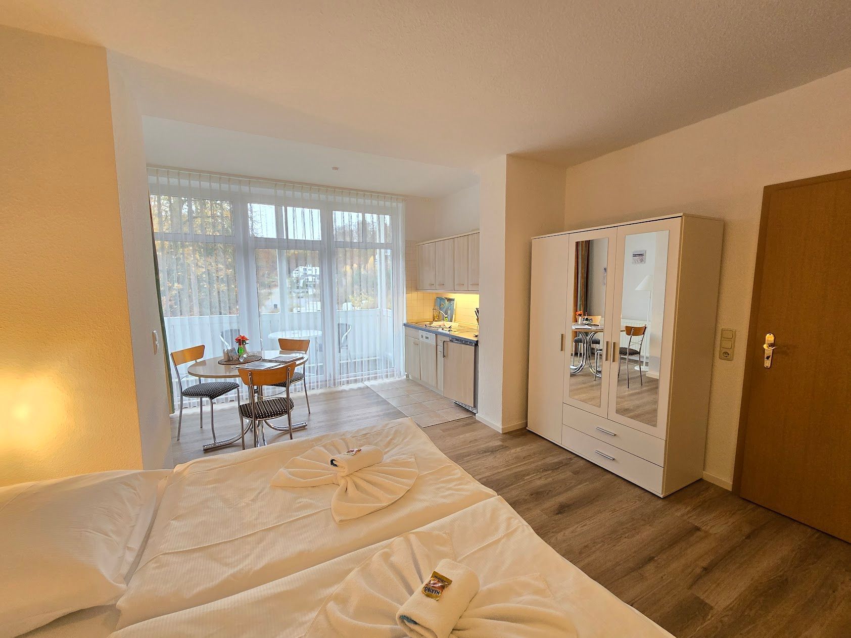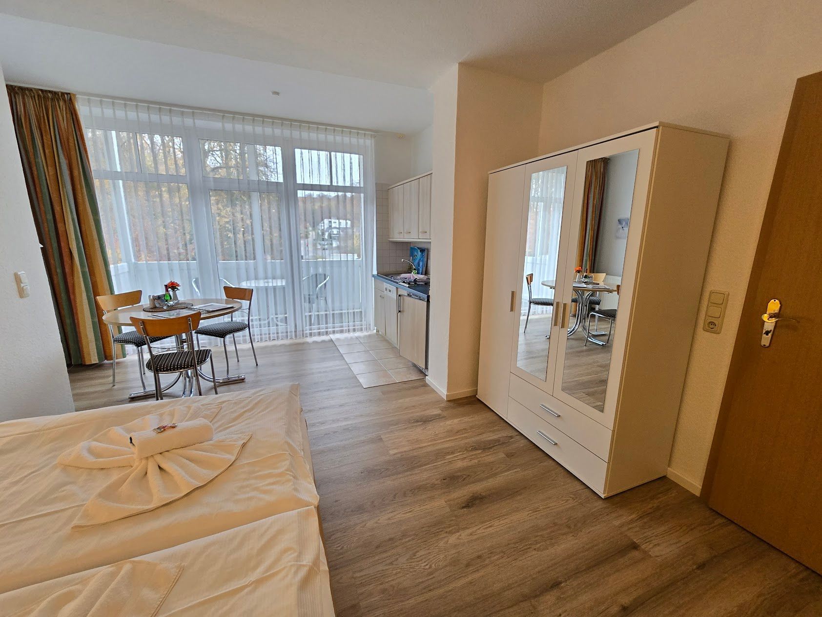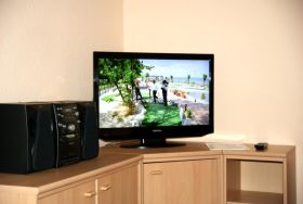 Das 1 Raumappartement hat einen Wohn-Schlafraum mit Doppelbett für 2 Pers.und einer ausziehbaren Couch, Kabel-TV,CD Stereoanlage ,Esstisch, gut ausgestattete Küchenzeile mit Geschirrspüler, Kaffeemaschine, Toaster und Microwelle. Babybett ( ohne Wäsche )und Hochstuhl für die Kleinen stellen wir zur verfügung ( bitte vorbestellen ) .