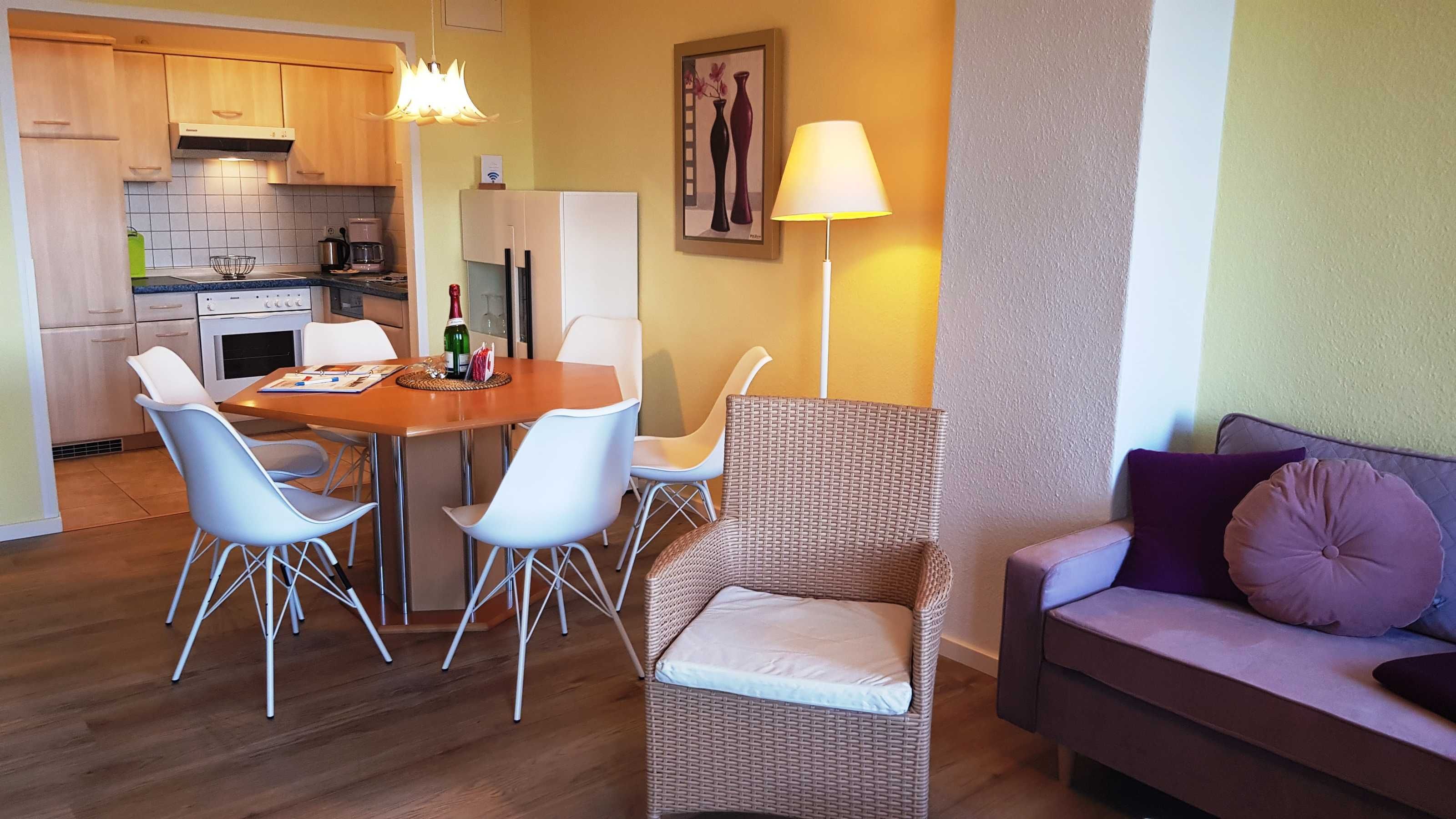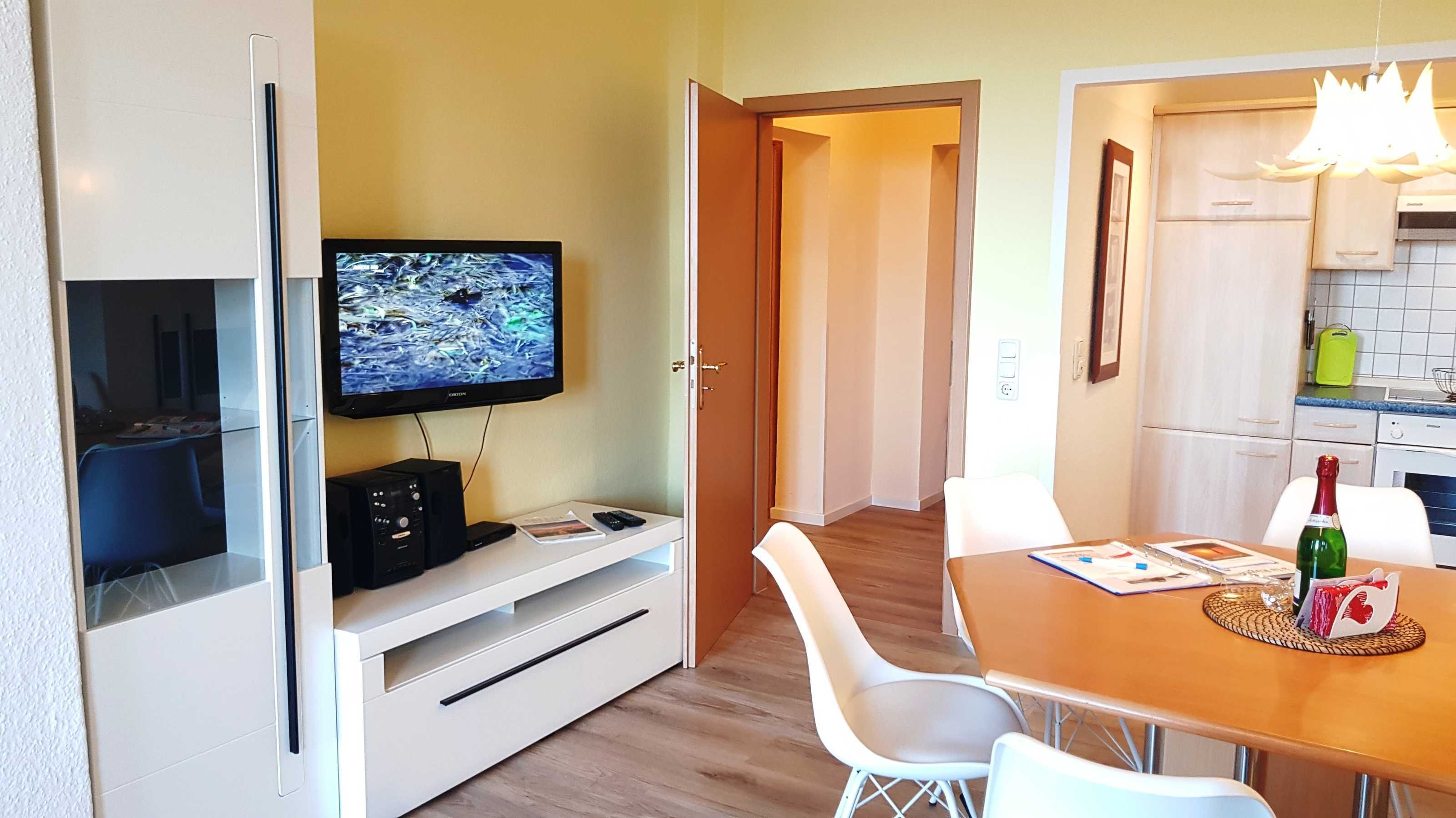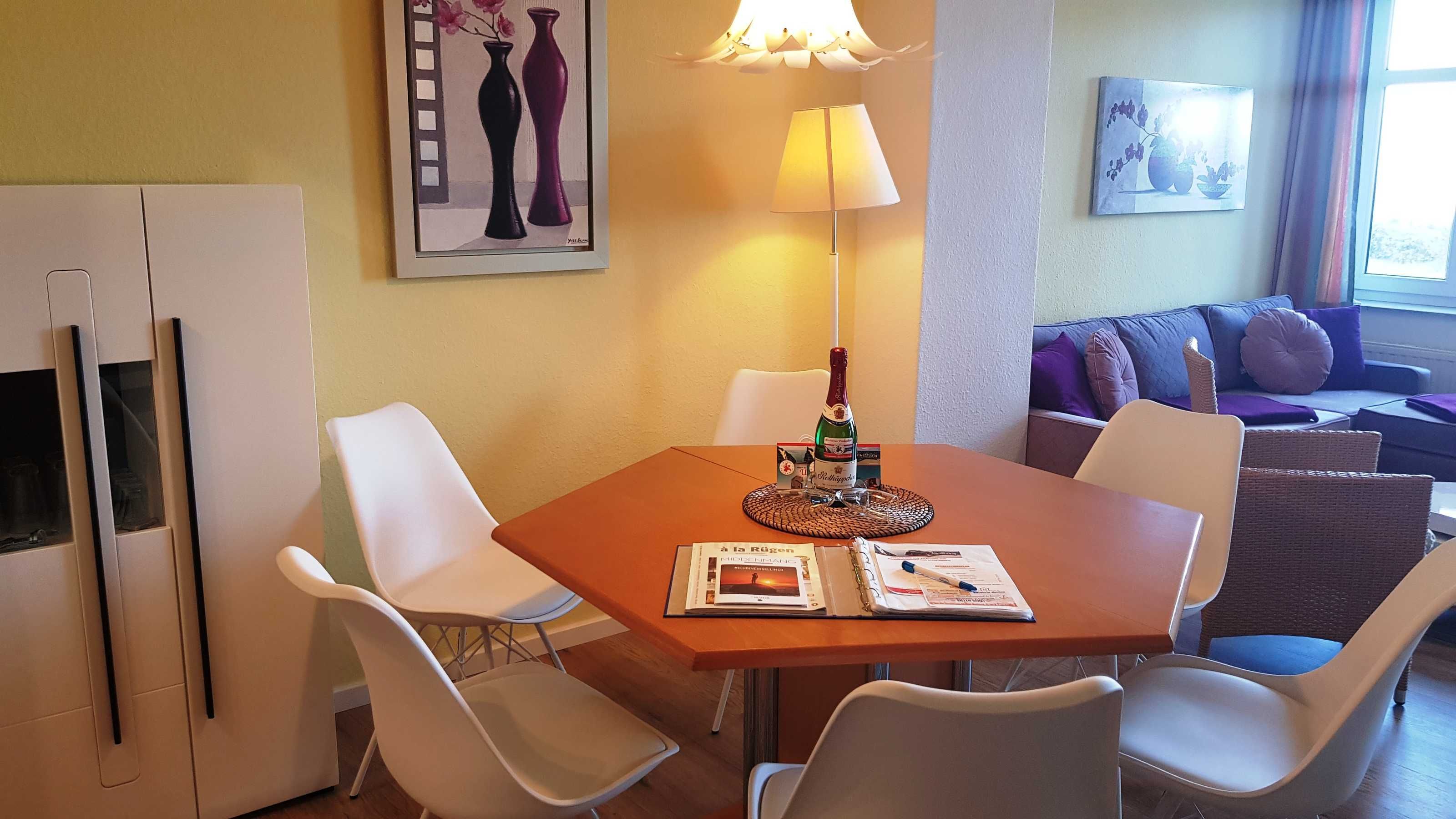 Wohnzimmer mit Radio, Flatscreen-TV, W-LAN und Couch. Großer Esstisch für 4 Personen