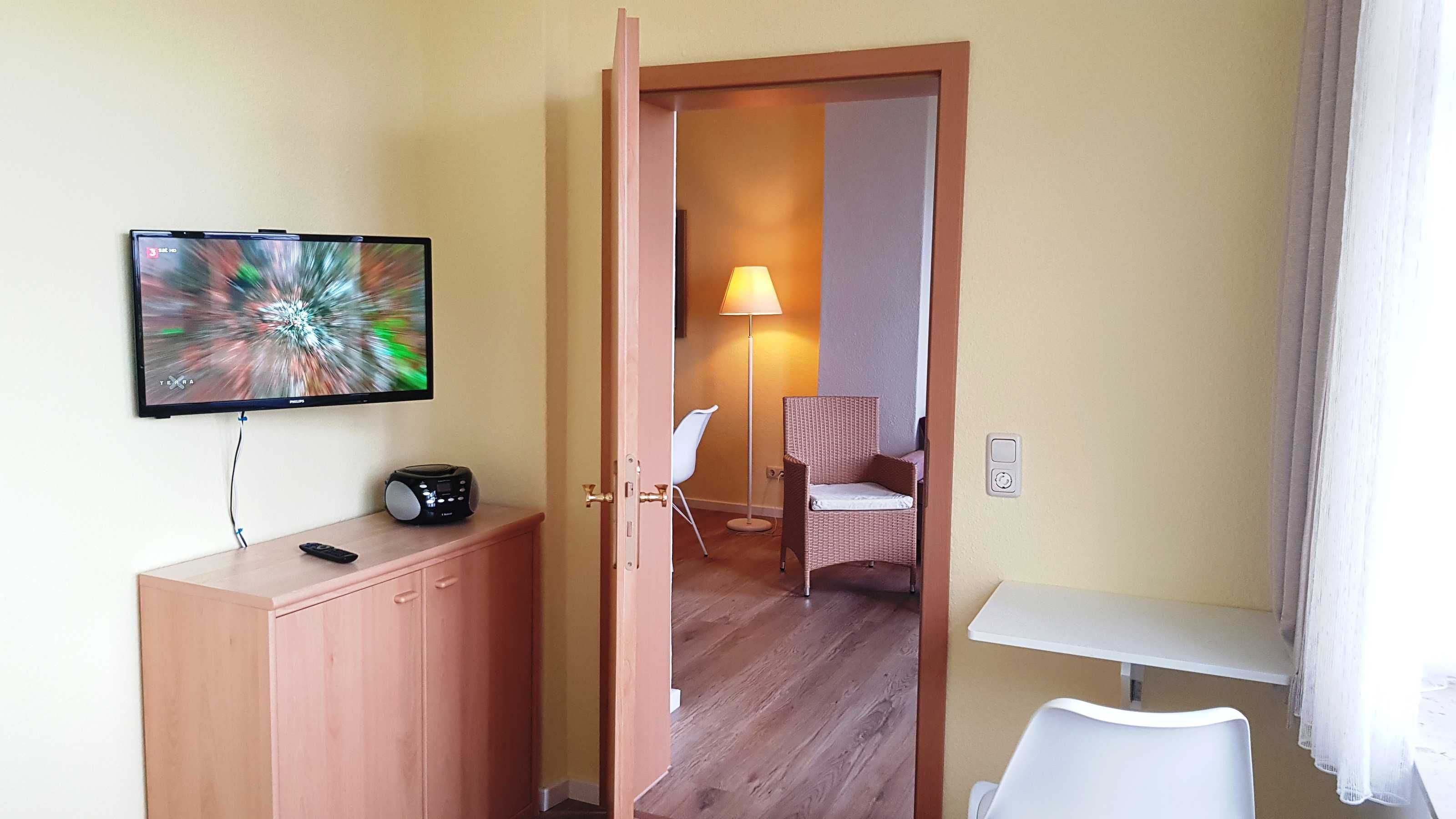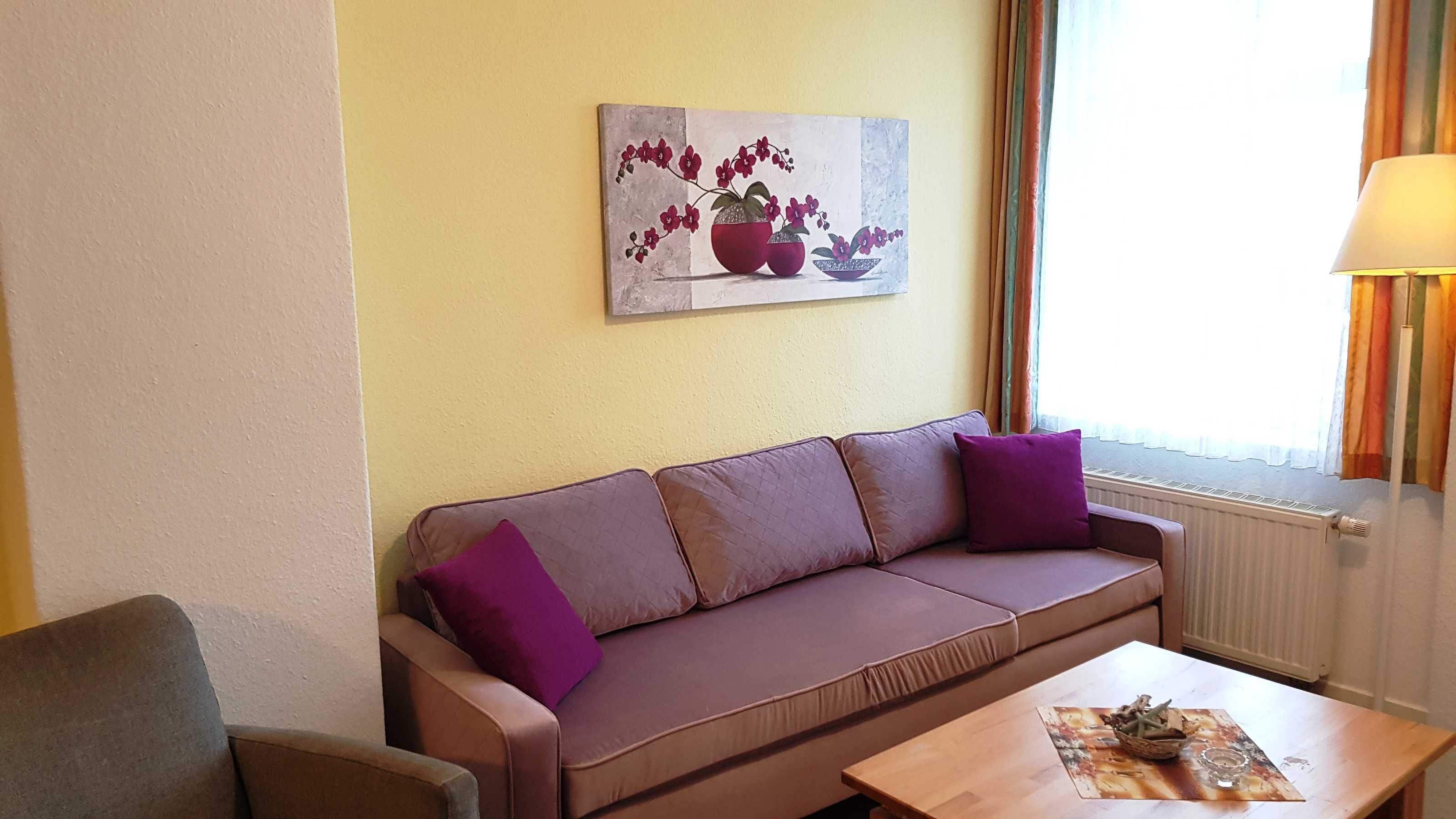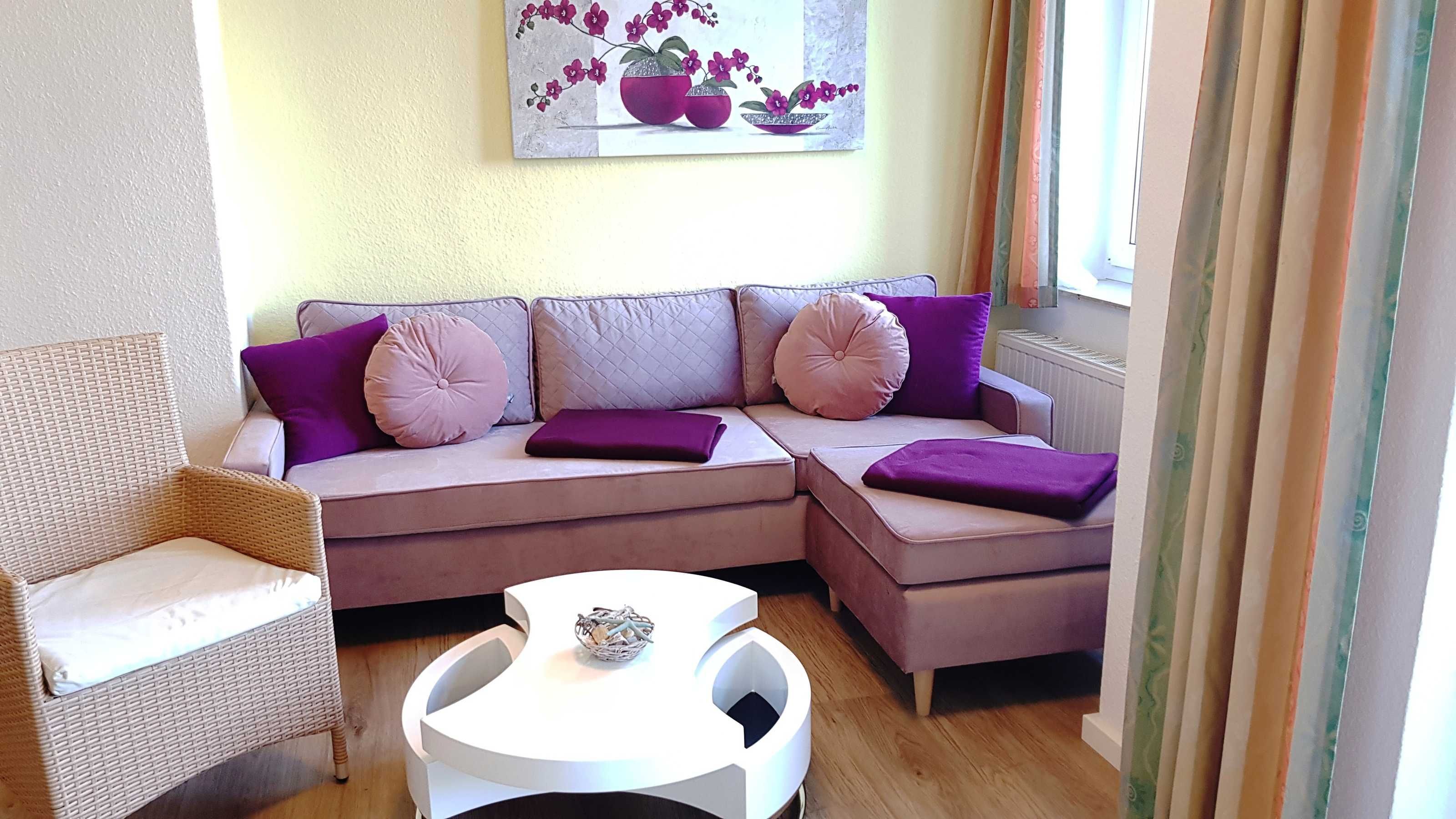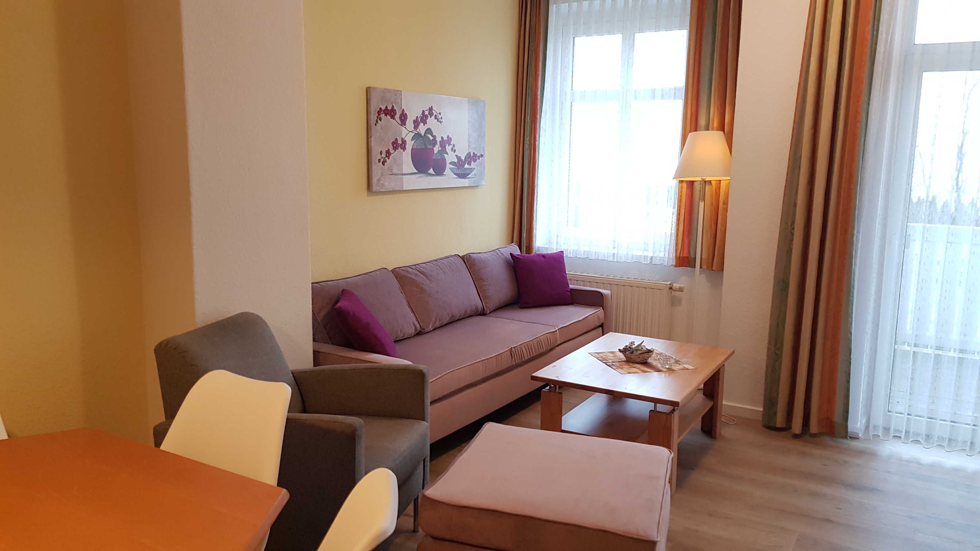 Wohnzimmer mit Radio, Flatscreen-TV, W-LAN und Couch. Großer Esstisch für 4 Personen