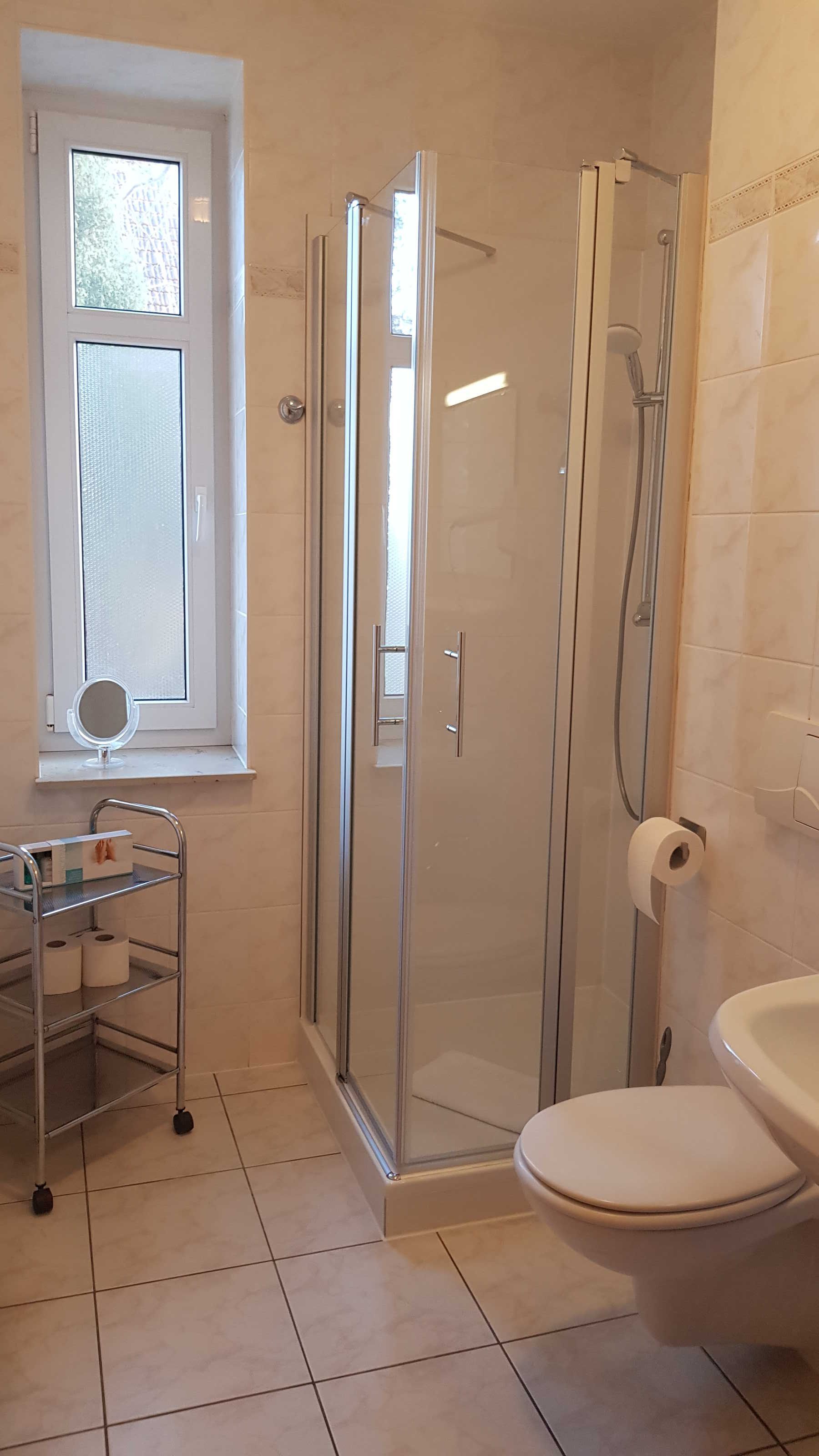 Ein schönes Tageslichtbadezimmer mit Dusche und WC erzeugt eine angenehme Wohlfühlatmosphäre.