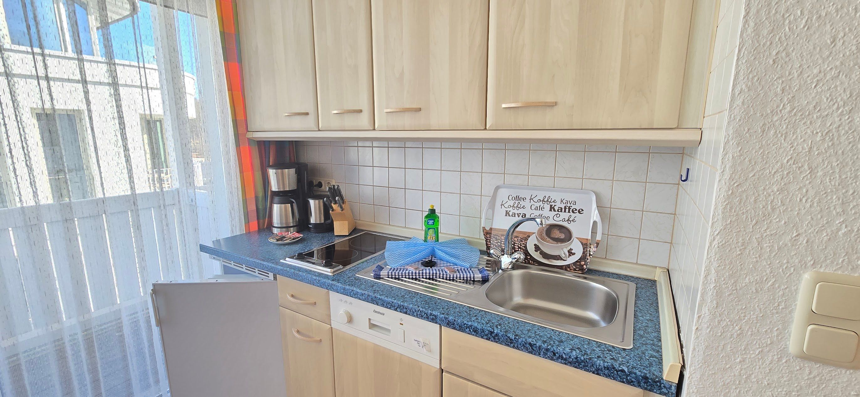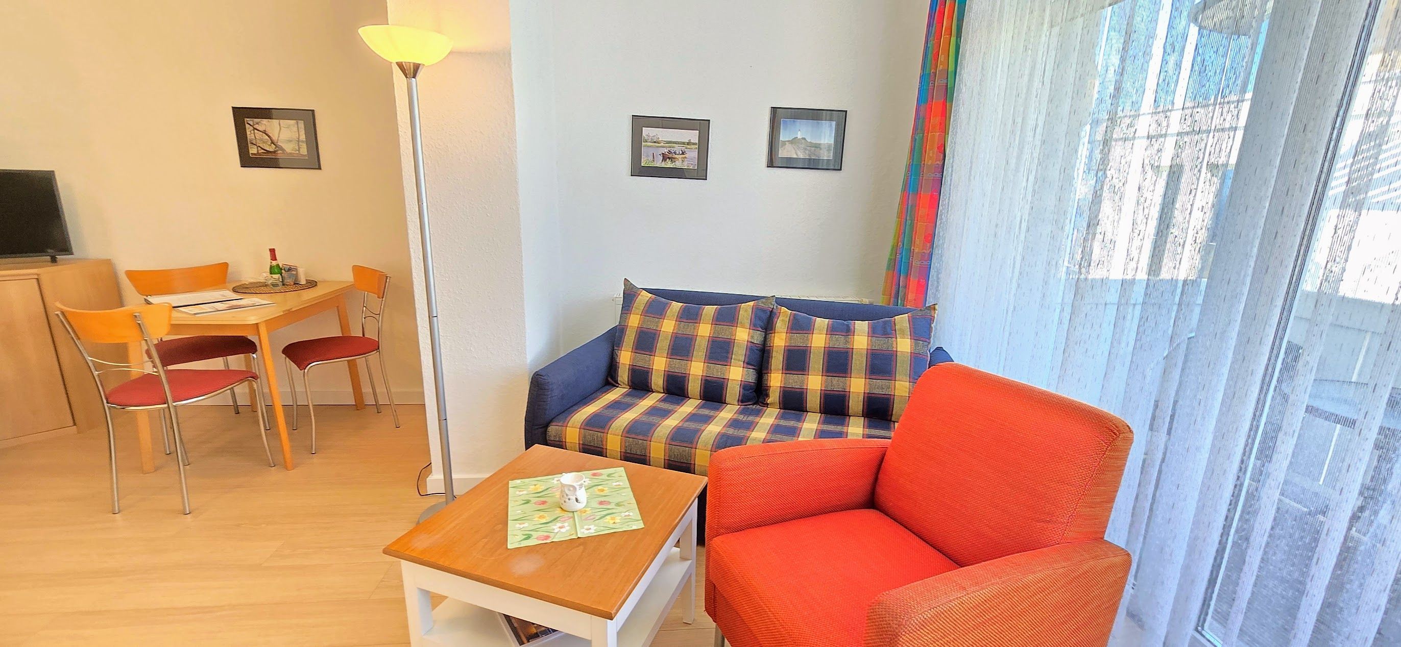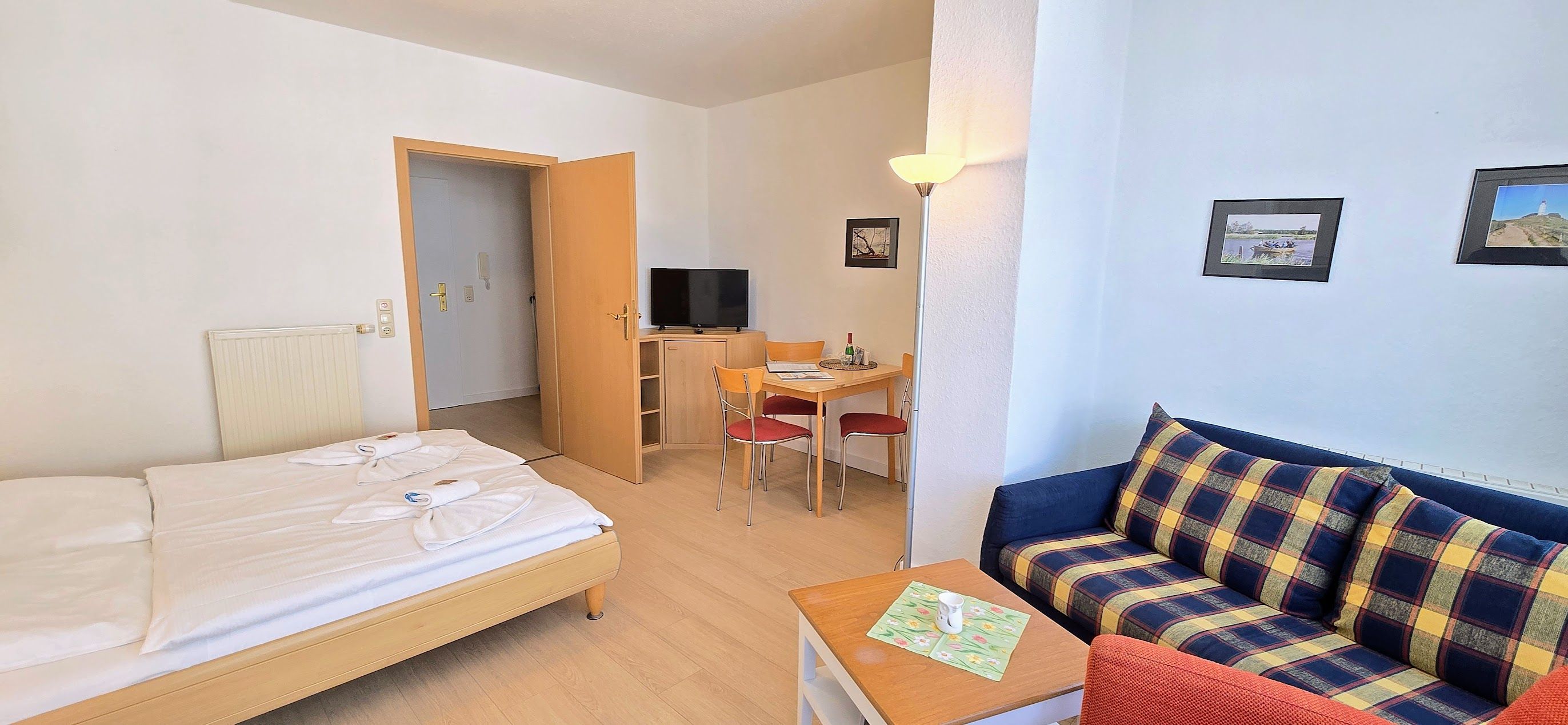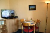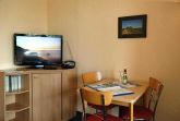 Das 1 Raum Appartement im 3. Stock mit Wohn-Schlafraum und Doppelbett für 2 Personen , Esstisch, Kabel-TV,CD Stereoanlage , gut ausgestattete Küchenzeile mit Geschirrspüler, Kaffeemaschine, Toaster und Microwelle. Babybett ( ohne Wäsche )und Hochstuhl für die Kleinen stellen wir gegen Gebühr zur Verfügung ( bitte vorbestellen ) .