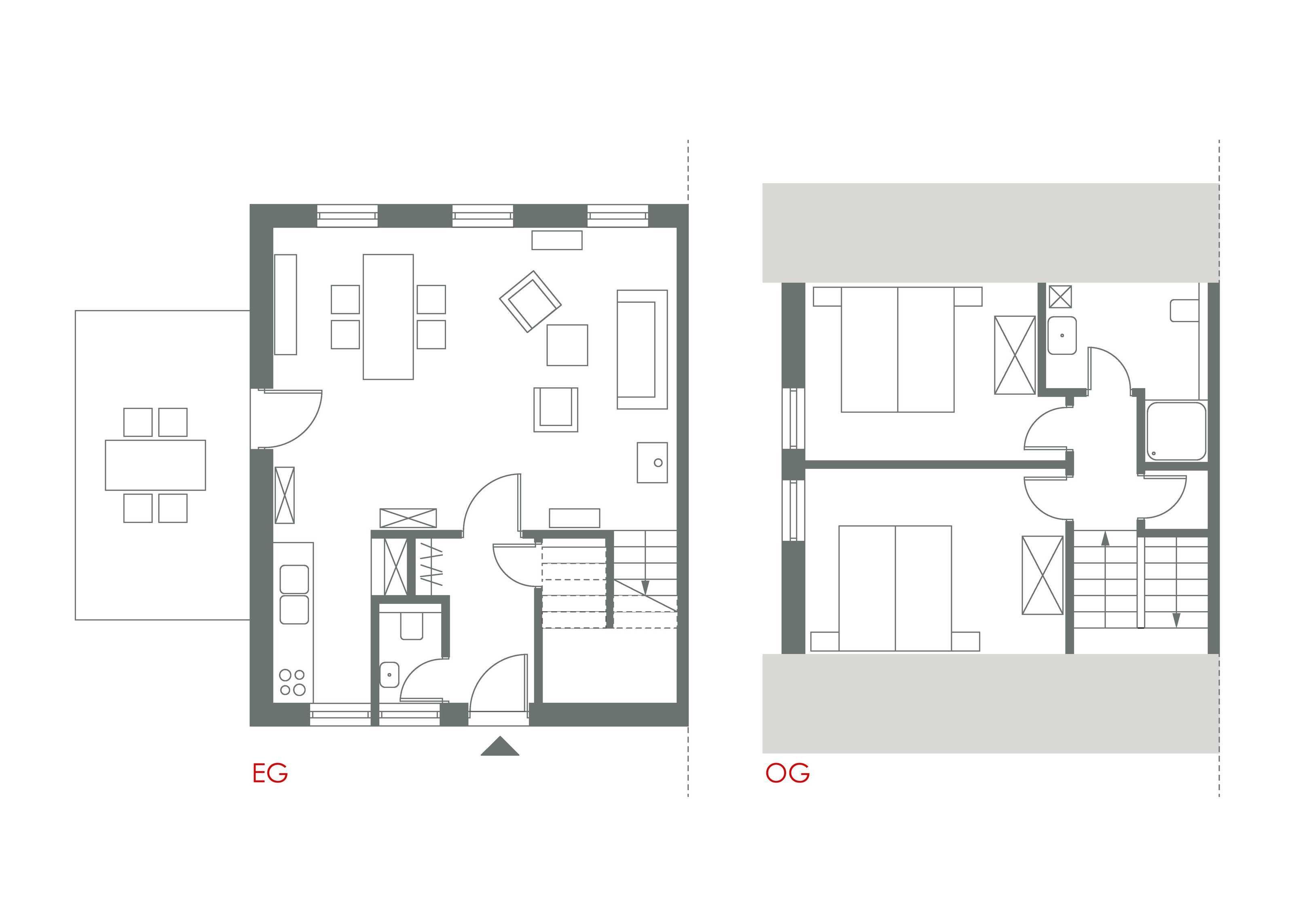 Im OG : 2 Schlafzimmer mit Doppelbett (180x200), Duschbad mit WC.