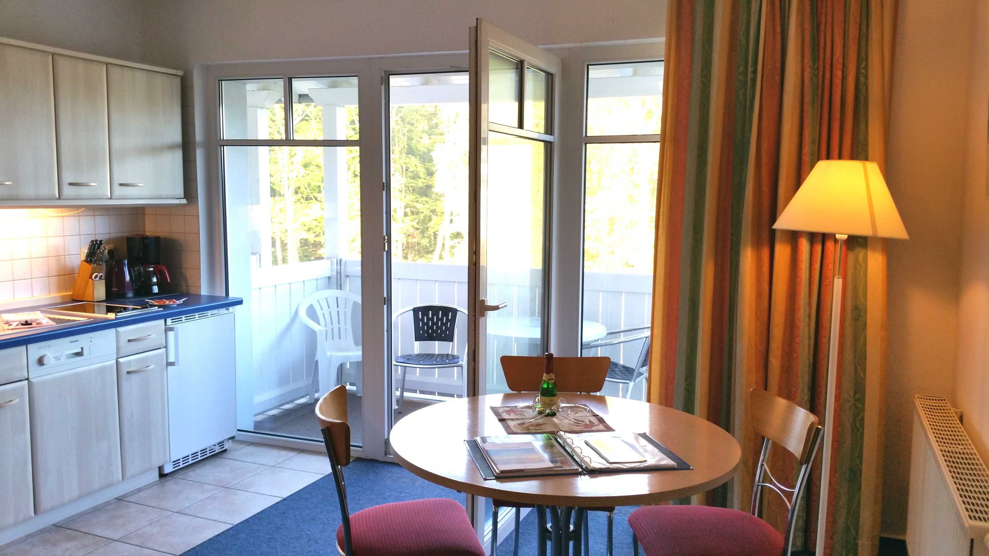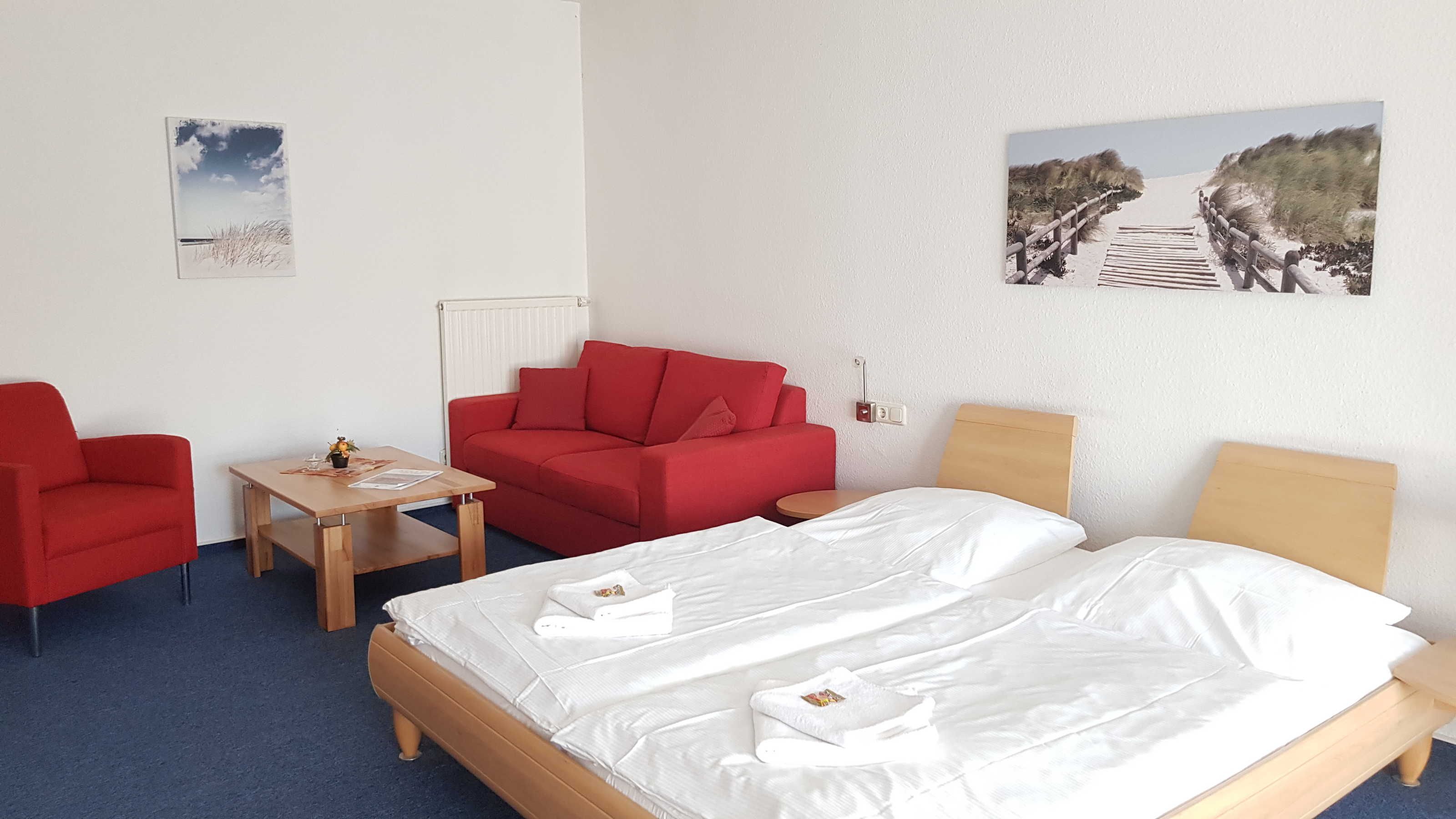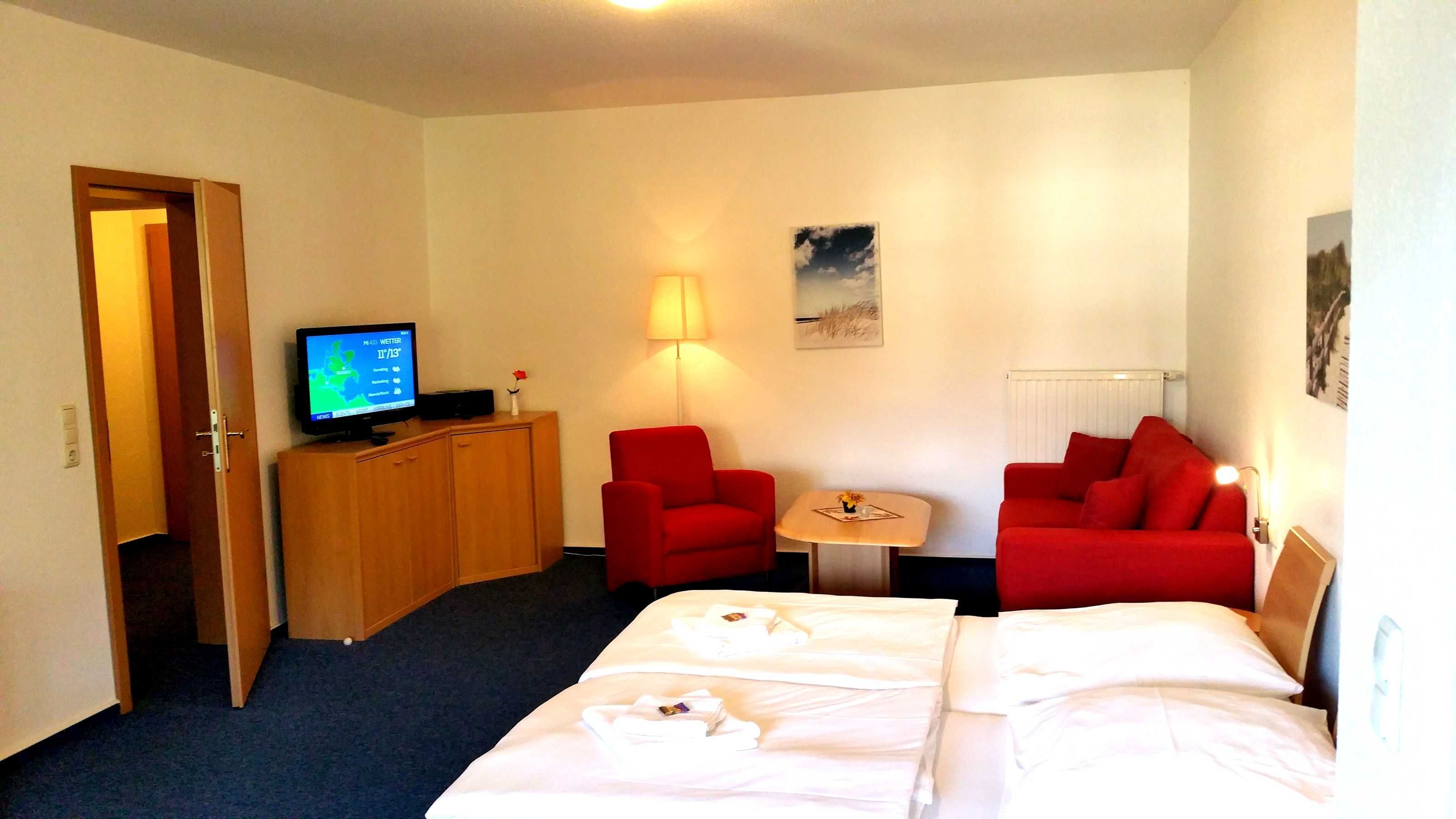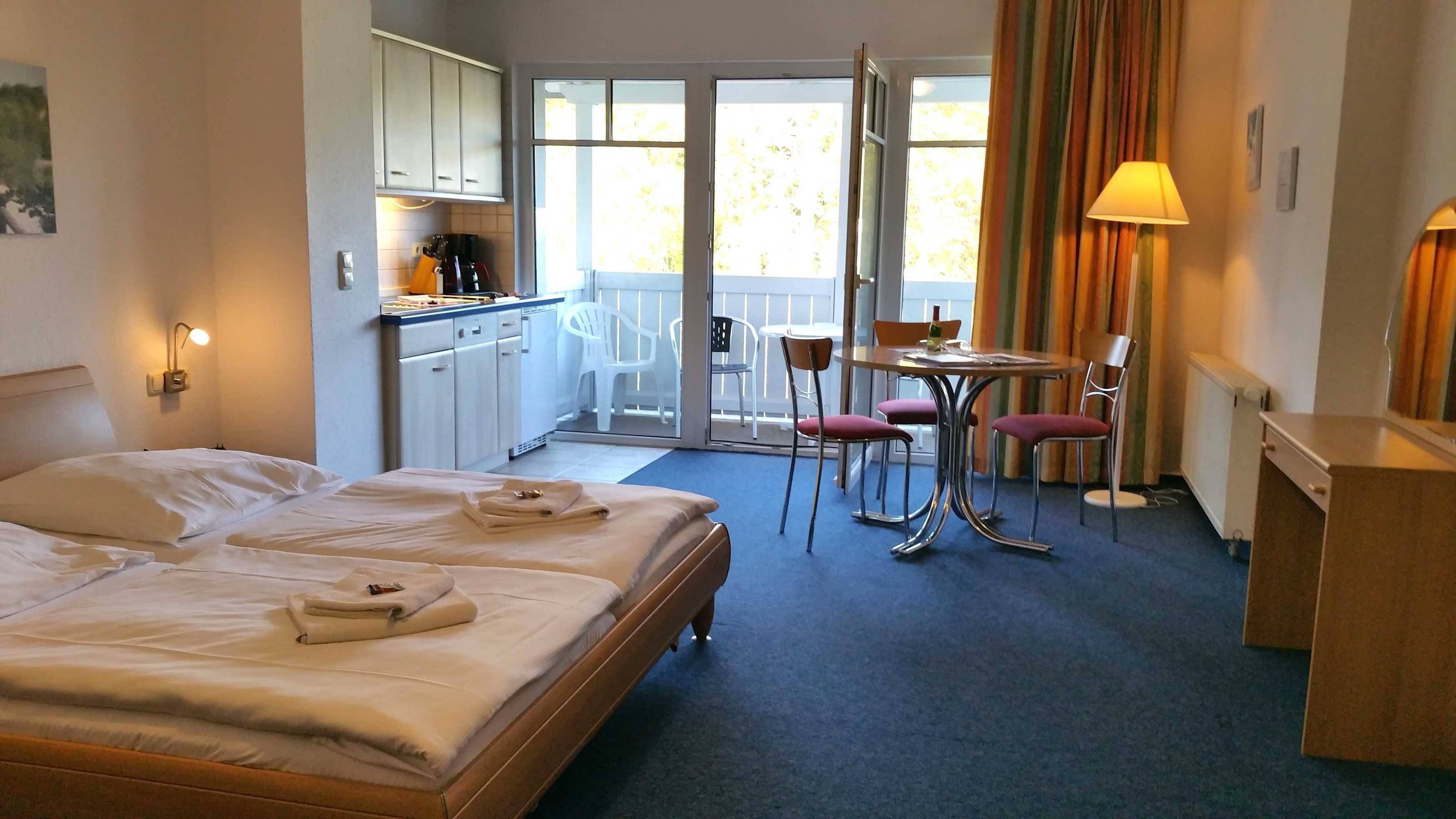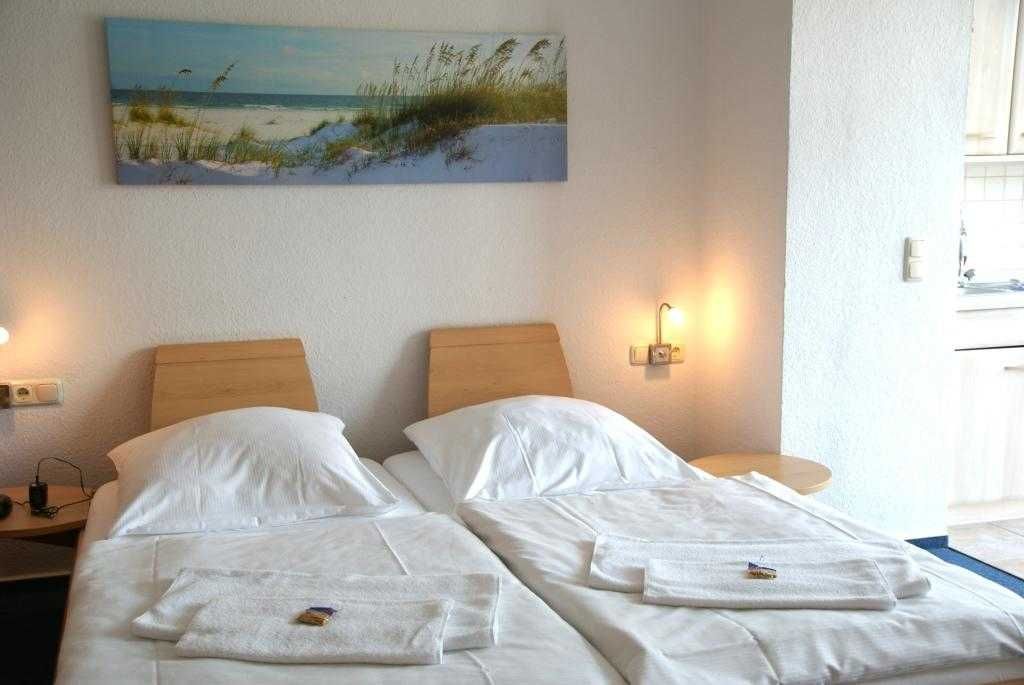 Das 1 Raumappartement hat einen Wohn-Schlafraum mit Doppelbett für 2 Pers.und einer ausziehbaren Couch, Kabel-TV,CD Stereoanlage ,Esstisch, gut ausgestattete Küchenzeile mit Geschirrspüler, Kaffeemaschine, Toaster und Microwelle. Babybett ( ohne Wäsche )und Hochstuhl für die kleinen stellen wir für 10 Euro zur Verfügung ( bitte vorbestellen ) .