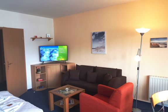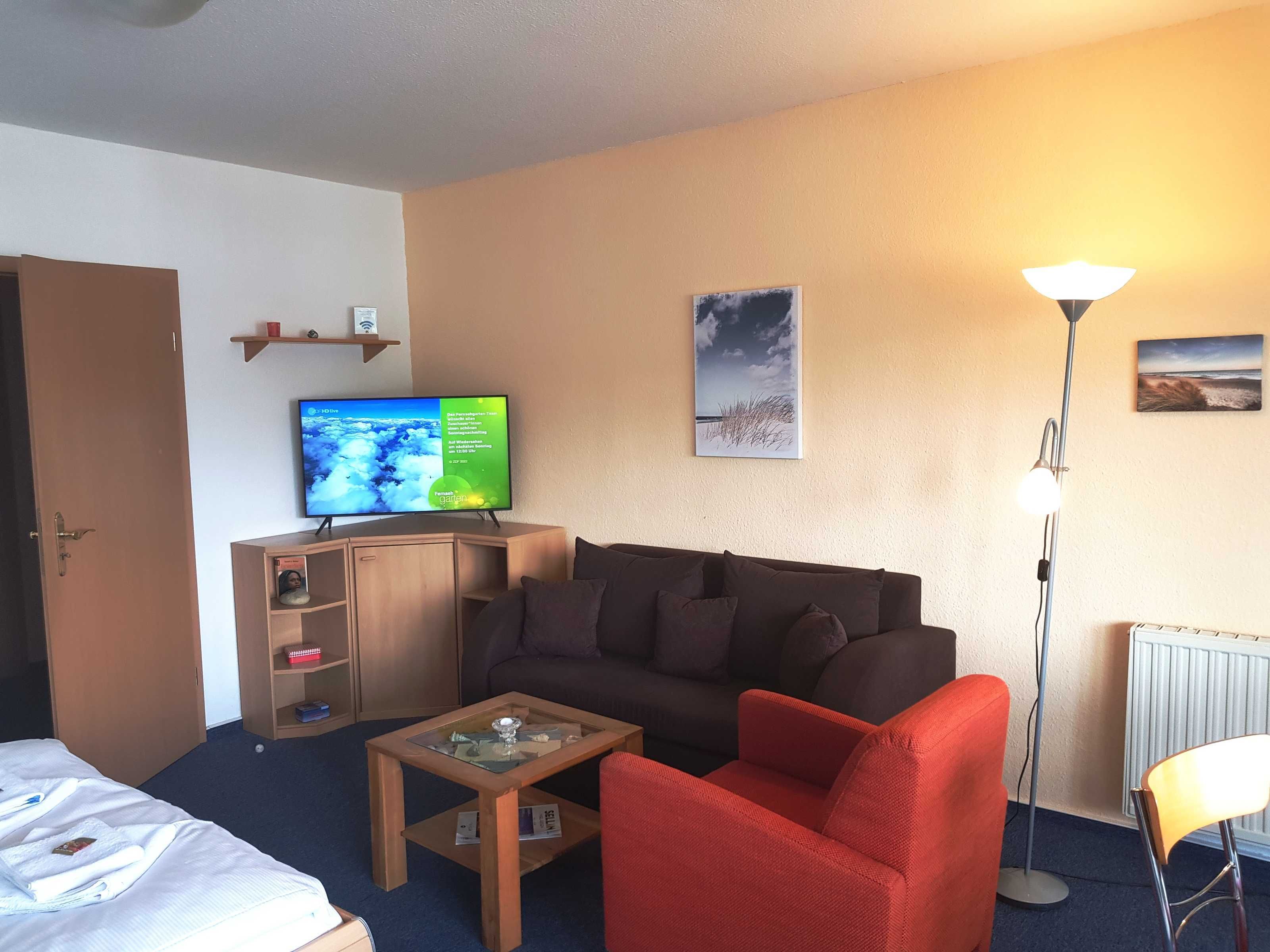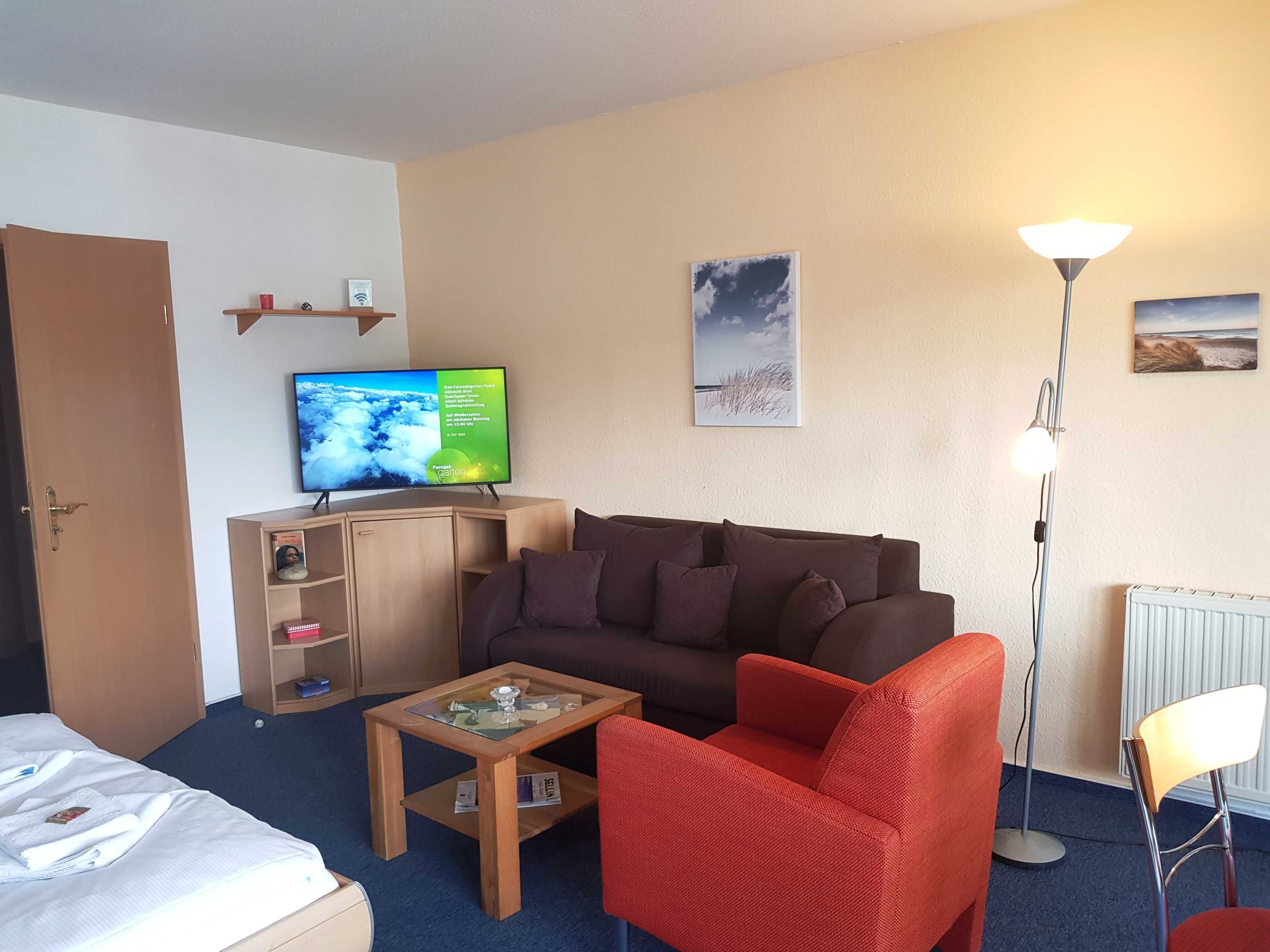 Das 1 Raum Appartement mit Wohn-Schlafraum und Doppelbett für 2 Personen , Esstisch, Kabel-TV,CD Stereoanlage , gut ausgestattete Küchenzeile mit Geschirrspüler, Kaffeemaschine, Toaster und Microwelle. Babybett ( ohne Wäsche )und Hochstuhl für die kleinen stellen wir für10 Euro zur verfügung ( bitte vorbestellen ) .