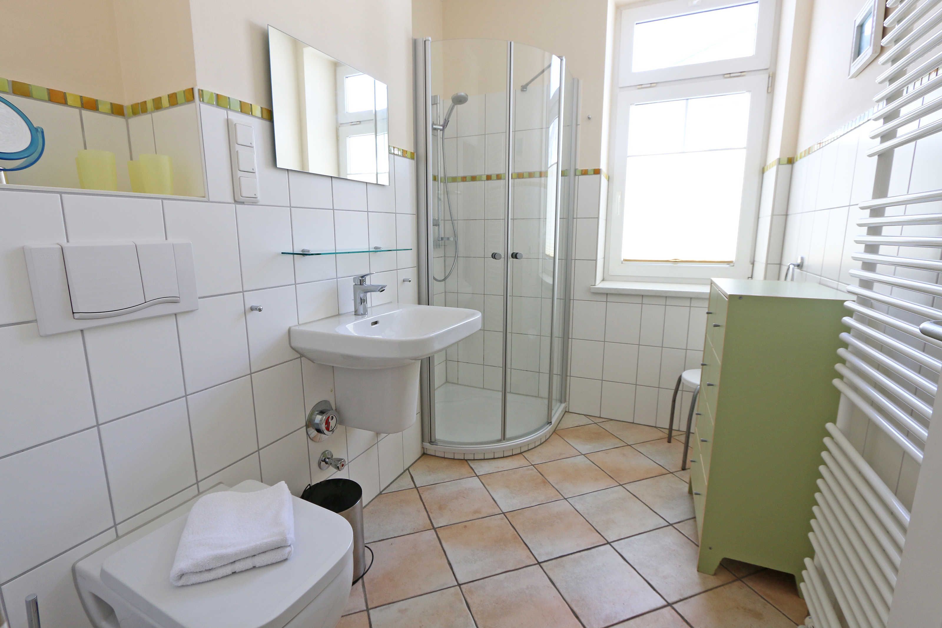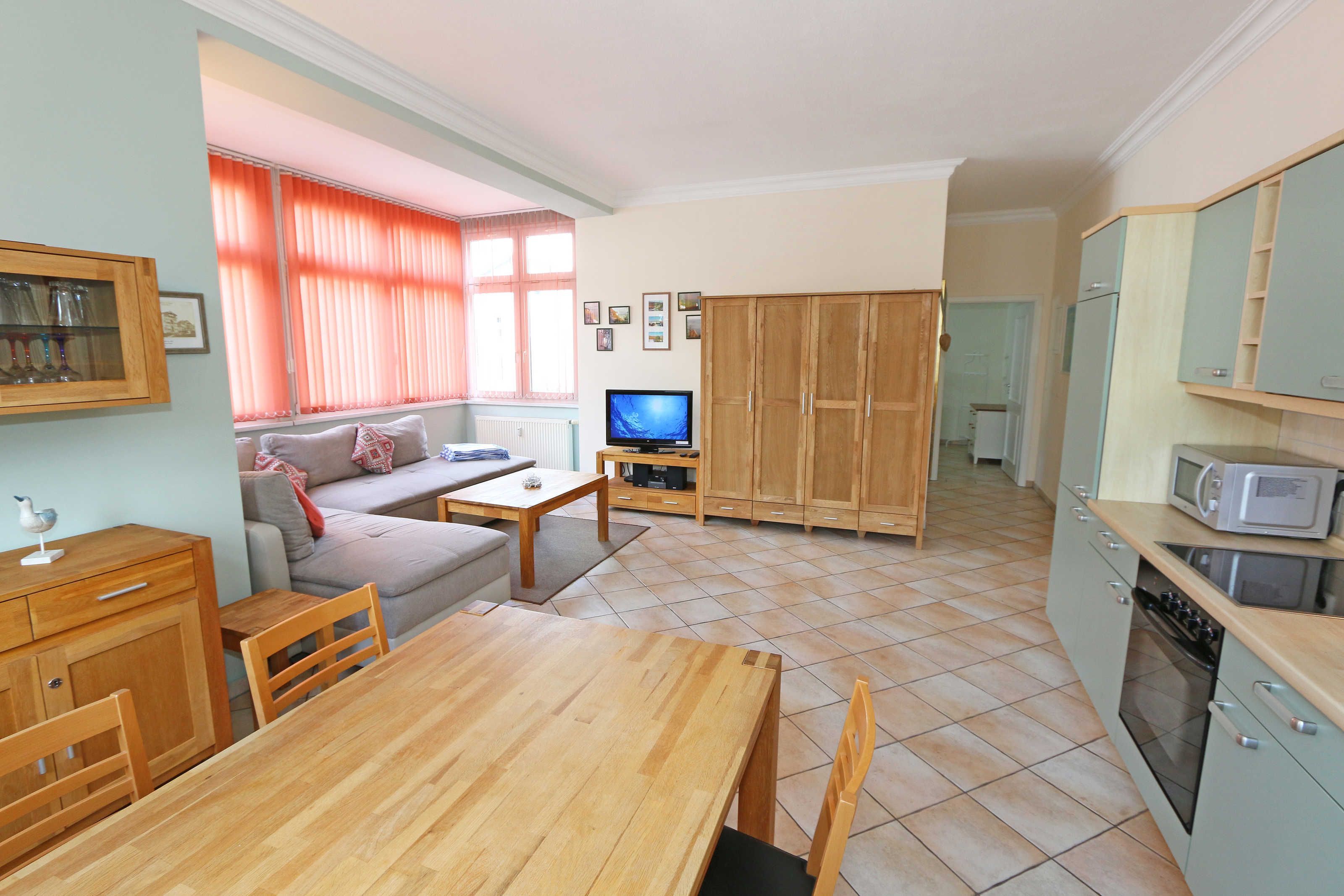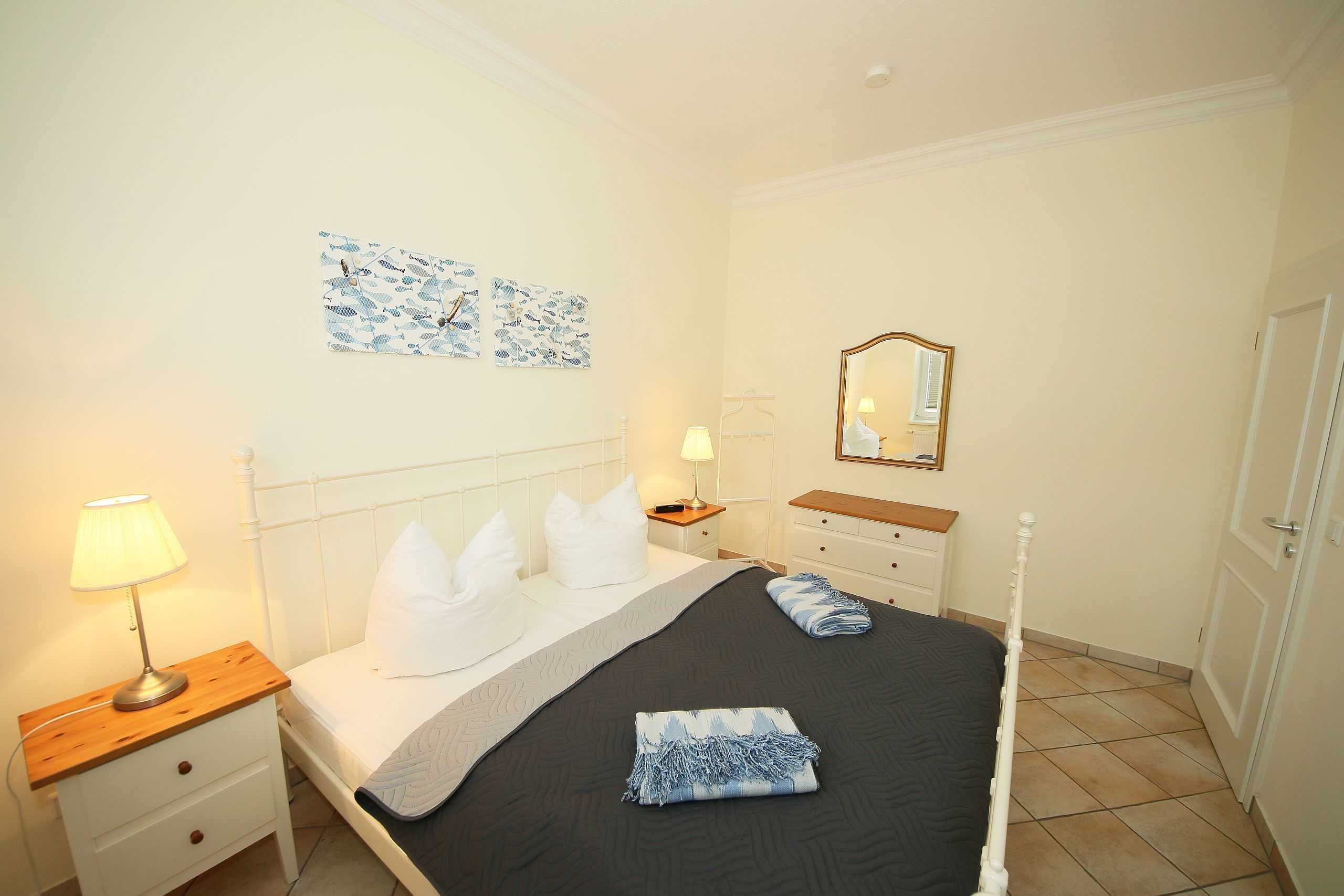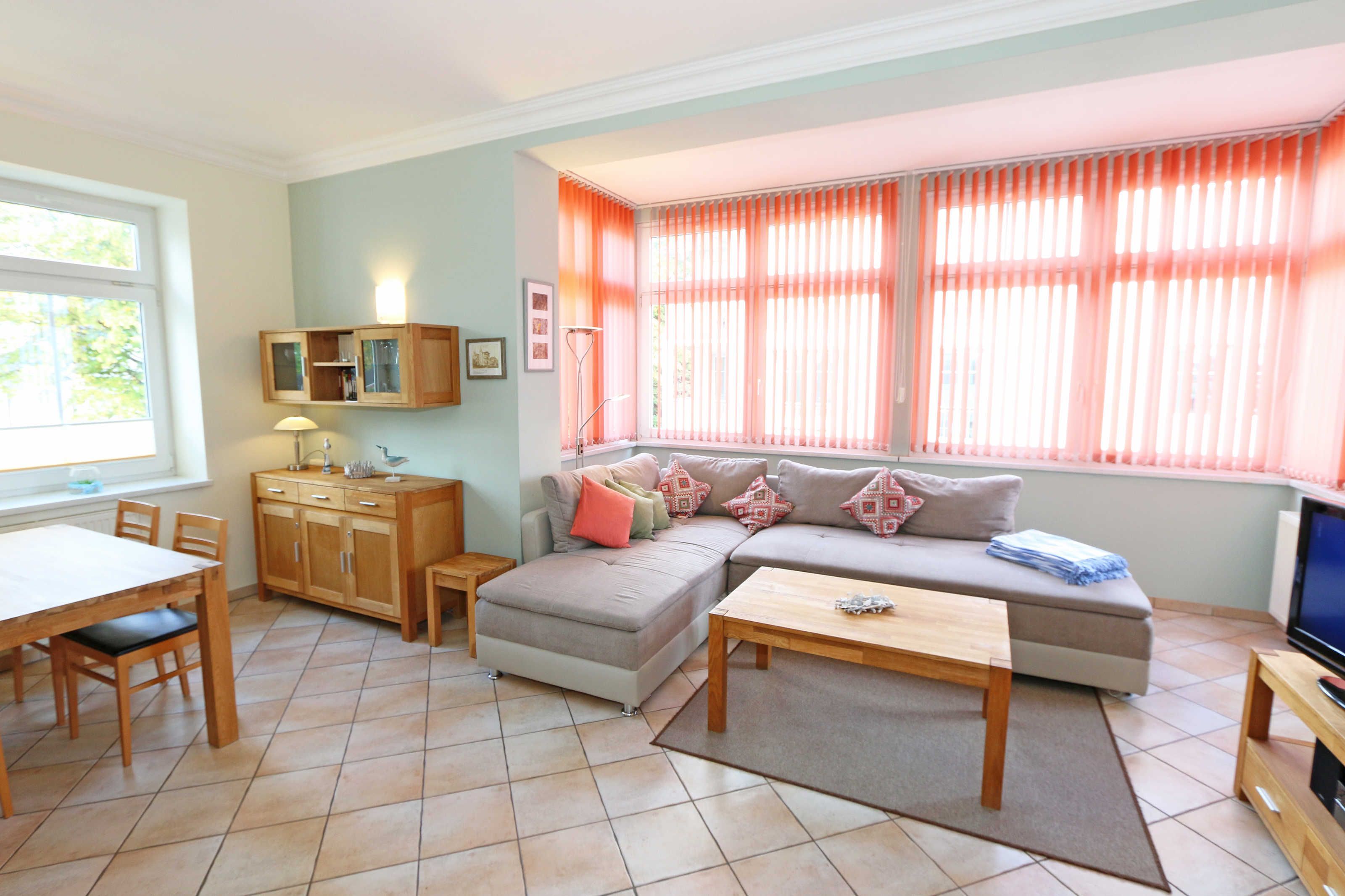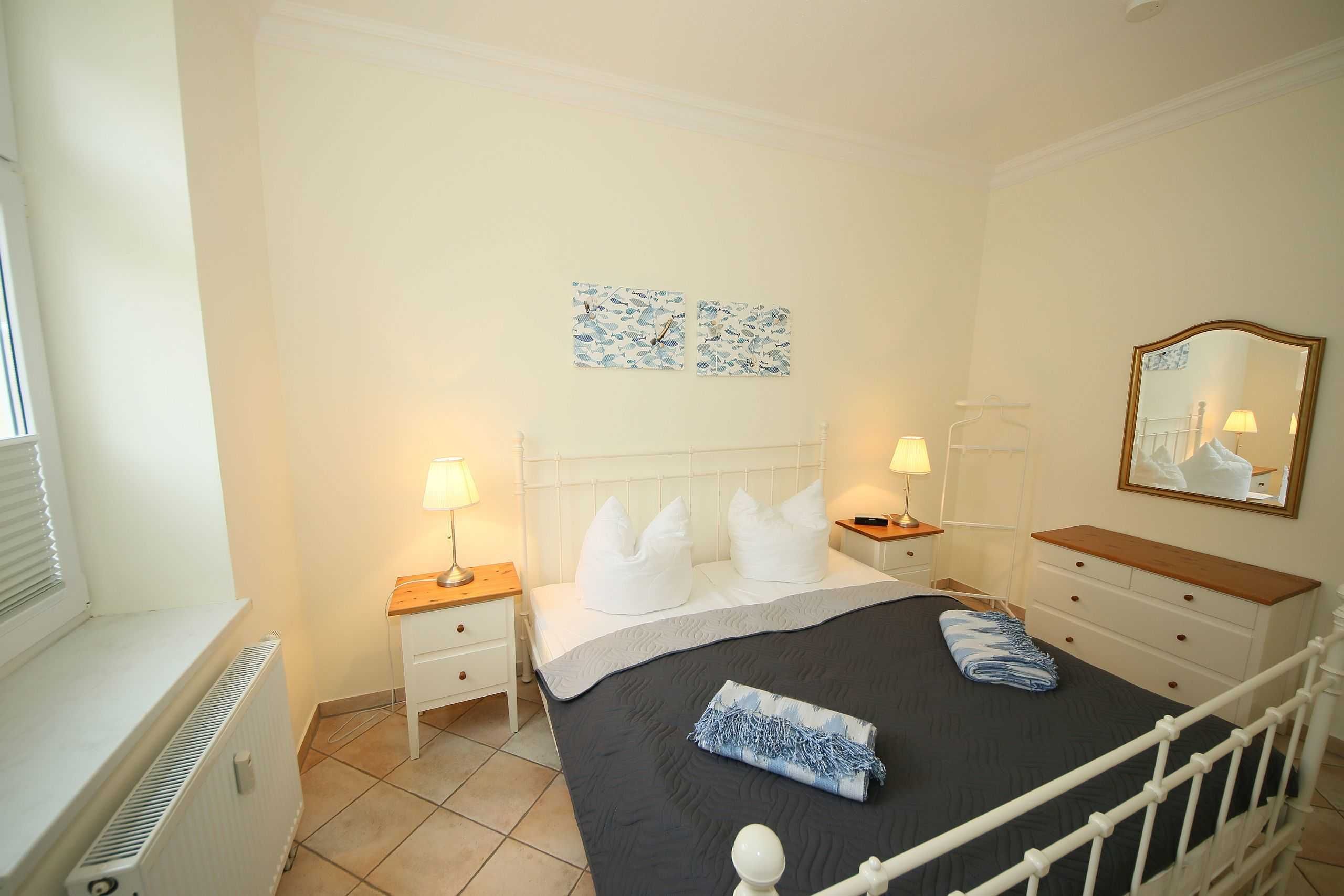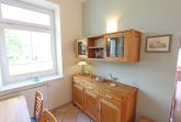Die 2-Raumferienwohnung (Nichtraucher) liegt im 1. Obergeschoss und bietet mit Ihren ca. 50 qm genug Platz für 2-4 Personen. Durch die vollverglaste Veranda ist der kombinierte Wohn/Koch- und Essbereich sehr hell und freundlich. Die integrierte Küchenzeile mit Cerankochfeld, Backofen, Geschirrspüler, Mikrowelle, Kühlschrank, Gefrierfach, Kaffeemaschine, Wasserkocher, Toaster und diverse Küchenutensilien werden durch einen Essplatz für 4 Personen komplettiert. Der angrenzende und offene Wohnbereich besteht aus einem Sofa, welches zu einem Doppelbett (1,60m x 2,00m) ausgezogen werden kann, einem Sessel, Couchtisch und kleinem Beistelltisch. Abgerundet wird der Wohnbereich mit einem Flachbild-TV, DVD-Player und Mini-Stereo-Anlage mit USB-Anschluss. Auch auf einen Internetanschluss (WLAN) müssen Sie nicht im Urlaub verzichten. Ein Kleiderschrank bietet genügend Platz für Ihre Bekleidung. Das Schlafzimmer verfügt über ein Doppelbett (1,80m x 2,00m), Nachttischablagen, einer geräumigen Kommode und einem Wandspiegel. Das Tageslichtbad wird durch eine ebenerdige Dusche, Waschplatz, Handtuchtrockner, WC und Fön abgerundet. Alle Räumlichkeiten sind mit Raff-Plissees bzw. Lamellenstores versehen. Im Keller des Hauses können Sie eine Waschmaschine sowie ein Trockner gegen Gebühr nutzen. 1 Haustier (keine Katzen) ist gegen eine Gebühr ein gern gesehener Gast. Ein PKW-Stellplatz Nr. 04 befindet sich direkt hinter dem Haus. Ihre mitgebrachten Fahrräder oder auch geliehenen Räder können Sie im Fahrradschuppen verschließen. Die Erstausstattung eines Wäschepaketes (komplette Bettwäsche, 1 Duschhandtuch, 2 kleine Handtücher) können Sie bis 14 Tage vor Anreise gegen einen Aufpreis dazu buchen oder durch eigene ergänzen. Ab 2 gebuchten Paketen erhalten Sie einmalig 1 Geschirrhandtuch und 1 Duschvorleger hinzu.